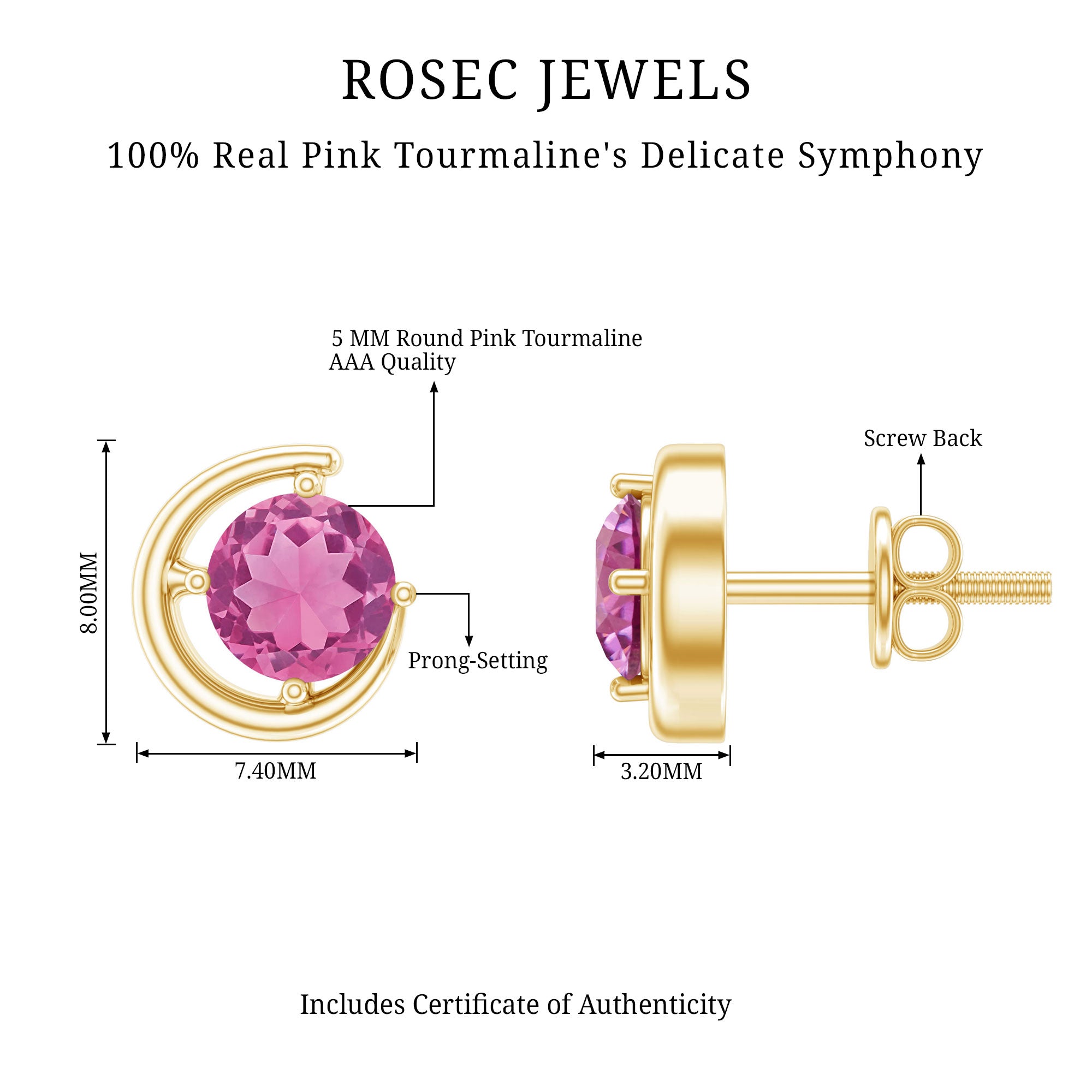 This Solitaire Earring is studded with a Round Shape Pink Tourmaline as Solitaire in Prong Setting. This Stud Earring is an ideal piece of Fine Jewelry for simple and subtle looks.