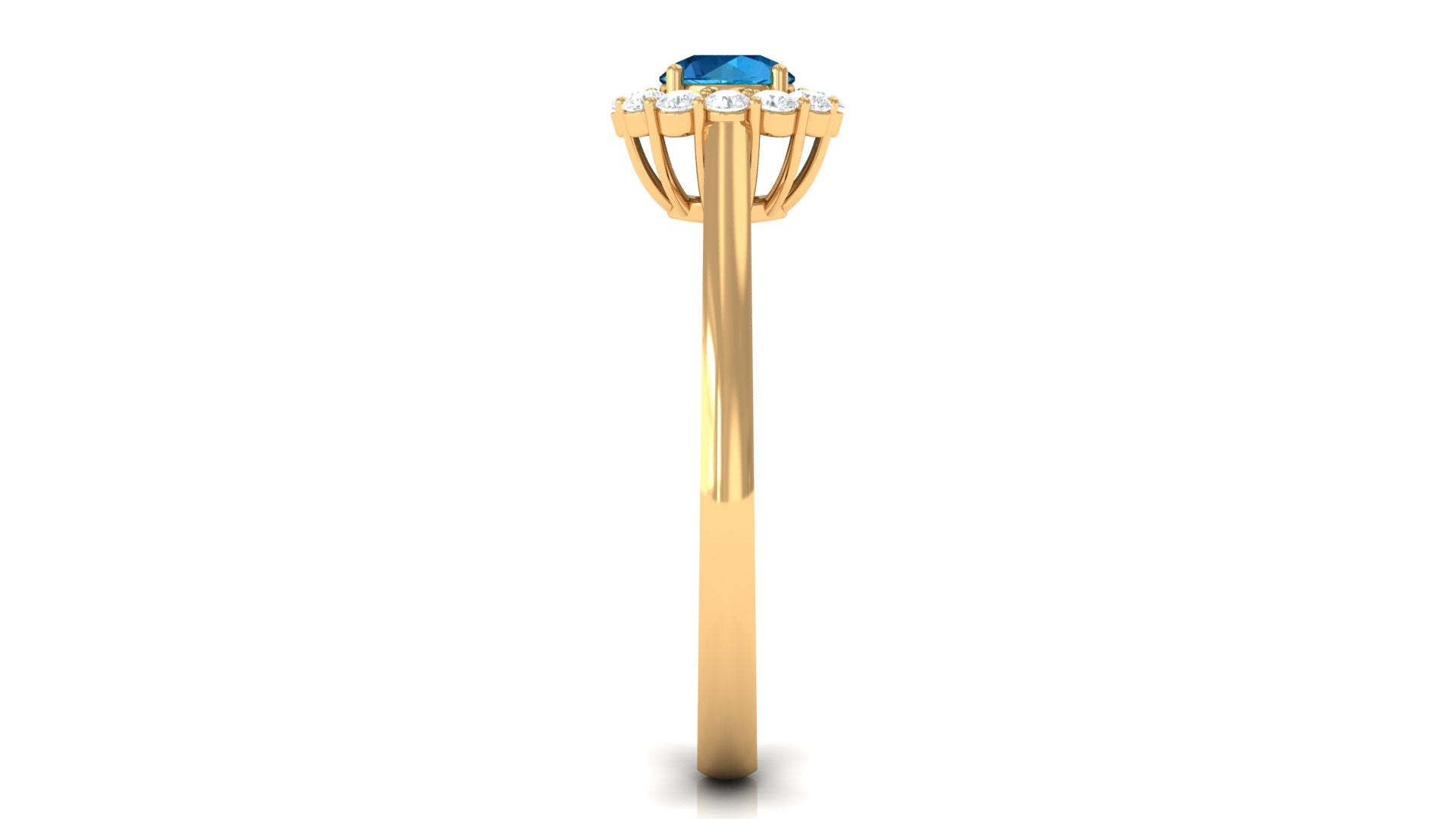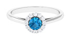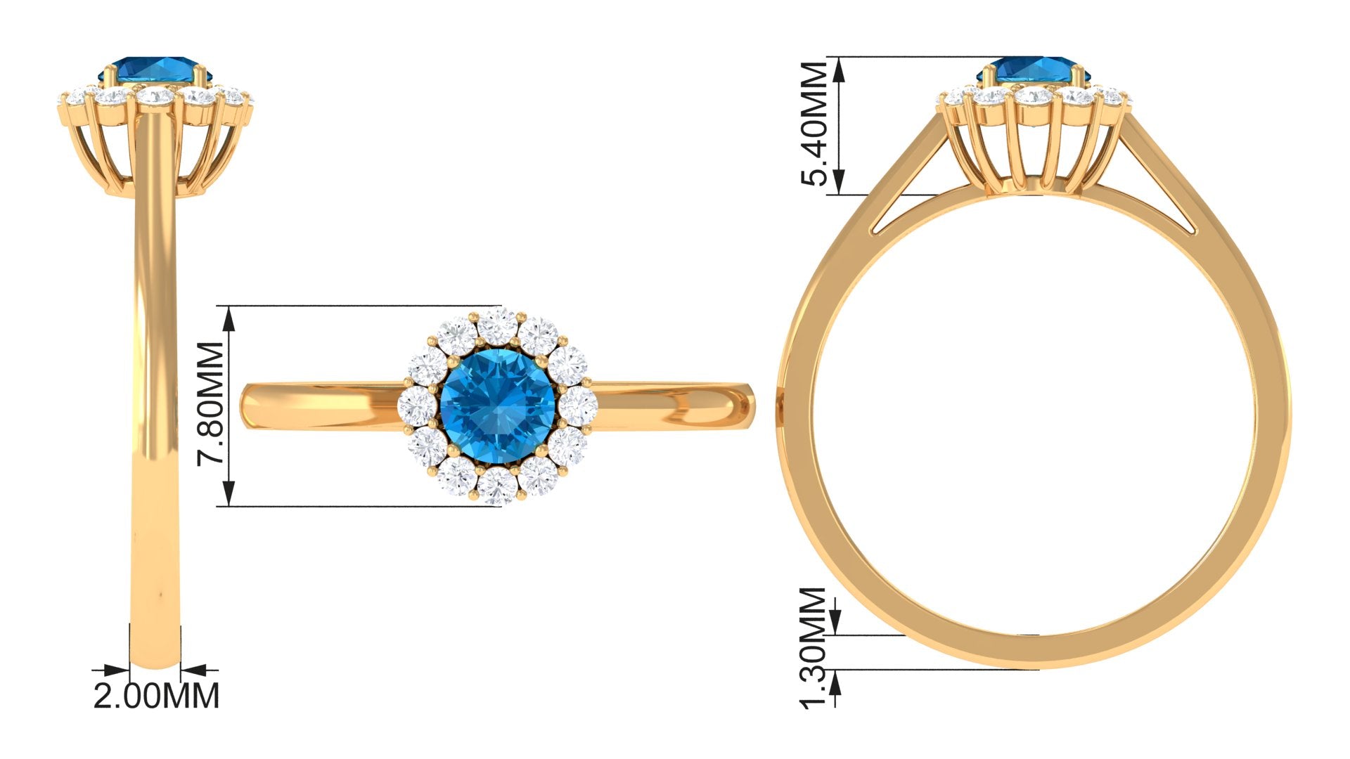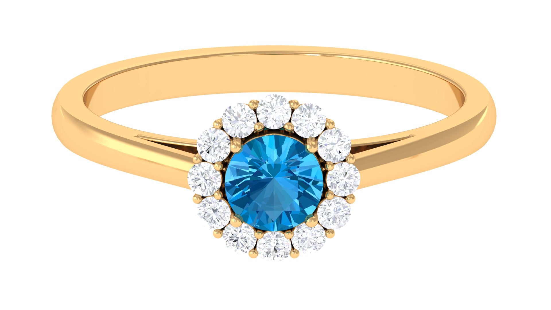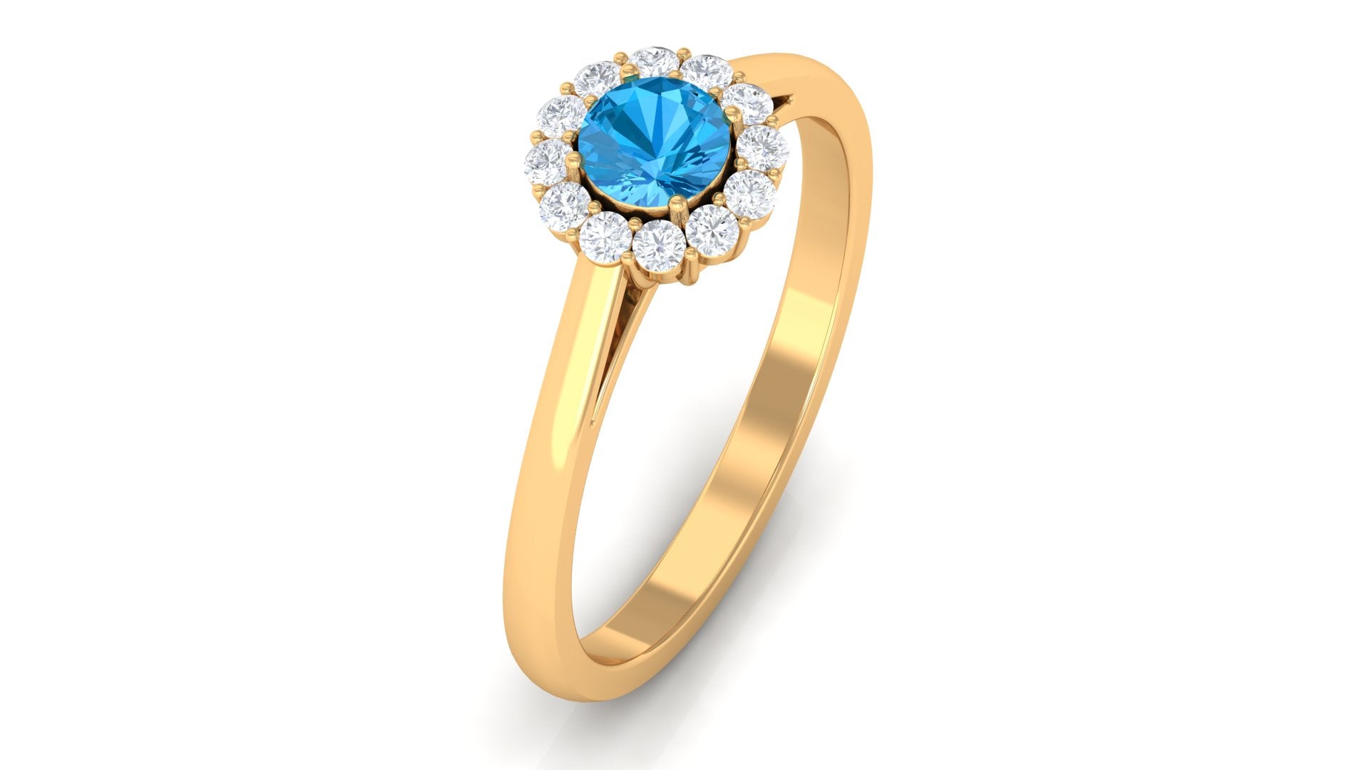 Enhance your beauty with Floating Halo Engagement Ring is embellished with Round Shape Swiss Blue Topaz Set as a solitaire in a prong setting and Round Shape Diamond in a floating Halo. This Engagement Ring is composed of solid gold.