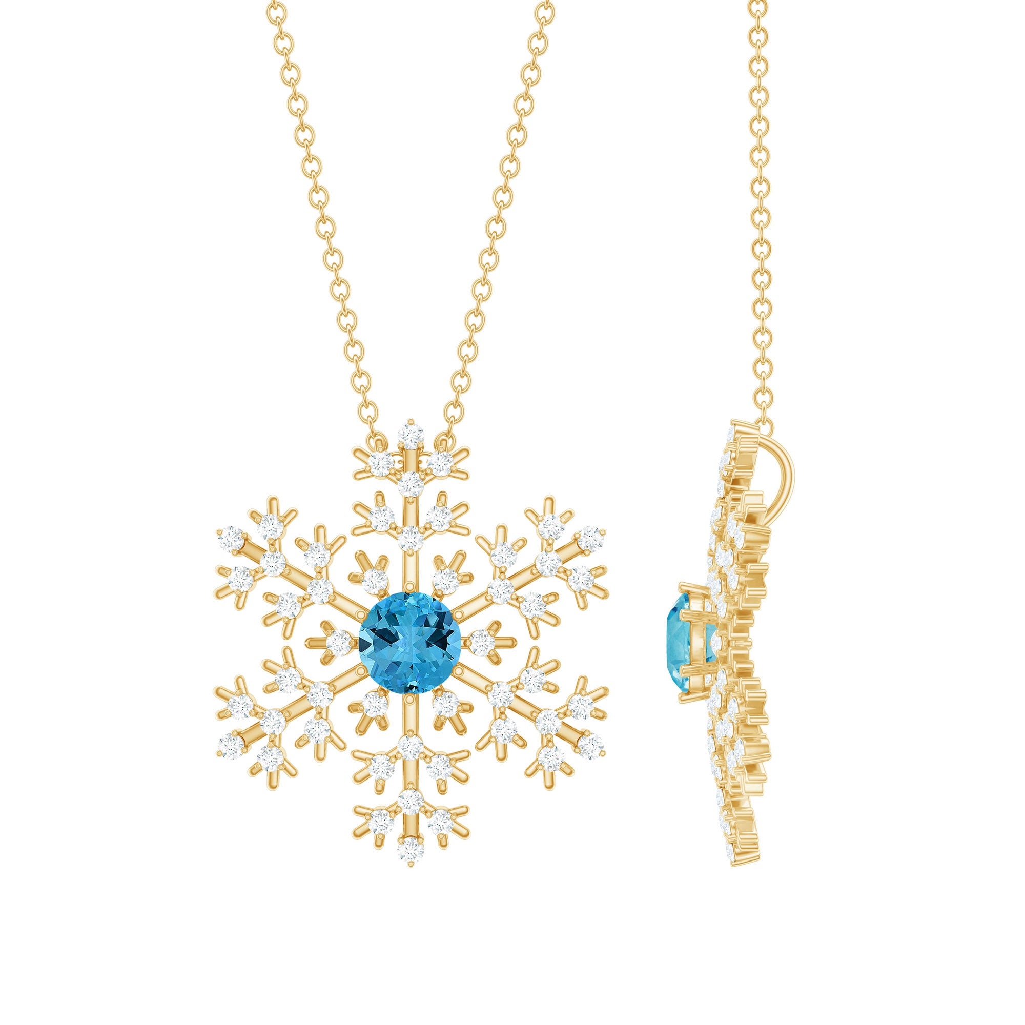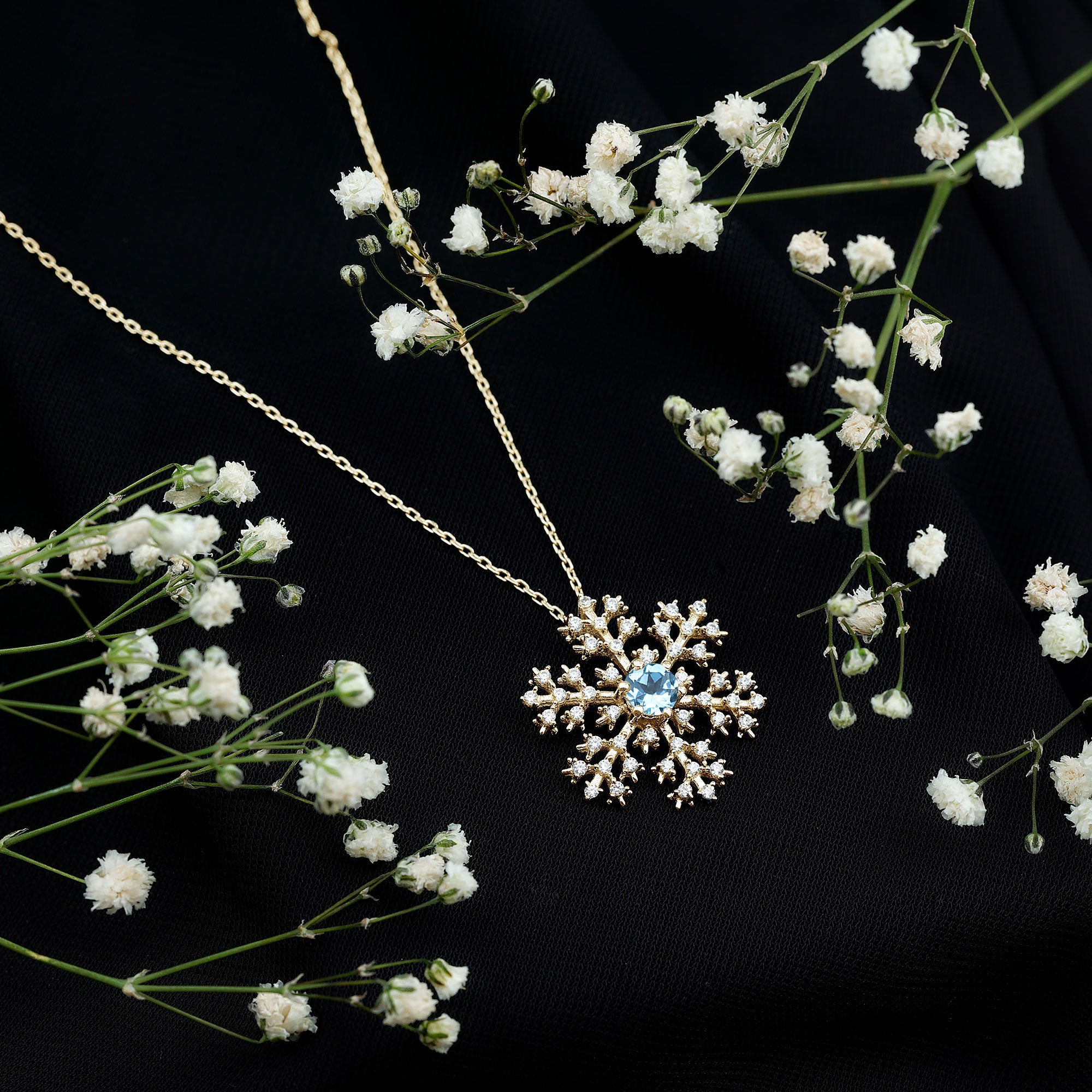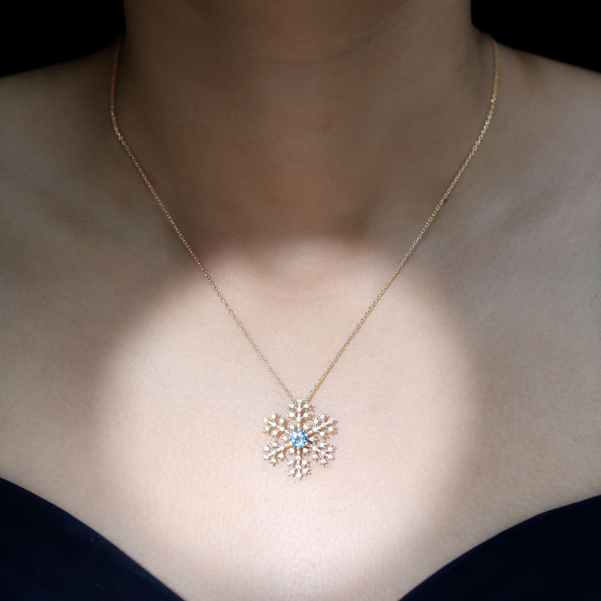 Add a touch of sparkle and glamour to your evening with our charming Snowflake Pendant Necklace, an elegant jewelry accessory that is sure to complete your look. Crafted from Solid Gold, this exquisite Scatter Snowflake Pendant is adorned with Round Shape Swiss Blue Topaz and Diamond stones, creating a dazzling and eye-catching effect that will turn heads and make you feel truly special. Whether youre dressing up for a special occasion or simply looking for a way to add some glamour to your everyday wear, this precious pendant is the perfect choice. Enhance your jewelry collection with this timeless and beautiful keepsake that will be treasured for years to come.