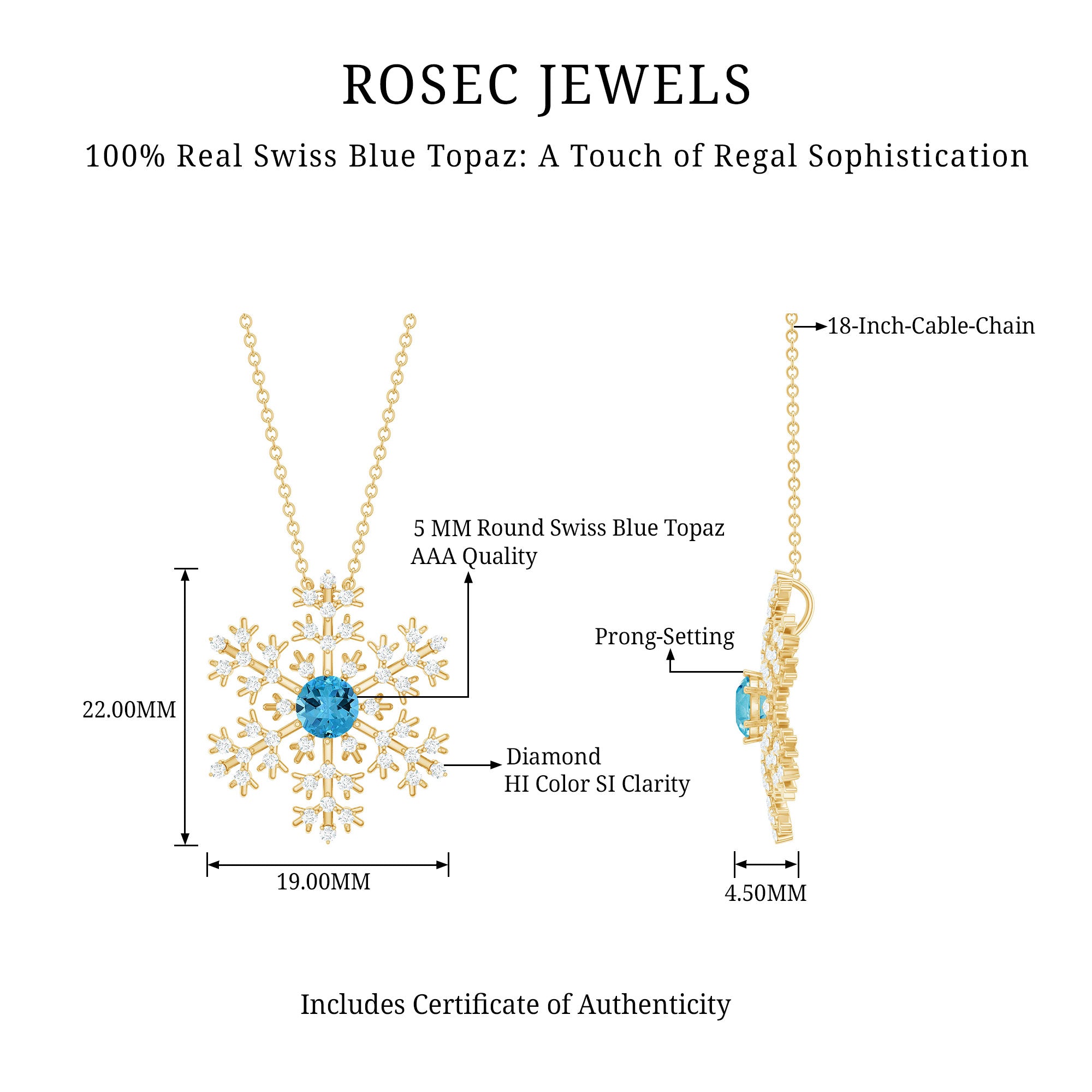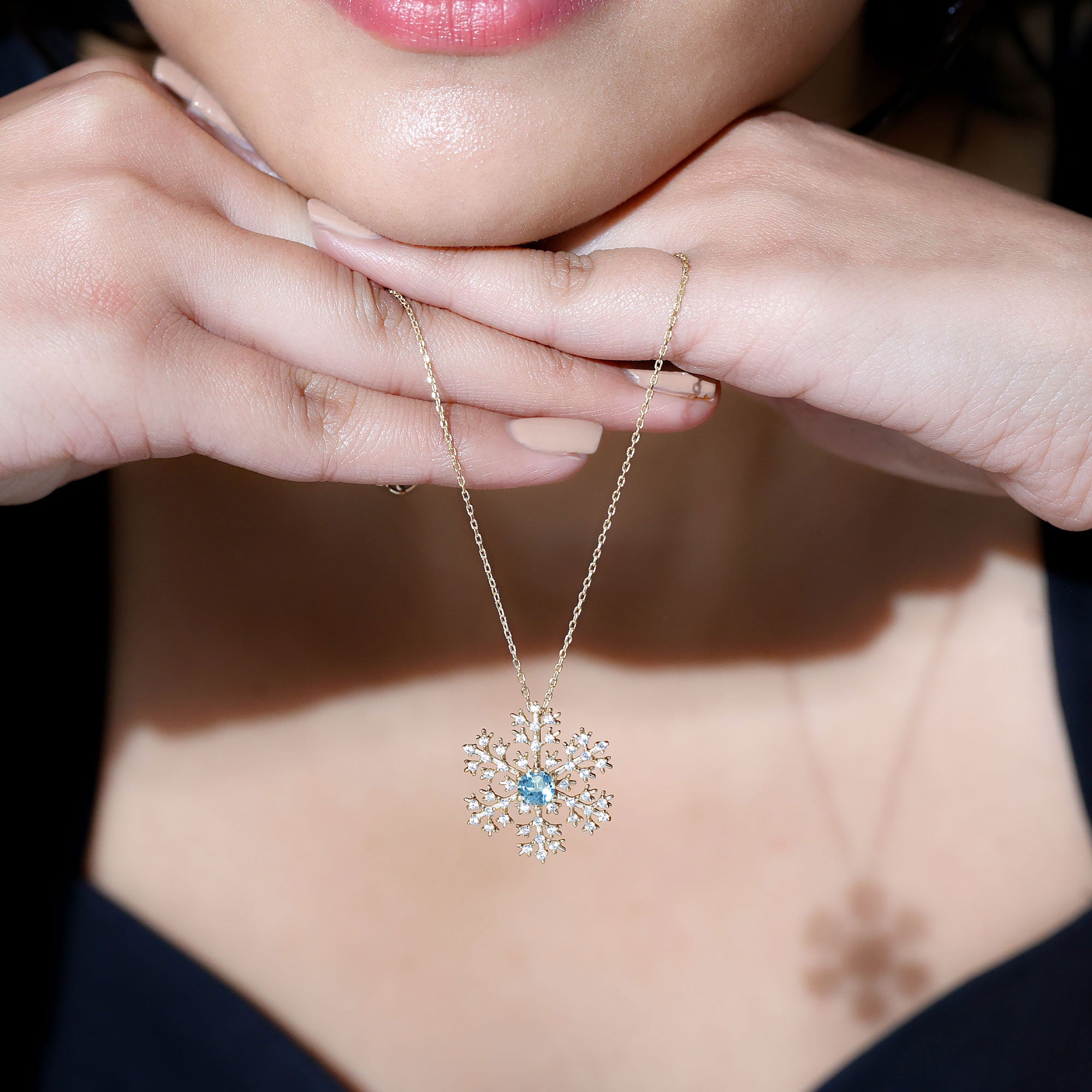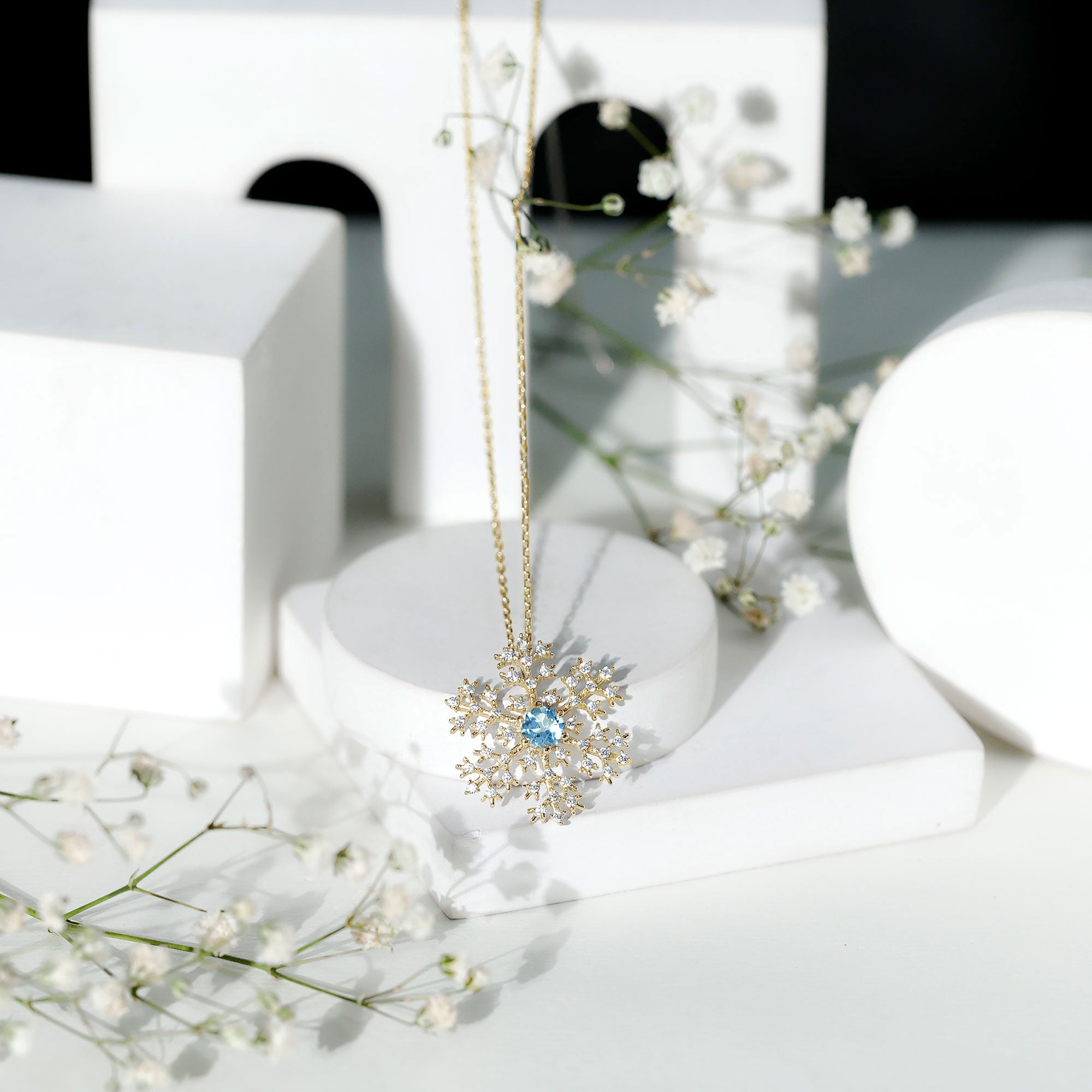 Add a touch of sparkle and glamour to your evening with our charming Snowflake Pendant Necklace, an elegant jewelry accessory that is sure to complete your look. Crafted from Solid Gold, this exquisite Scatter Snowflake Pendant is adorned with Round Shape Swiss Blue Topaz and Diamond stones, creating a dazzling and eye-catching effect that will turn heads and make you feel truly special. Whether youre dressing up for a special occasion or simply looking for a way to add some glamour to your everyday wear, this precious pendant is the perfect choice. Enhance your jewelry collection with this timeless and beautiful keepsake that will be treasured for years to come.