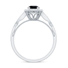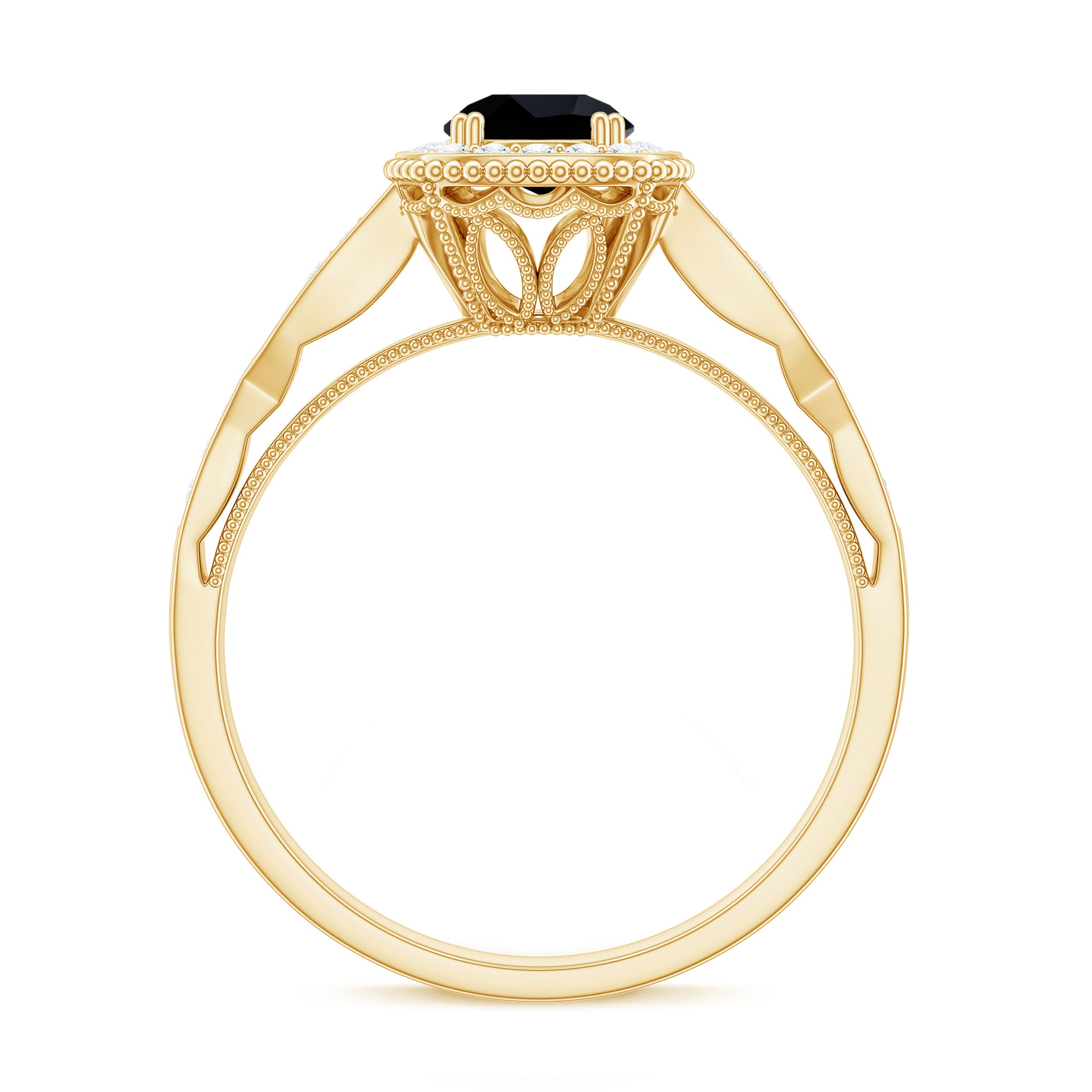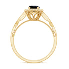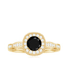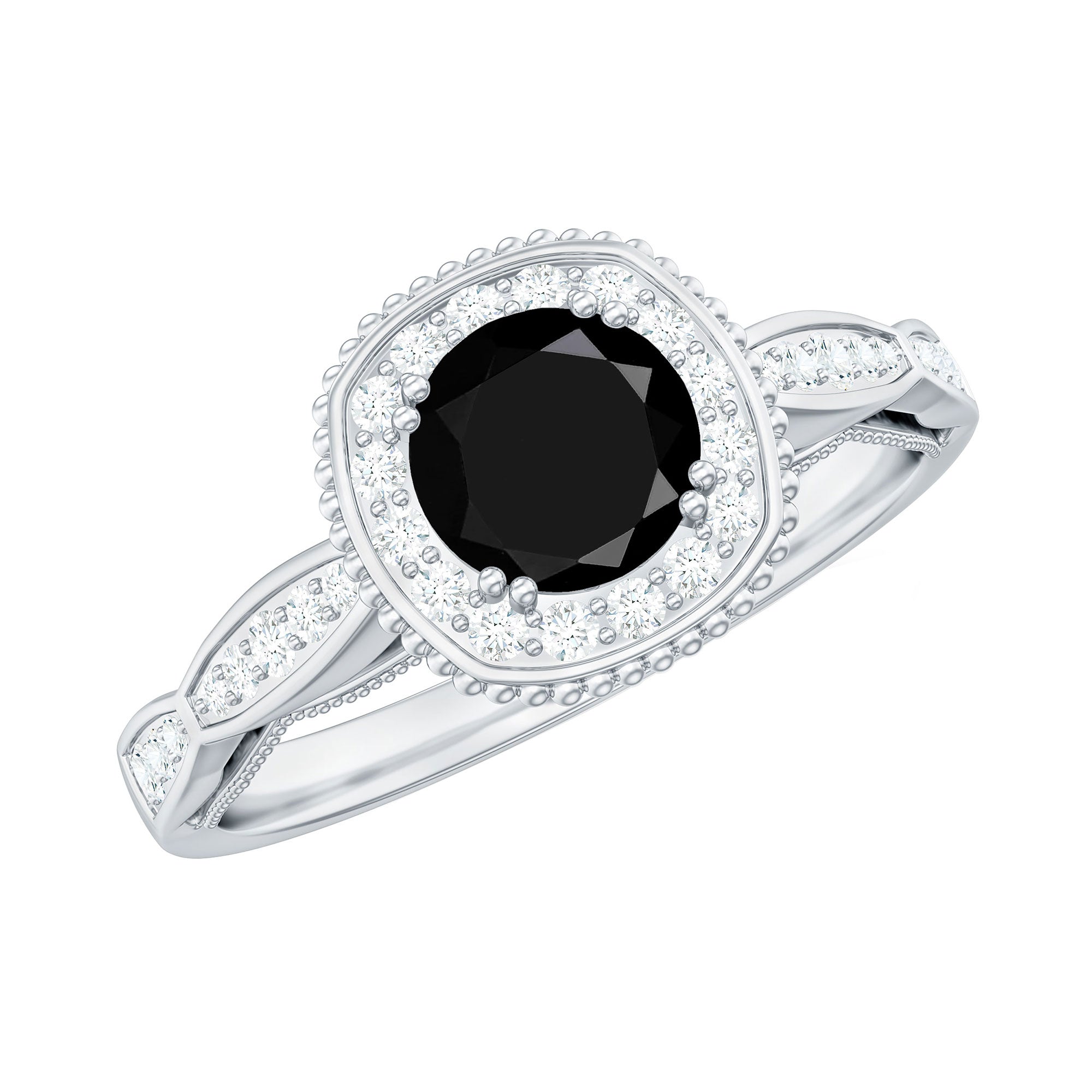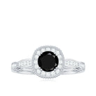 The littering Halo Engagement Ring features delicate Surface Prong Set Diamond Halo that encircle the center Round Shape Black Diamond with a designer shank, and adorn the band with Milgrain Detail. The Antique Design makes this ring light and feminine for a truly special look. Adorn yourself with our perfect black diamond and Diamond Engagement Ring on your big day.