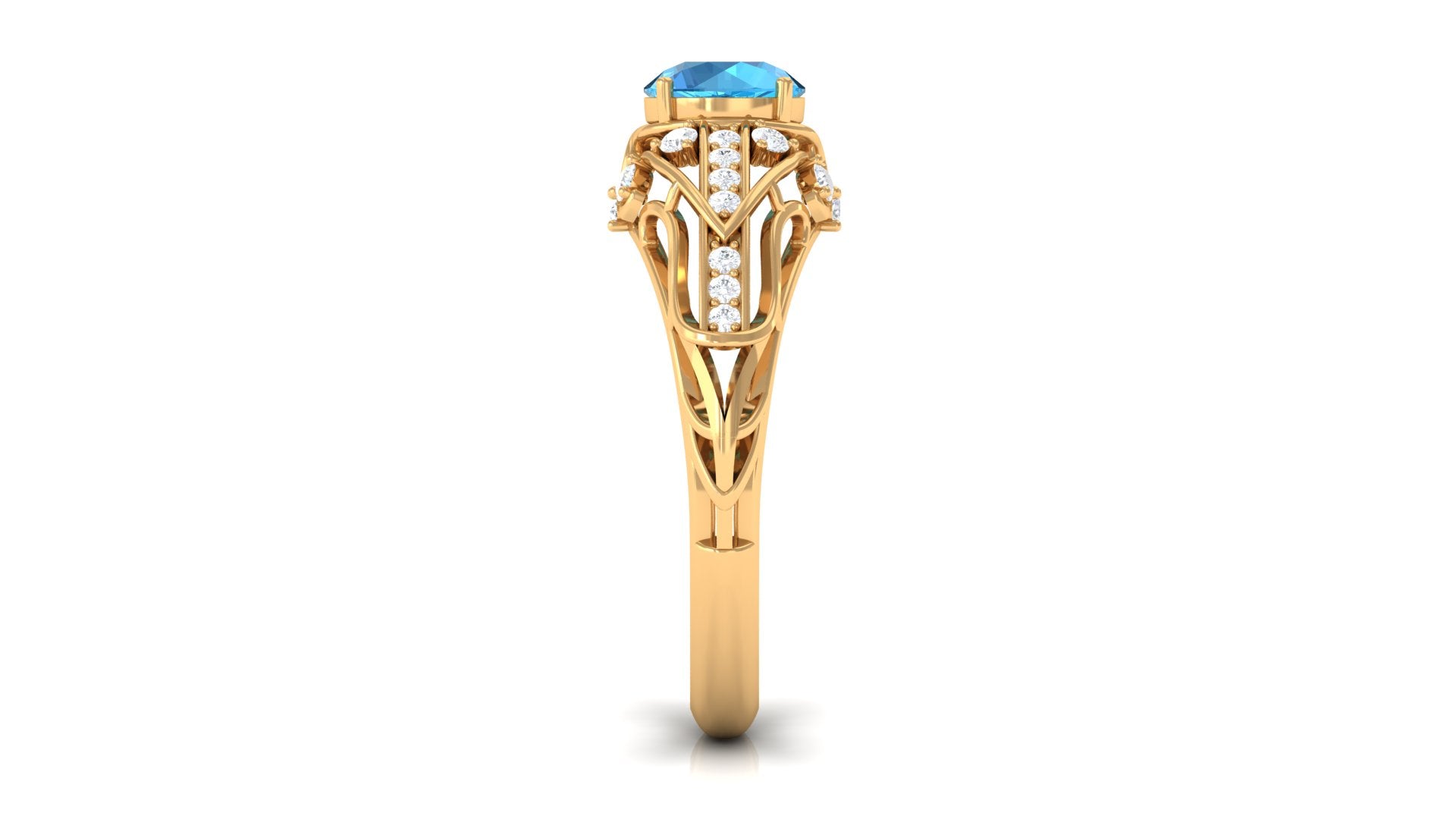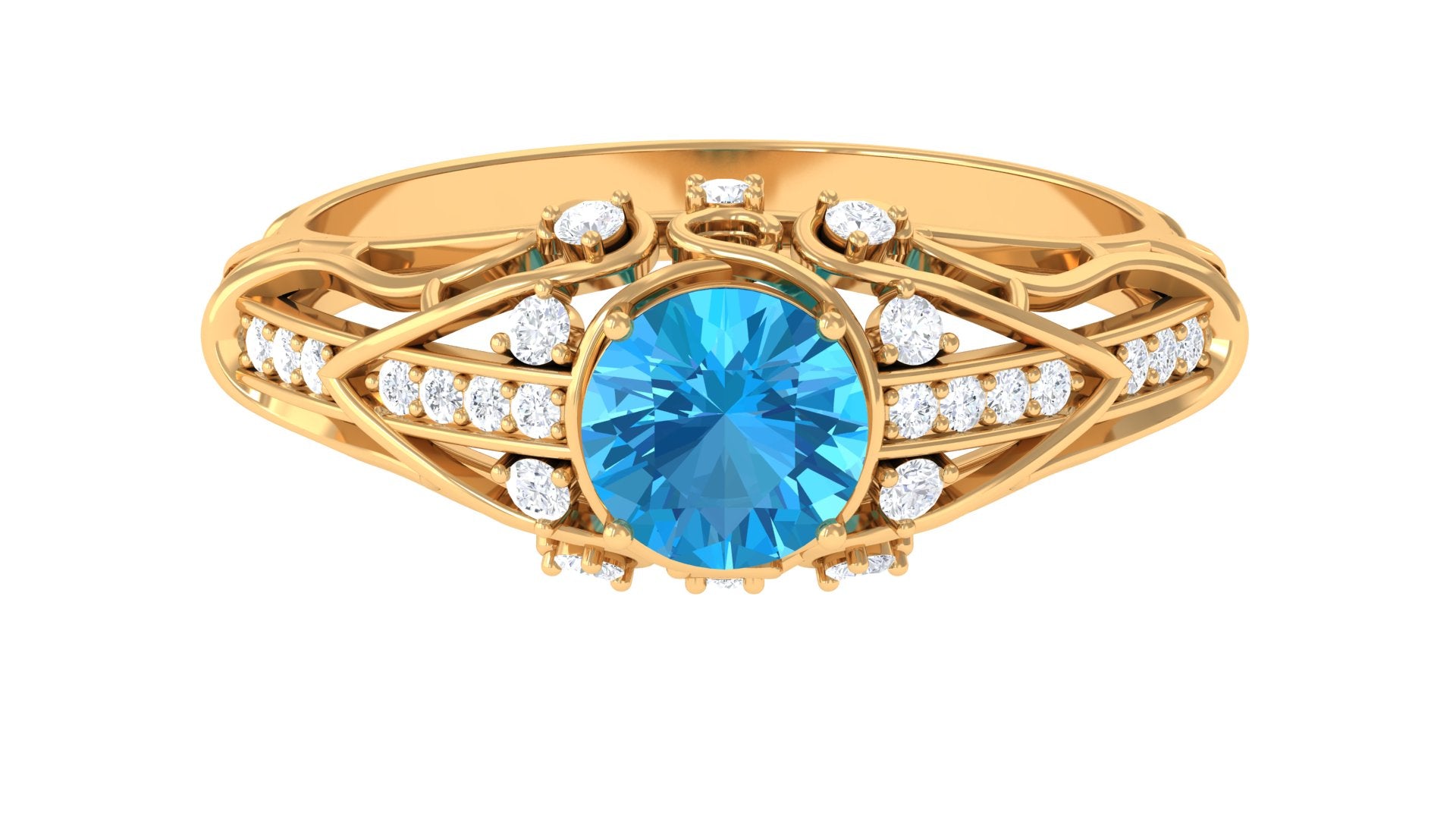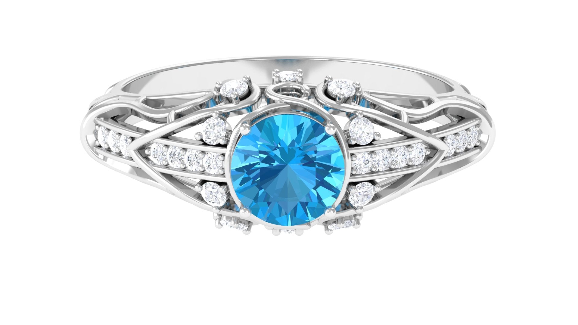 This Vintage Inspired Engagement Ring is a stunning and unique piece of jewelry. The vibrant swiss blue topaz center stone is set in prong setting complemented by sparkling Diamond accents, giving the ring a luxurious and elegant look. Whether youre looking for a timeless engagement ring or a special piece of jewelry to add to your collection, this ring is sure to impress and be treasured for years to come.