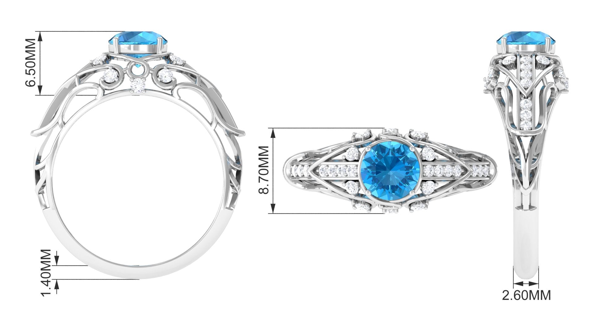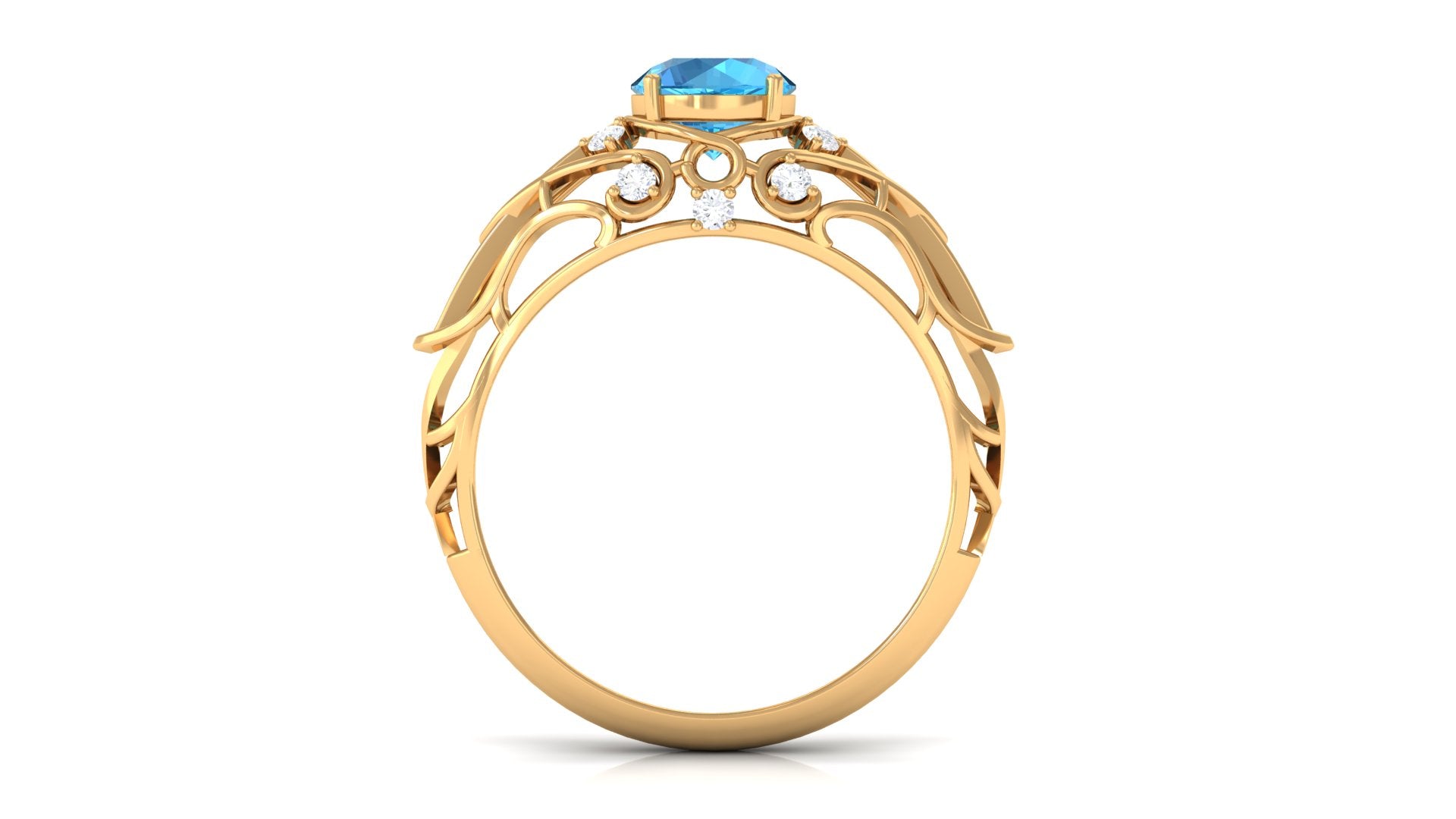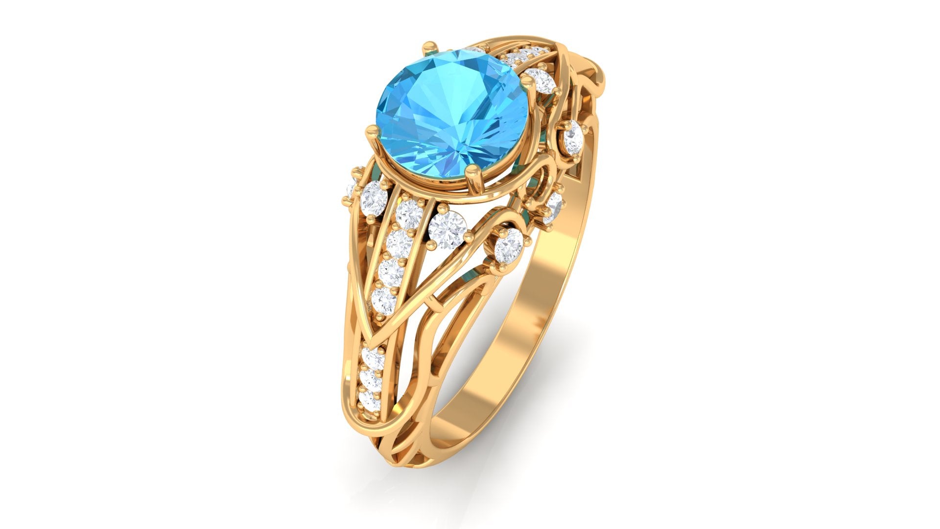 This Vintage Inspired Engagement Ring is a stunning and unique piece of jewelry. The vibrant swiss blue topaz center stone is set in prong setting complemented by sparkling Diamond accents, giving the ring a luxurious and elegant look. Whether youre looking for a timeless engagement ring or a special piece of jewelry to add to your collection, this ring is sure to impress and be treasured for years to come.