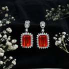 Elevate your style with these Lab Grown Sapphire Earrings that radiate a vibrant hue and striking elegance. These Drop Earrings showcase a 10X14 MM Emerald Cut Cultured Orange Sapphire of AAAA Quality, surrounded by D-VS1 Quality Moissanite halo, all securely set in Prong Setting. The main stone dangles elegantly, accompanied by a smaller Moissanite encircled by round stones at the top, featuring a screw back closure. These Dangling Earrings are handcrafted in sterling Silver Plated with White Gold, ideal for cocktail parties, ensuring you stand out with their unmatched brilliance. You can also pair these Emerald Cut Earrings with a matching pendant or necklace for a timeless look. Your Sapphire Statement Earrings will arrive in premium packaging, complete with a certificate of authenticity.