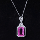 This Lab Grown Pink Sapphire Necklace is all about its breathtaking color and shine. Made from White Gold Plated Silver, this Emerald Cut Necklace represents love and eternal connections, making it a truly meaningful piece of jewelry for someone dear to you. This Pendant features a 10X14 MM Emerald cut Lab Grown Pink Sapphire securely held in Prong Setting, encircled by a halo and a cluster of round brilliant cut Moissanite gemstones. It serves as a classic and striking accessory, embodying elegance with its remarkable brilliance and vibrant color that sparkles with every flicker of light. Hanging from a simple yet durable chain, this Wedding Necklace for Bride is both versatile and stunning, resting beautifully on your neckline. For brides in search of something romantic, feminine, and uniquely elegant, this Bridal Necklace is the perfect choice for those who appreciate the geometric and art deco style pendant.