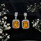 Bright as Sunset and beautiful as attractive, let your ears start the conversation and be the talk of the town as you gear up these enchanting Lab Grown Yellow Sapphire Earrings. Crafted from White Gold Plated Silver, these Earrings are adorned with 10X14 MM Emerald Cut Lab Grown Yellow Sapphire in Double Prong Setting. To enhance the beauty of the center gemstone is the scintillating Moissanite that creates a Halo. A center round Moissanite dazzles from the center. The oval frame has shimmering gemstones, offering a unique and glamorous look. Secured with Screw back closures these Emerald Cut Earrings are a symbol of luxury and elegance. Enchanted by its bright color and creative symbolism, these Bridal Earrings are truly a remarkable accessory that adds a touch of luxury to the outfit. As a symbol of sophistication and grace, these Earrings maximize their sparkle and brilliance. Having a unique and statement design, these Statement Earrings are the perfect accessory to steal the spotlight.