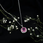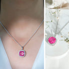Get ready to turn heads and steal hearts with this dazzling Lab Grown Pink Sapphire Necklace. Radiating with soft blush tones and framed by a shimmering halo of sparkling Moissanite gemstone, this piece is made for those who adore glam with a splash of sweetness. The 12 MM Cushion Cut Lab Created Pink Sapphire takes center stage, bold, feminine, and effortlessly chic, while the Moissanite stones add that jaw-dropping sparkle. Handcrafted with care and designed to stand out, this Statement Necklace is something you will never want to take off. Suspended delicately from a Silver Chain, it is the perfect choice to elevate your cocktail look, birthday outfit, or even your everyday ensemble. Whether you are styling it solo for a bold look or layering it up with dainty chain for that trendy layered stack, this Pink Sapphire Pendant Necklace (Lab Grown) is your ticket to spotlight-ready shine.