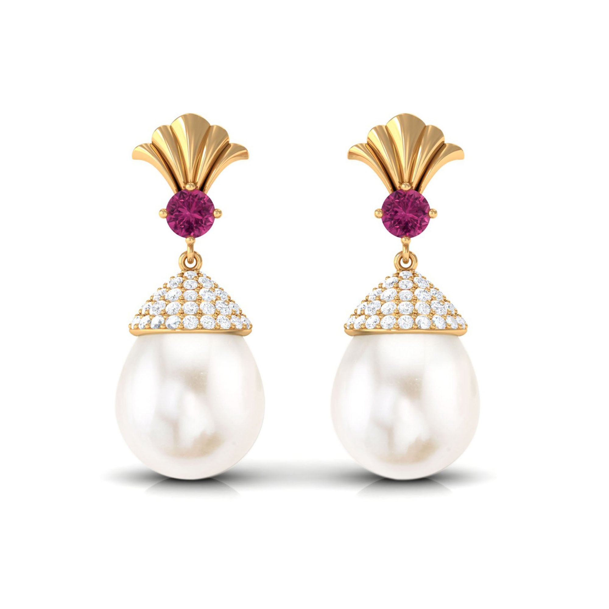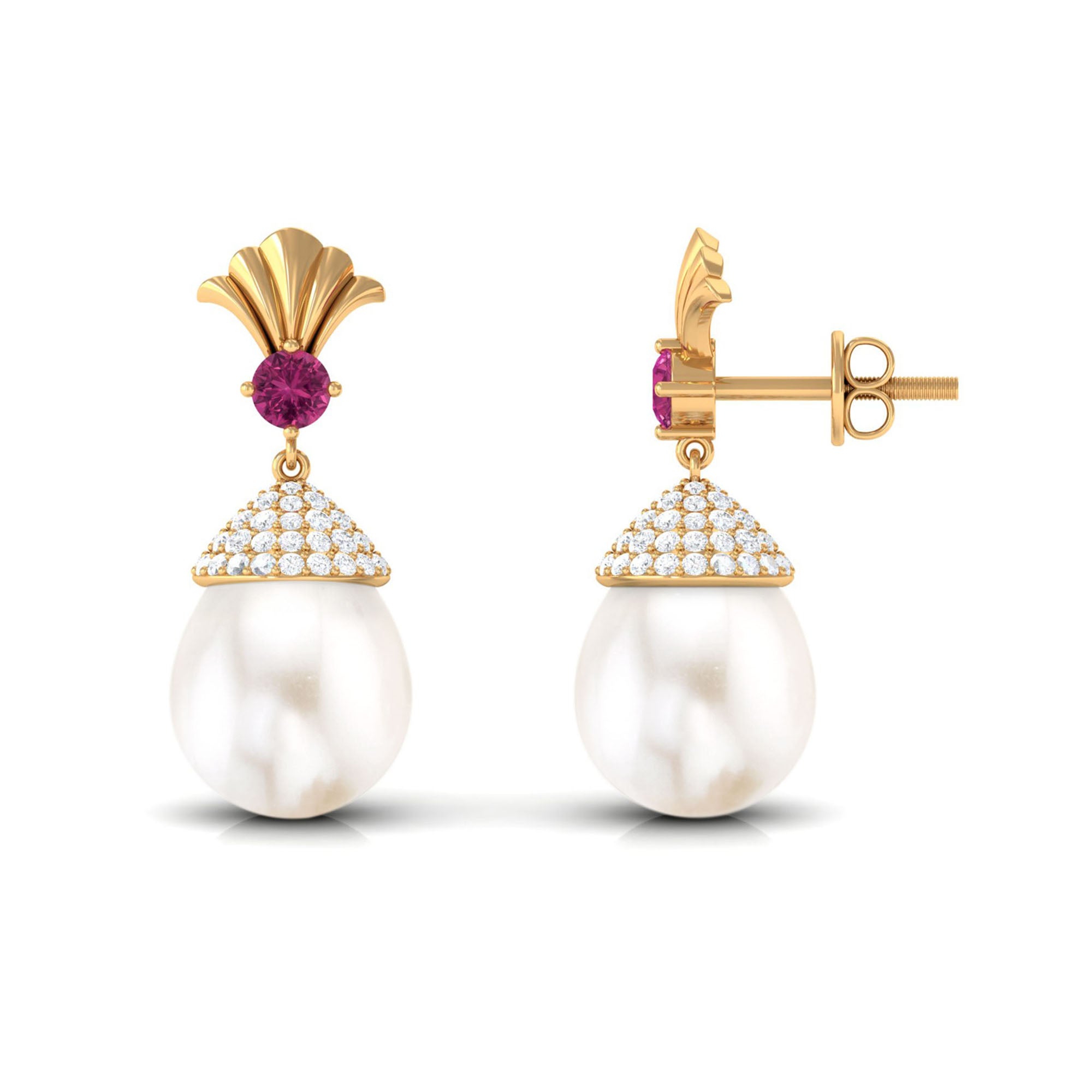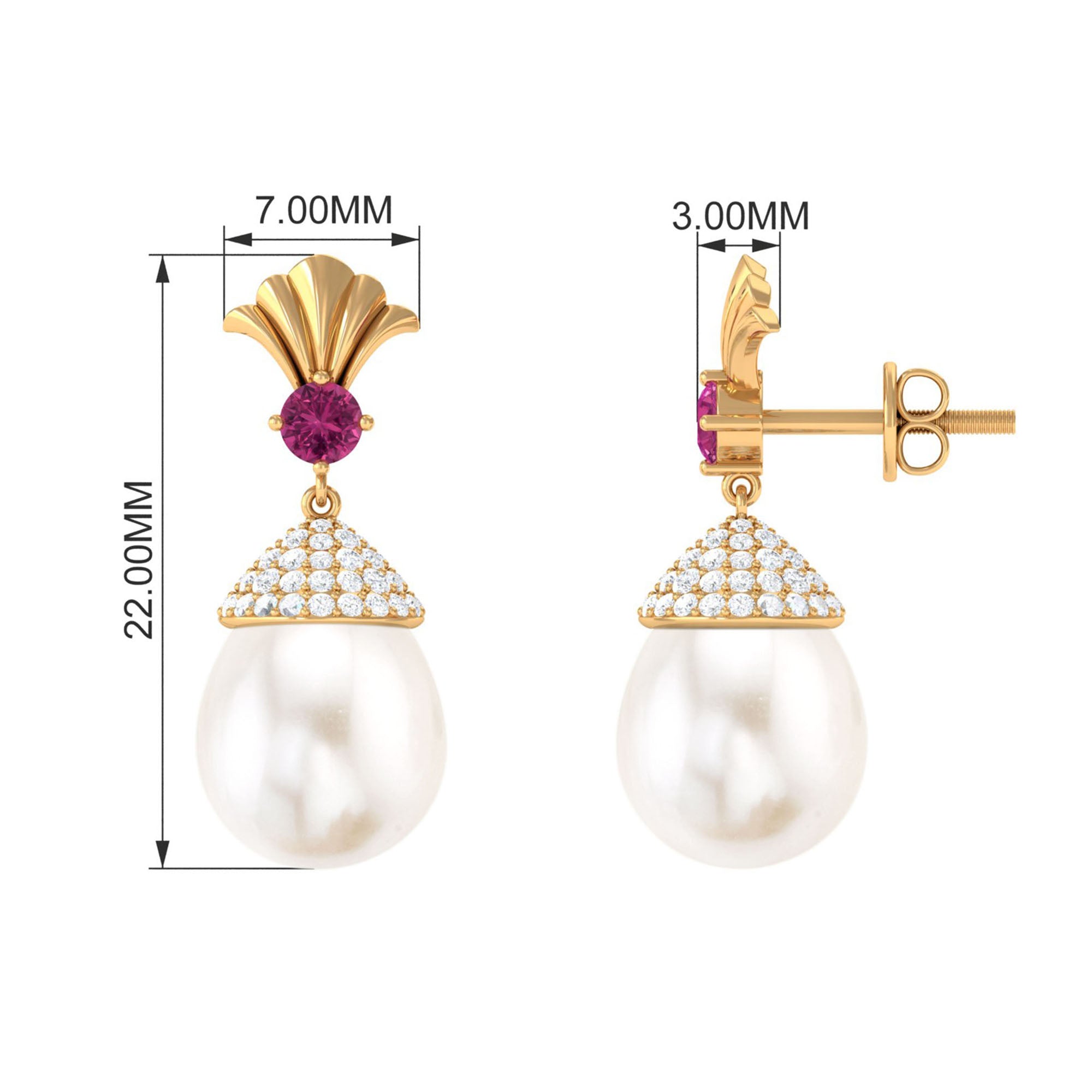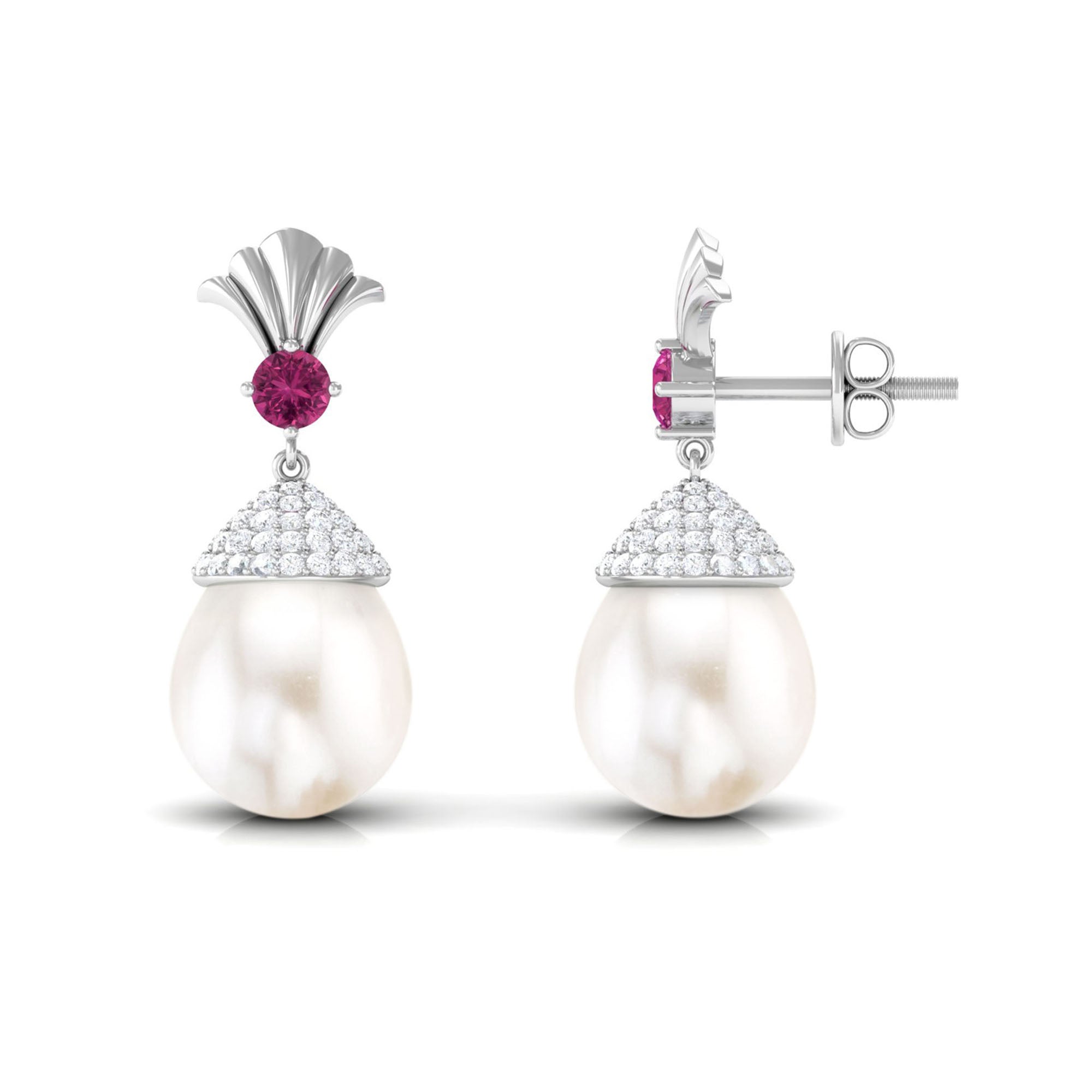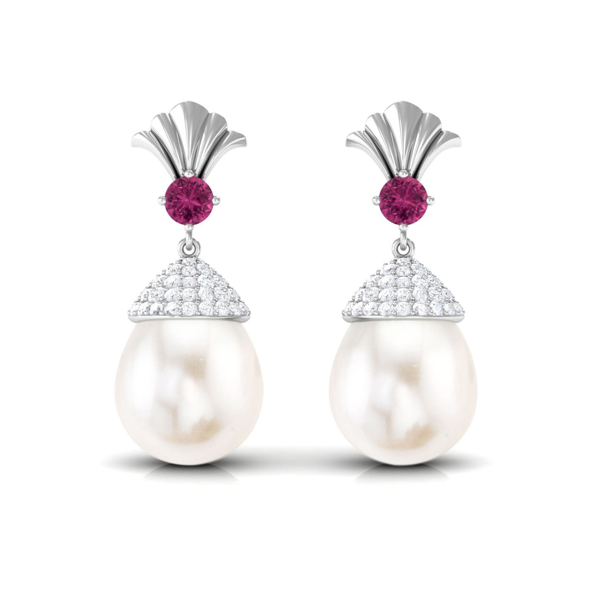 13 CT Freshwater Pearl Drop Earrings with Moissanite and Pink Tourmaline