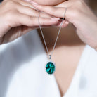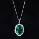 Elevate your special day look with this gorgeous Emerald Halo Necklace, skillfully crafted from 14K White Gold Plated Silver. The centerpiece is a stunning 13X18 MM Oval Cut Lab Created Emerald, elegantly secured in Prong Setting and surrounded by a dazzling array of smaller Moissanite stones. This halo design enhances the shine of the main gem, making it appear even more striking. Experience the timeless beauty and remarkable elegance of our Oval Halo Necklace, thoughtfully designed to honor life’s most cherished moments. This remarkable Emerald Statement Necklace radiates brilliance and exceptional craftsmanship, tailored just for you. Every detail pays attention to your unique journey, capturing the spirit of the moments that define your special day. Your Wedding Necklace for Bride will arrive in a signature jewelry pouch, complete with a certificate of authenticity.