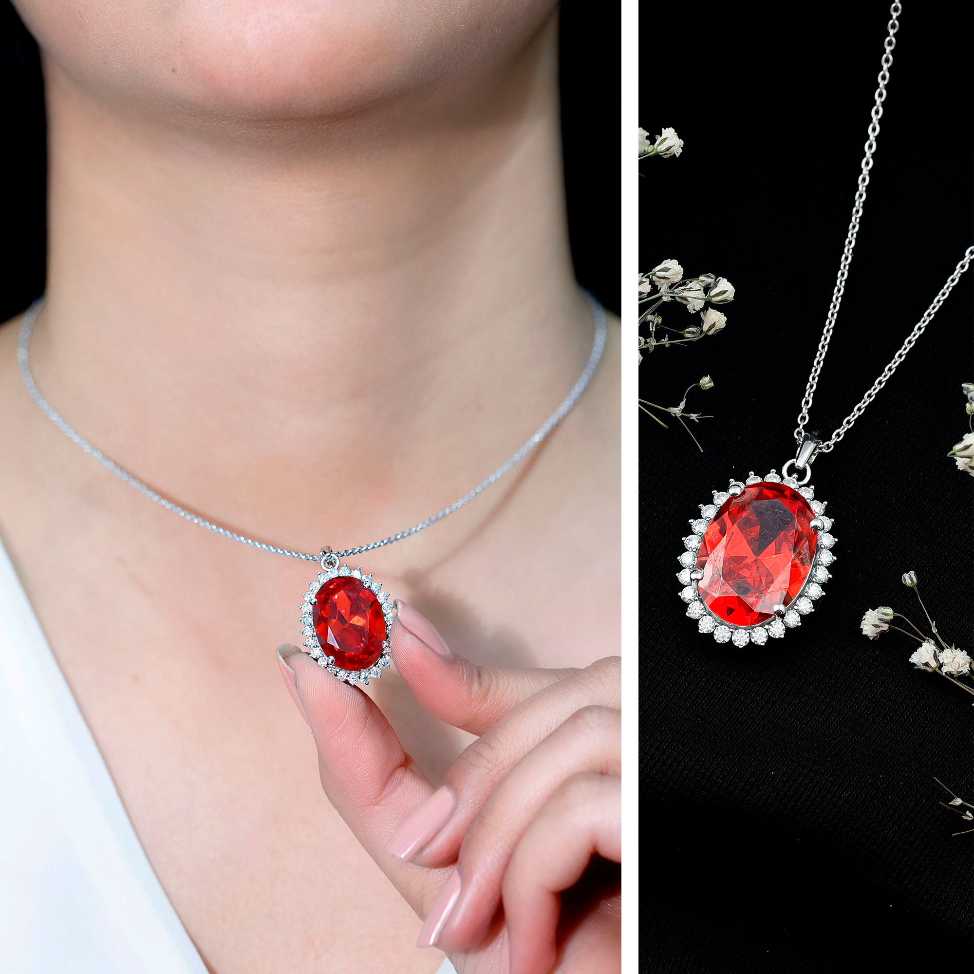 Complete your look with this Lab Grown Sapphire Pendant, precisely handcrafted with 14K White Gold Plated Silver. The pendant features a 13X18 MM Oval Shape lab created orange sapphire surrounded with round shape Moissanite halo to make it a true statement piece of jewelry. The Vintage Wedding Necklace has luxurious hue of Orange Sapphire which automatically attracts everyone towards the wearer, and White Moissanite accentuates the bright orange color. This Halo Pendant Necklace beholds the classic shine of AAAA Quality Sapphire, which makes it perfect to be worn on the special day. A cable Chain is there holding the Pendant, so you can wear it comfortably and can layer with other stacking necklaces. This Oval Shaped Necklace will be shipped to you in Premium packaging with a certificate of authenticity.
