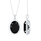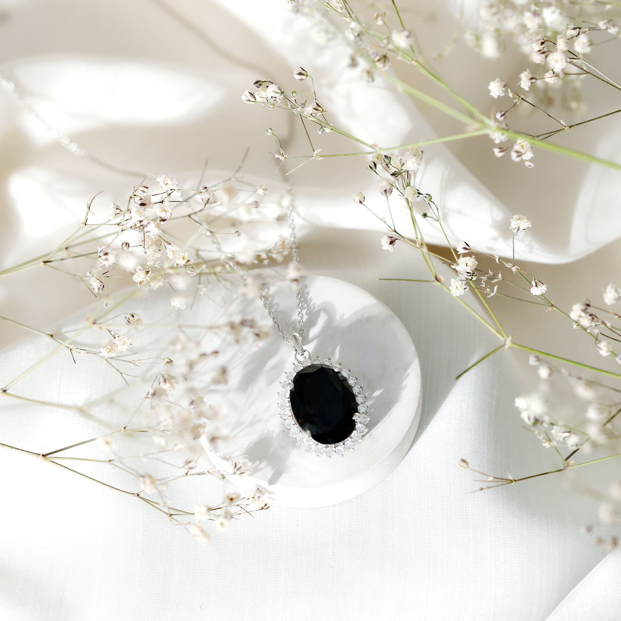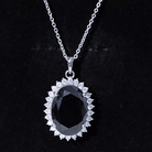 This Lab Created Black Diamond Pendant shines with a dark and deep color, making it a great choice for showcasing bold beauty. This stunning pendant truly embodies elegance and charm, making it a perfect gift for someone special. This Vintage Pendant Necklace features an oval cut gemstone, symbolizing classic charm and boldness, ideal for your loved one. The 13X18 MM stone, held in a prong setting, is large enough to catch anyones eye. The Statement Pendant Necklace is enhanced with a halo of smaller Moissanite stones, adding a touch of sparkle with its shimmering nature. The Monochrome Necklace hangs from a sterling silver cable chain, which not only positions it beautifully on the neckline but also allows for adjustments to suit your preferred style.