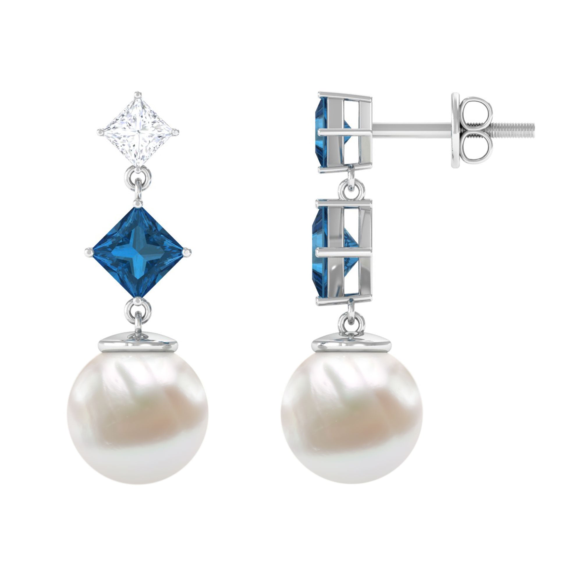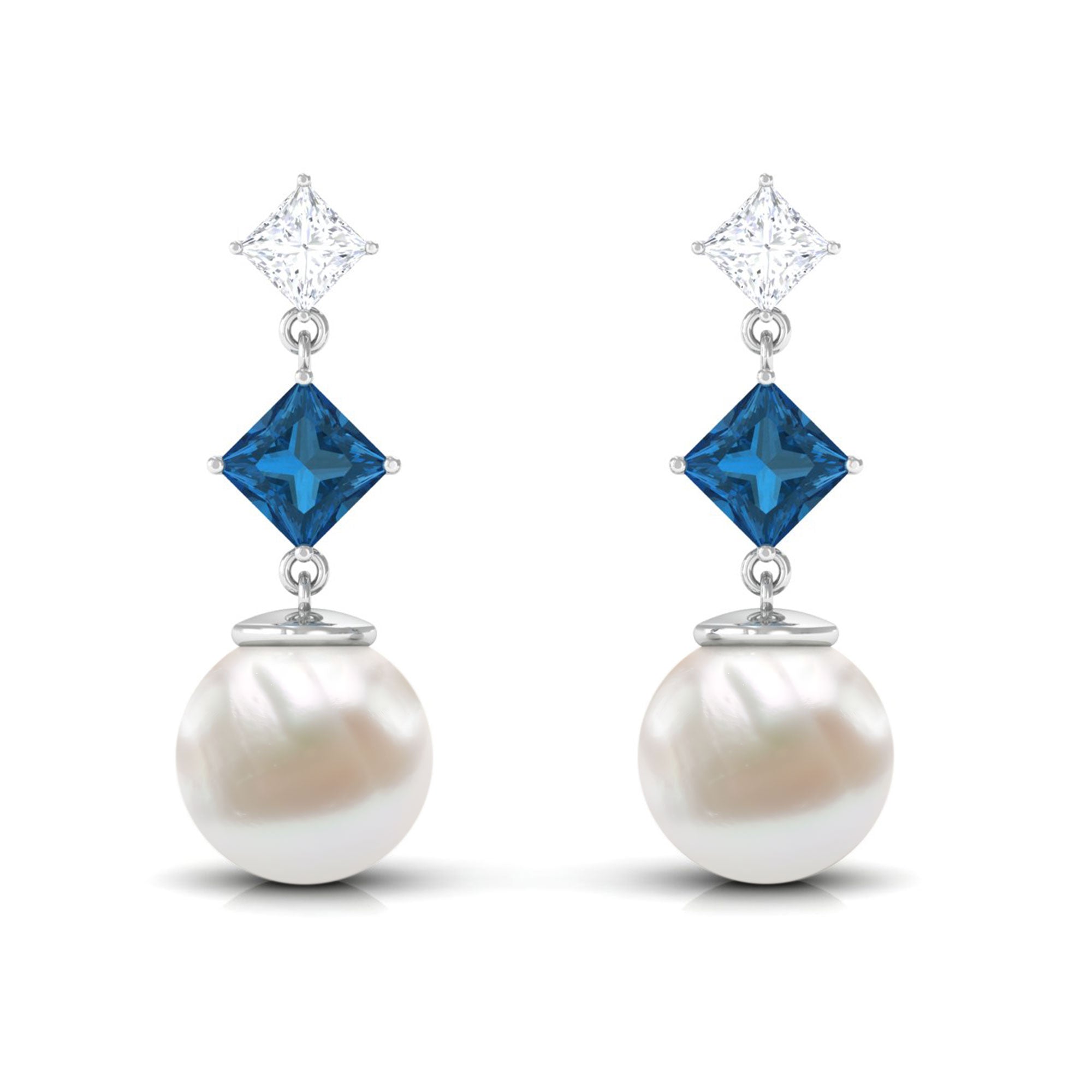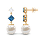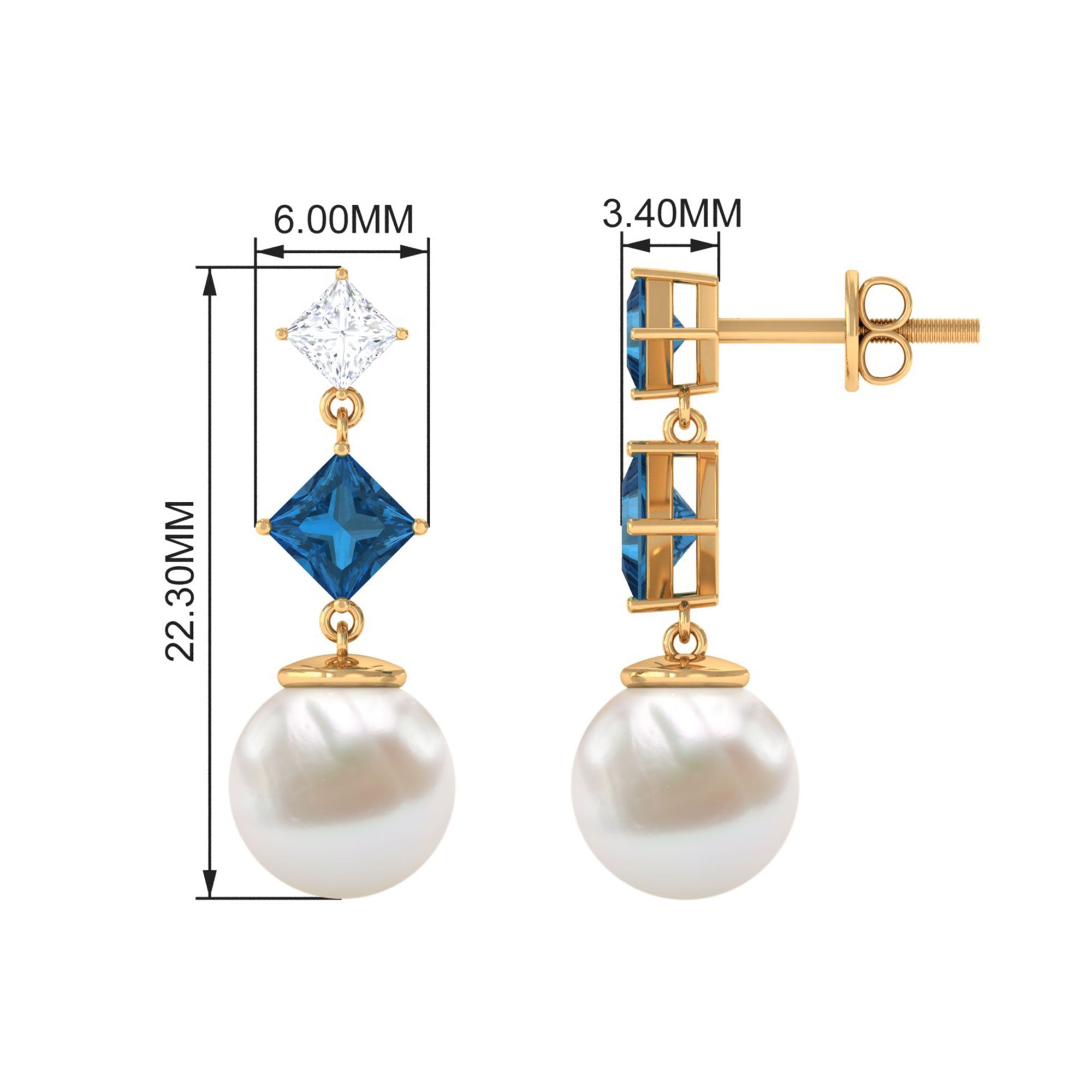 16.5 CT Freshwater Pearl and London Blue Topaz Dangle Drop Earrings with Moissanite