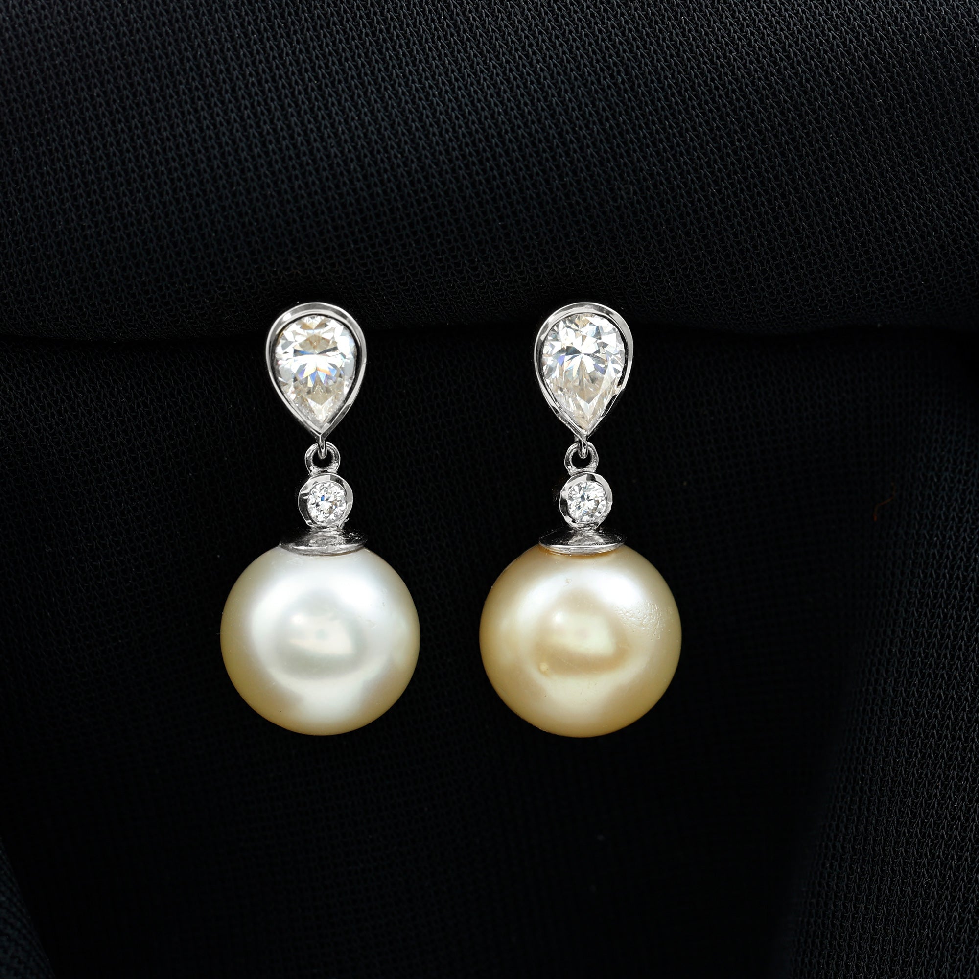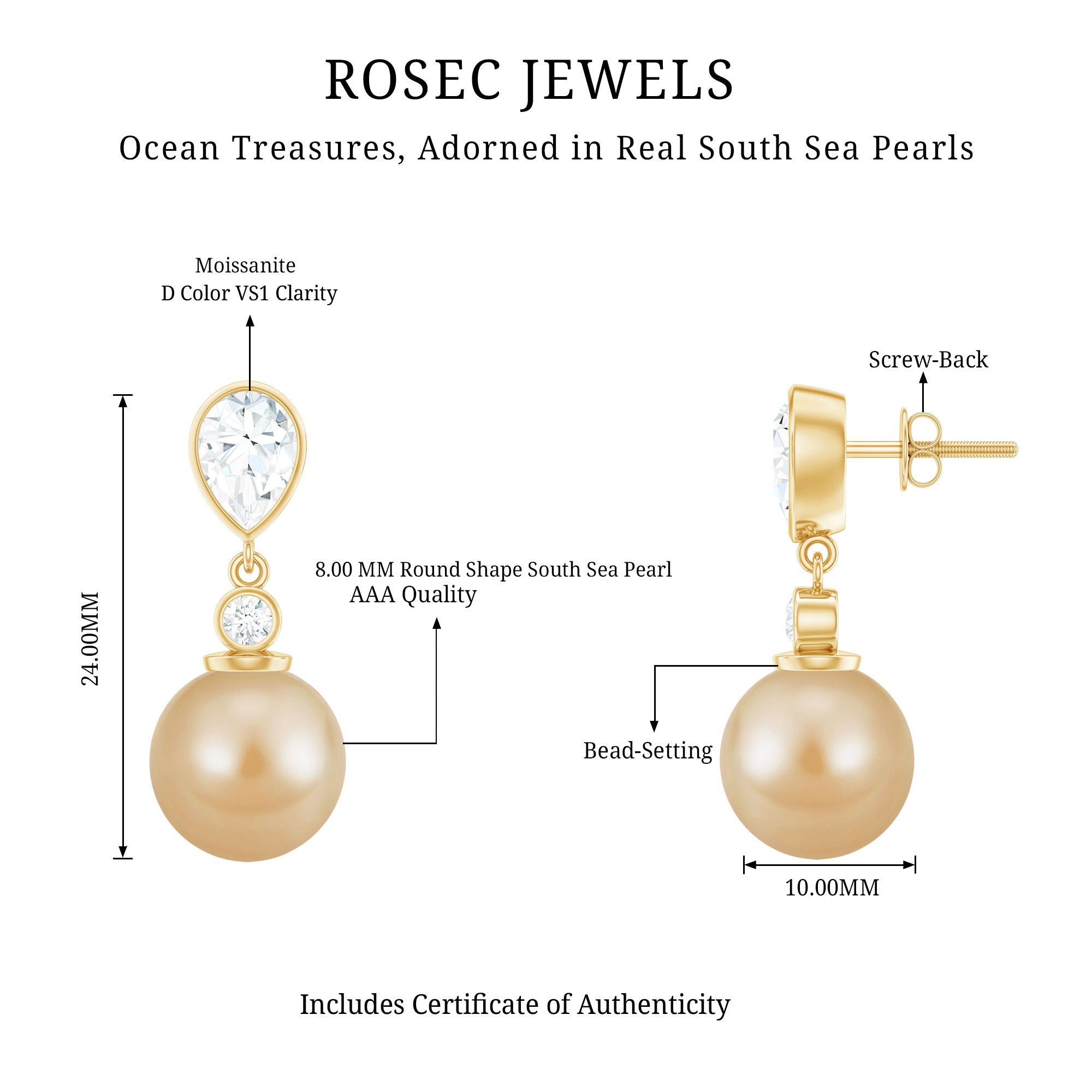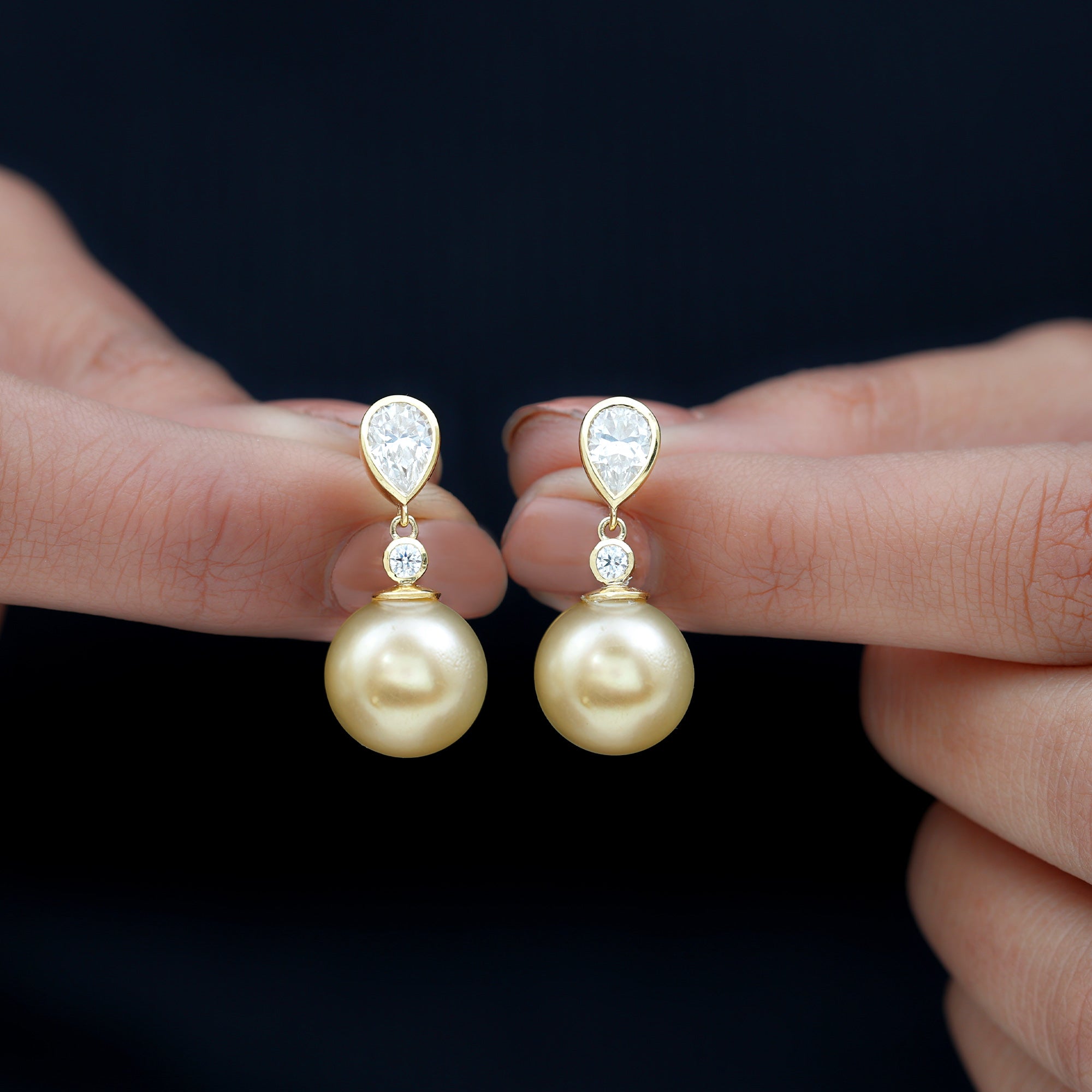 These simple pair of Drop Earrings for Women are adorned with Pear and Round Shape Moissanite set in bezel setting and a stunning 8 mm South Sea Pearl as drop making it a must have addition to your jewelry collection. The South Sea Pearl Drop Earrings are appropriate for flaunting everyday and also adds an elegant touch to your attire for your special evenings.