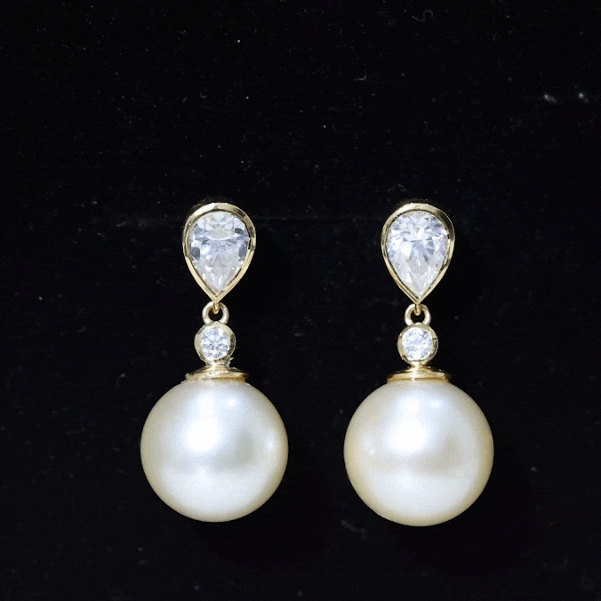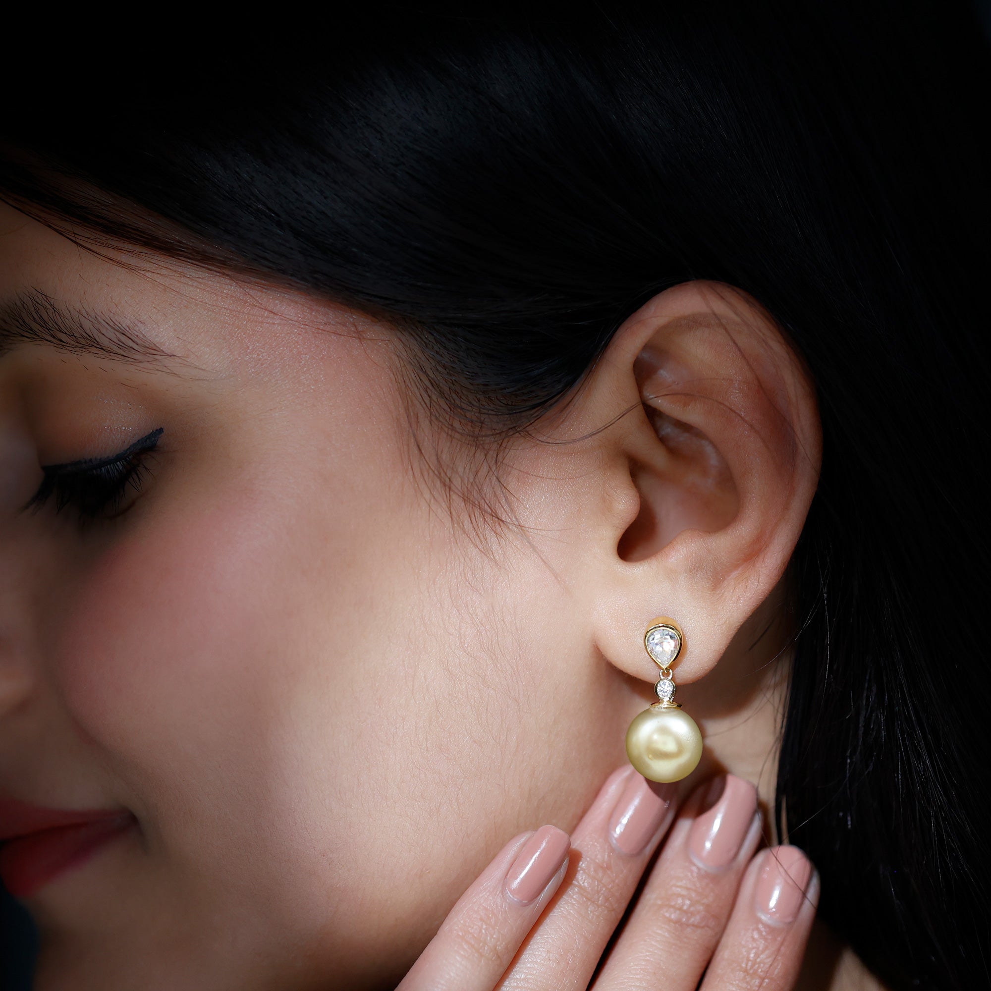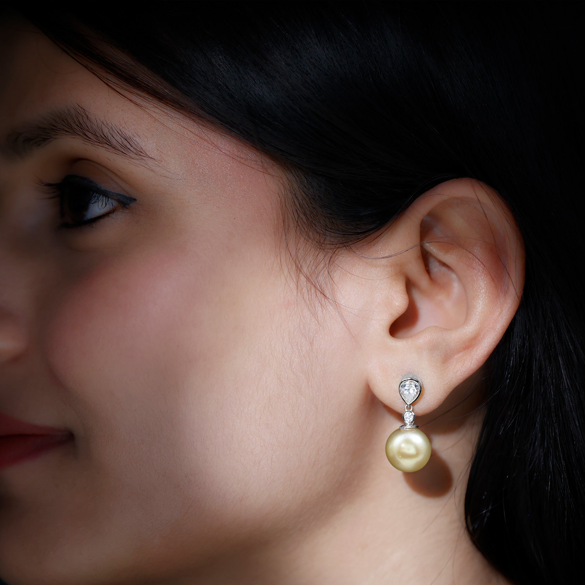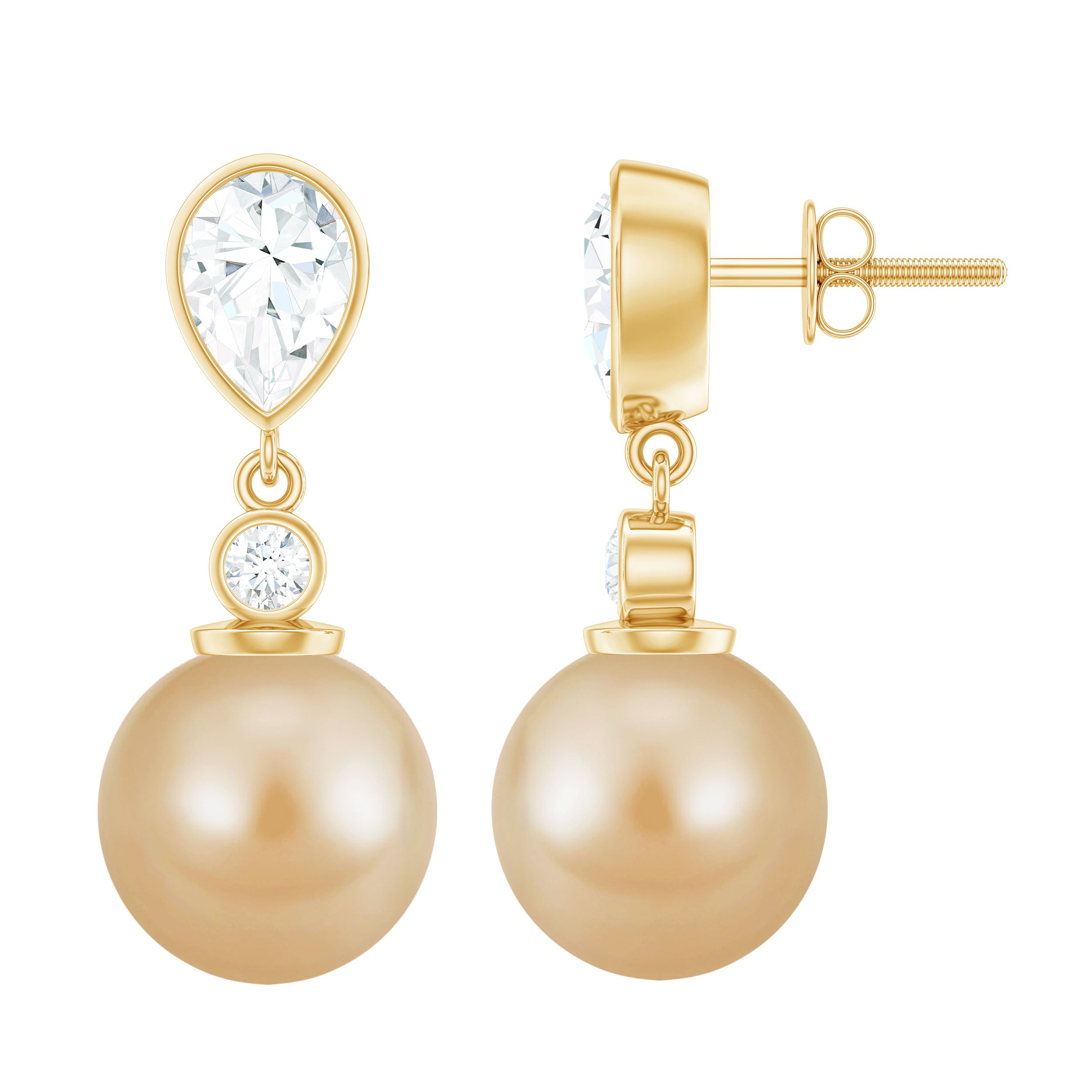 These simple pair of Drop Earrings for Women are adorned with Pear and Round Shape Moissanite set in bezel setting and a stunning 8 mm South Sea Pearl as drop making it a must have addition to your jewelry collection. The South Sea Pearl Drop Earrings are appropriate for flaunting everyday and also adds an elegant touch to your attire for your special evenings.
