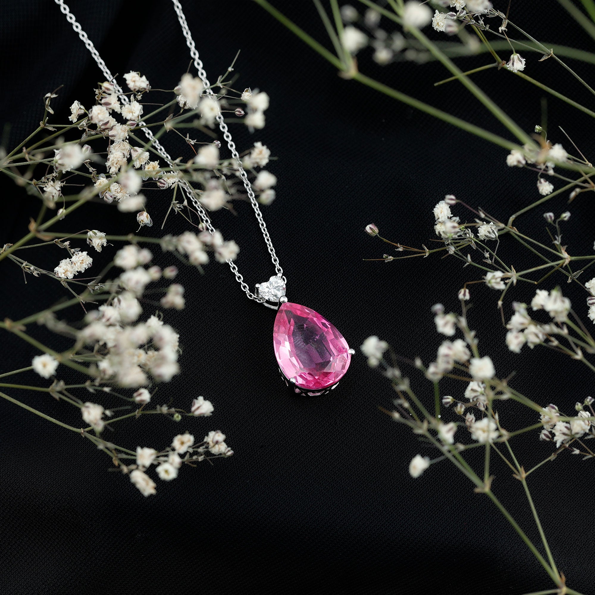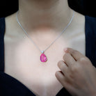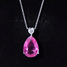 Enhance your neckline with this Lab Grown Pink Sapphire Necklace, which offers a simple yet sophisticated touch. Made from 14k white gold plated silver, this Teardrop Necklace features an 18X13 MM pear cut lab grown pink sapphire set in prongs, complemented by a 5 MM heart-shaped Moissanite at the top. Hanging from a chain, this Sapphire Drop Necklace brings a sense of elegance and brilliance, creating a stunning contrast that showcases its refined design. Elevate your outfit with this exquisite and stylish Pink Stone Necklace, a perfect accessory for someone dear to your heart. This AAAA Quality Lab Grown Pink Sapphire paired with D-VS1 Quality Moissanite holds a special significance that is timeless with its classic design. Whether you are treating yourself or buying a gift, this Statement Pendant is the perfect option. Its classic design and high-quality materials ensure it is a piece you will cherish for years. Enhance your wardrobe with this stunning accessory.