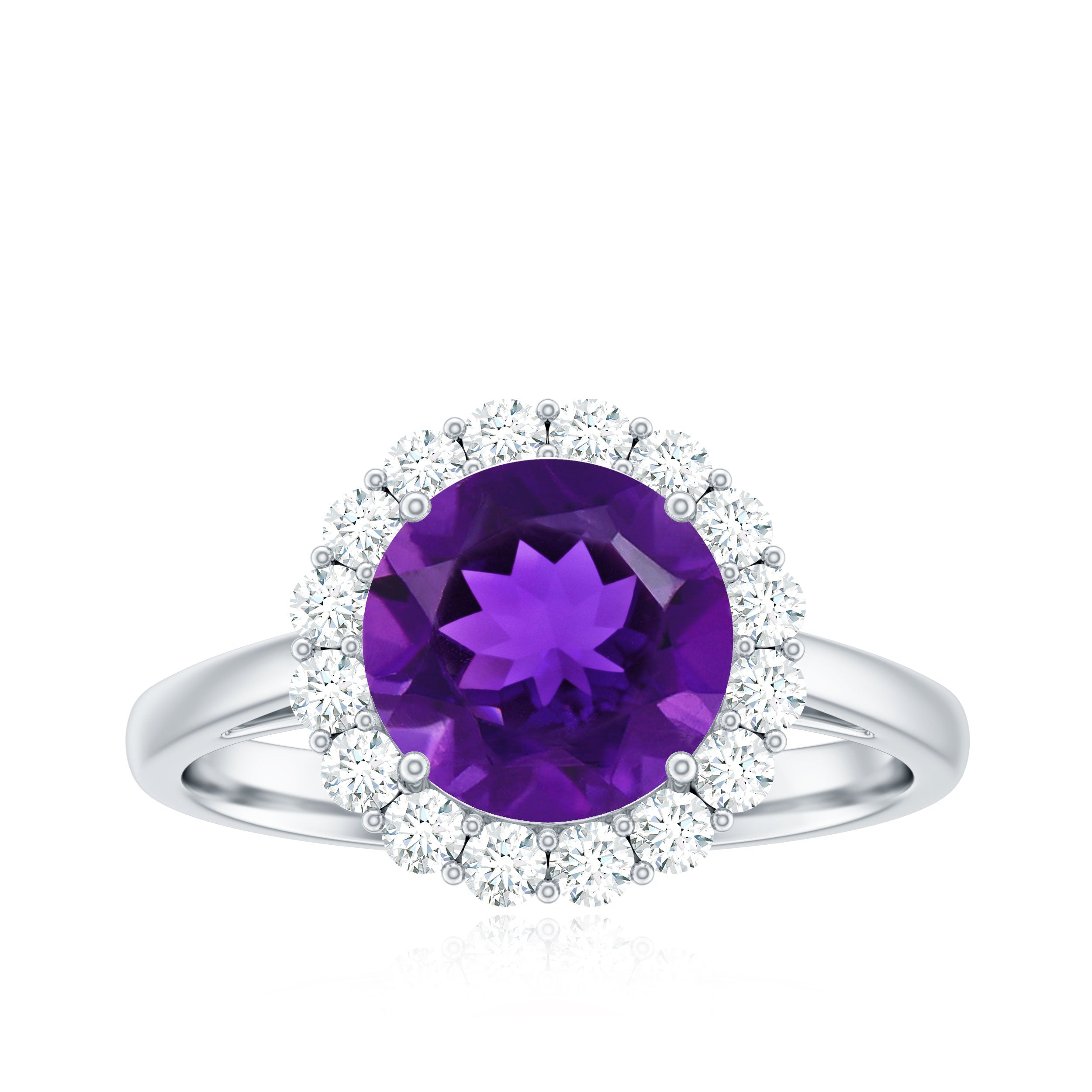 The Engagement Ring is designed with Round Shape Amethyst and Moissanite Halo. This 8 MM Amethyst Engagement Ring in Halo Setting will be a perfect gift for a woman.