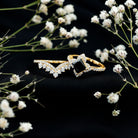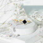 This Black Onyx and Moissanite Statement Wedding Ring Set is a bold and striking choice for any bride who wants to make a statement with her wedding ring. The set includes an engagement ring and a matching wedding band, both crafted from high-quality gold. The centerpiece of the engagement ring is a beautiful black onyx stone, cut into a unique shape that sets it apart from traditional moissanite engagement rings. Surrounding the onyx stone are shimmering moissanite stones, which add an extra touch of sparkle and luxury. The band of the engagement ring also features additional moissanite stones, creating a dazzling display of brilliance. The matching wedding band features a row of moissanite stones that perfectly complement the engagement rings design. Together, these two rings make a bold and beautiful statement that is sure to be noticed and admired. This set is a perfect choice for any bride who wants a wedding ring that is as unique and special as she is.