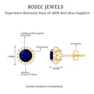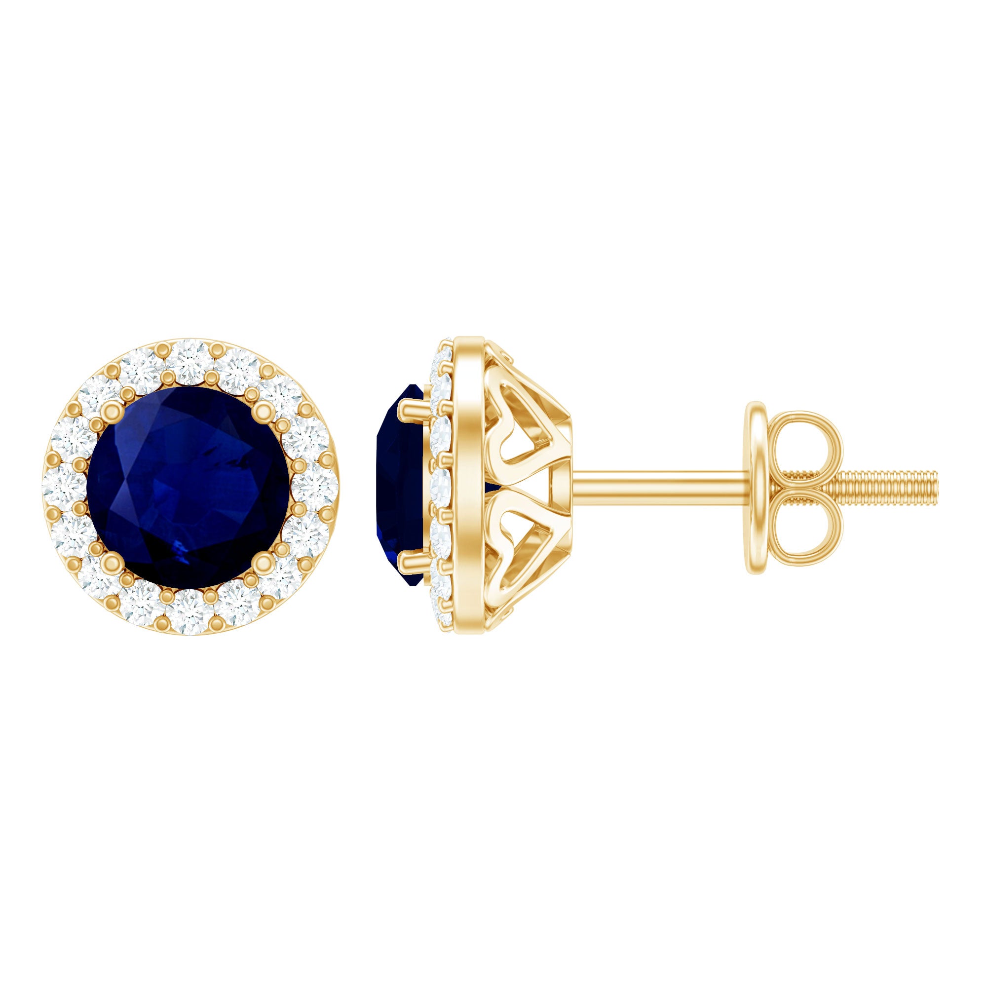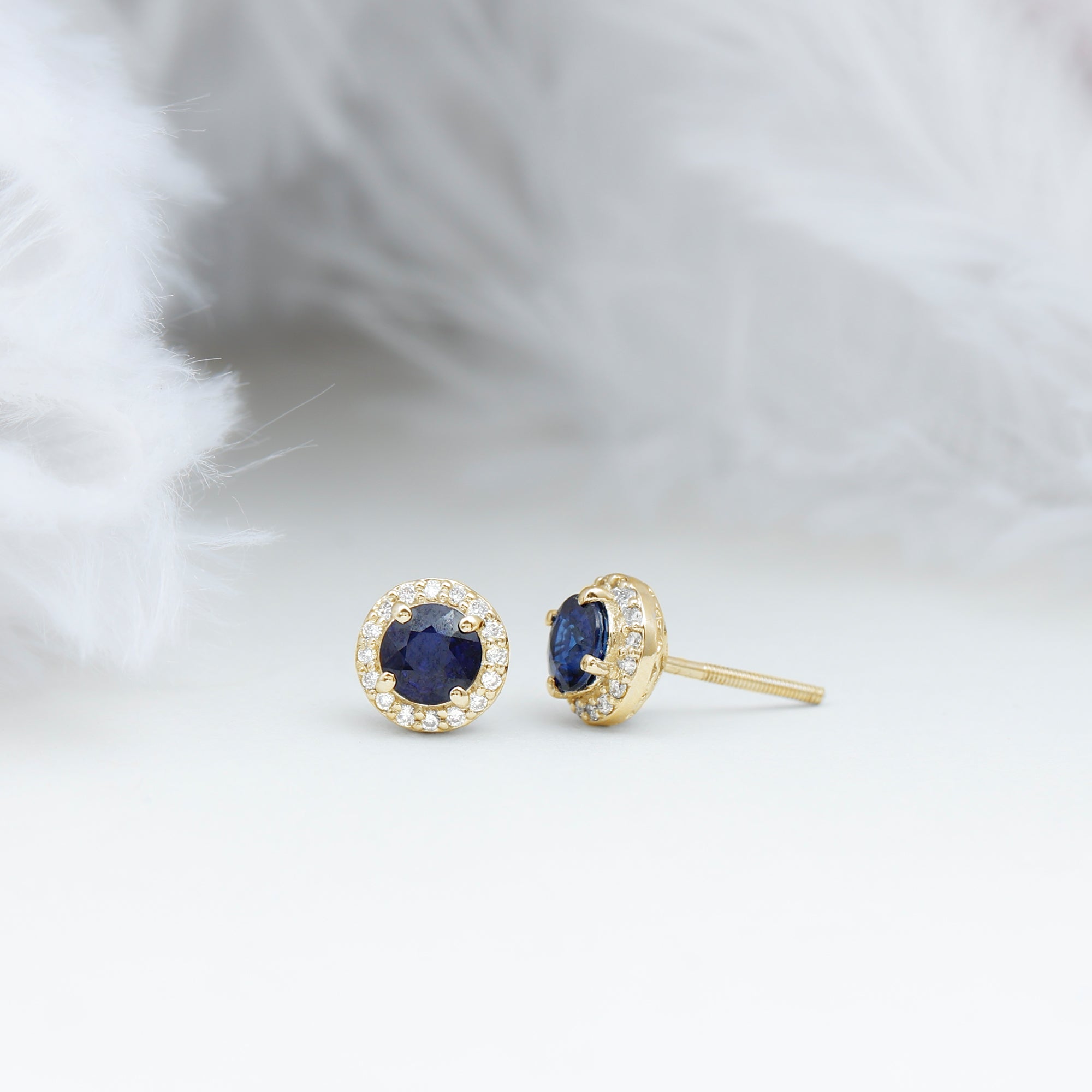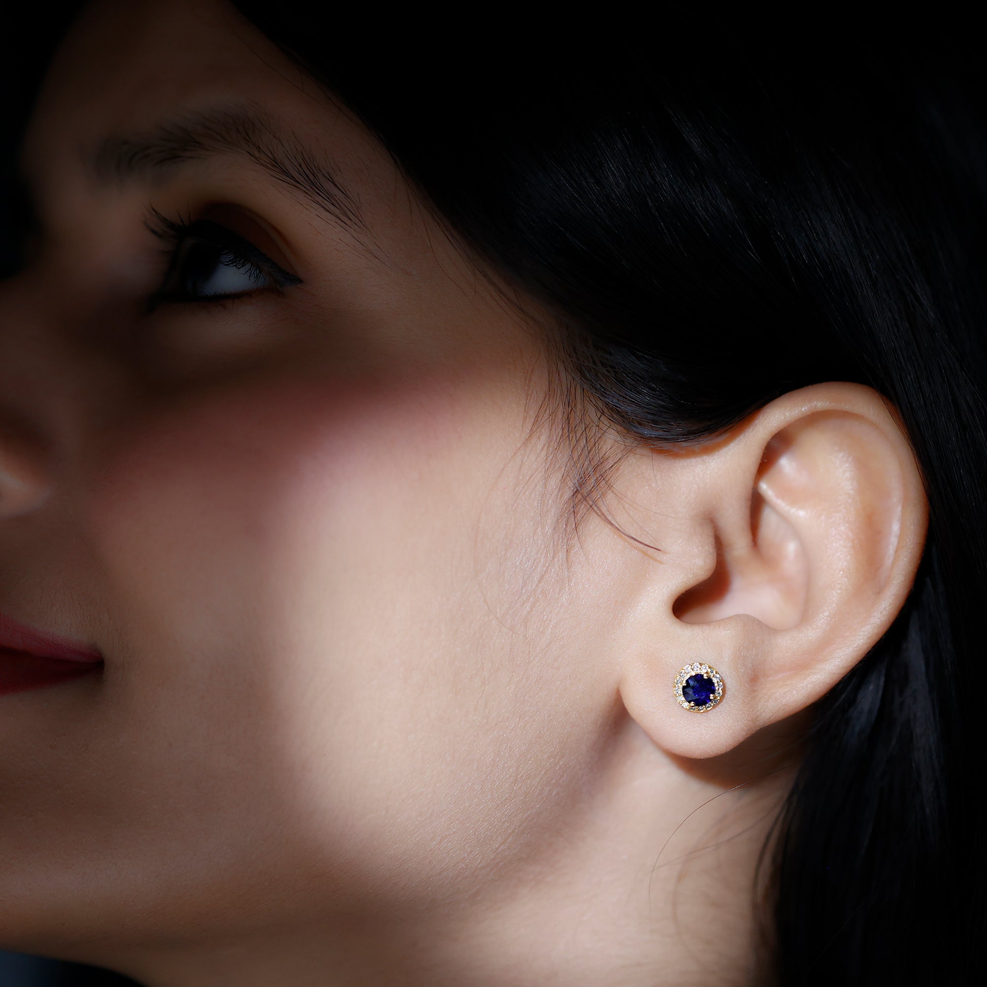 Crafted in Solid Gold, this stunning stud earring is adorned with a Round Shape Blue Sapphire gemstone set in the center in a Prong Setting, and surrounded by a halo of Round Shape Diamond. This accessory is a perfect addition to any outfit and suitable for any occasion.