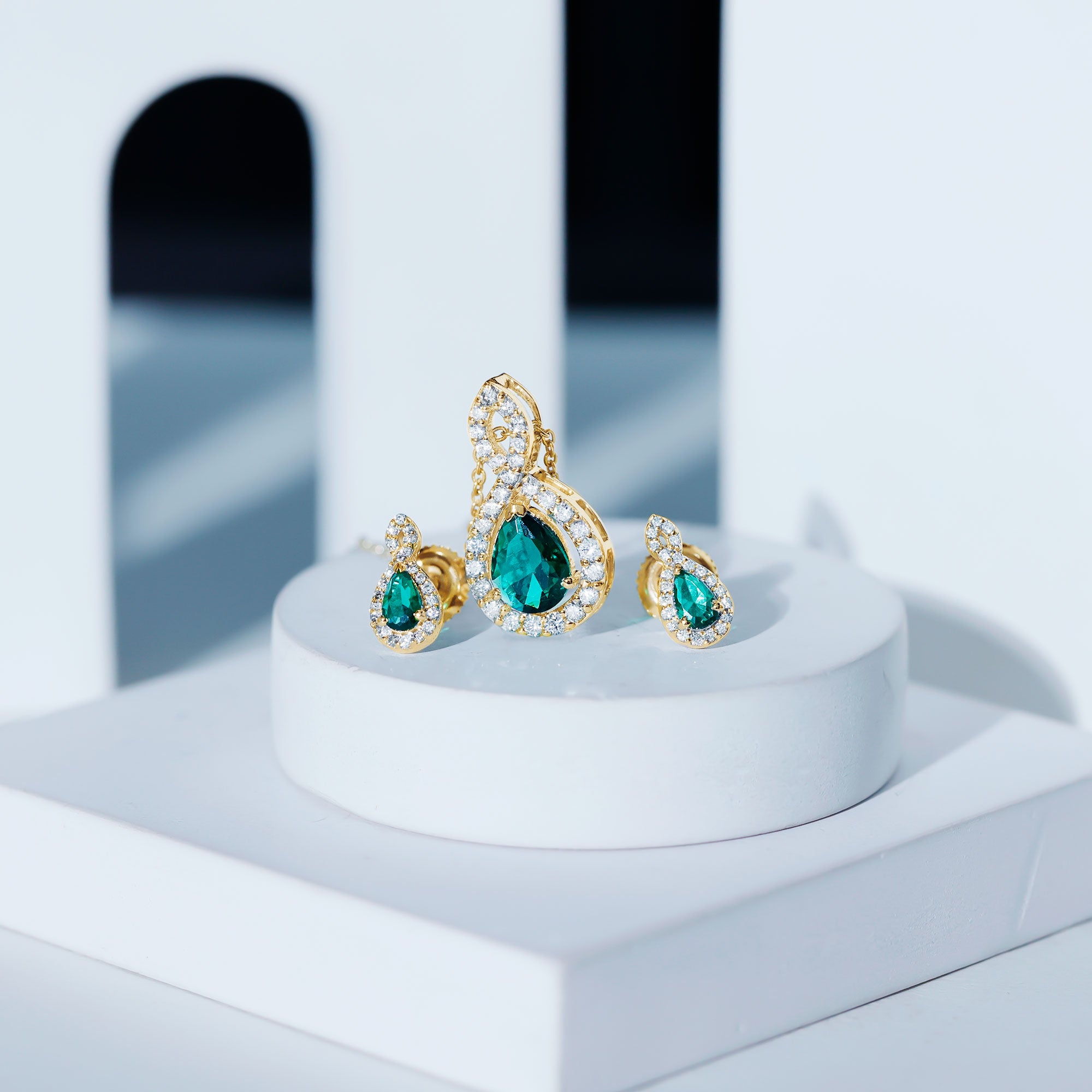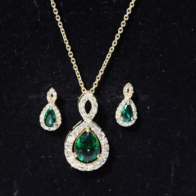 Indulge in the timeless elegance of this exquisite Created Emerald jewelry Set, expertly crafted in Gold for an enchanting appeal. Featuring a beautiful pear cut Created Emerald and Diamond Infinity Pendant and matching Earrings, this fine jewelry set exudes effortless elegance and sophistication. Dont miss the opportunity to impress your loved one with your impeccable taste by gifting her this stunning Diamond Infinity jewelry Set.