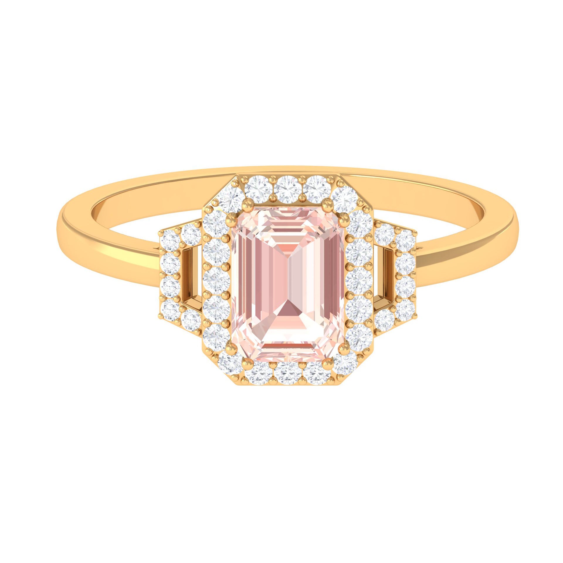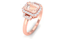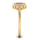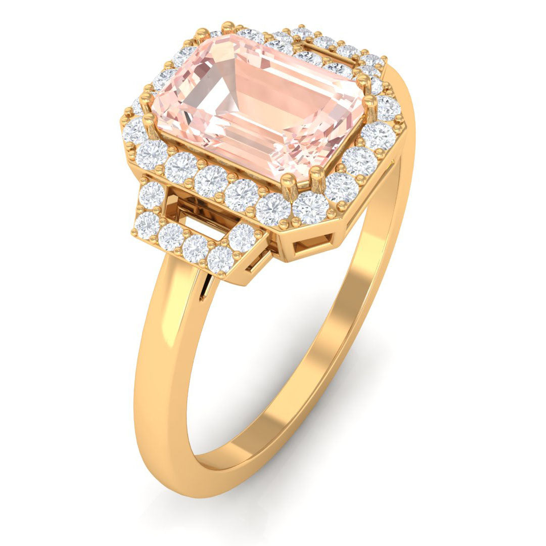 This stunning cocktail engagement ring showcases an Emerald Cut-cut morganite center stone, surrounded by a halo of round Diamond stones. The sparkling Diamond stones and the warm, pink hue of the morganite combine to create a breathtaking piece of jewelry that is perfect for a proposal or special occasion. The ring is crafted in a precious gold, ensuring both its beauty and durability. Whether worn as an engagement ring or simply as a statement piece, this ring is sure to turn heads and bring a touch of glamour to any outfit.