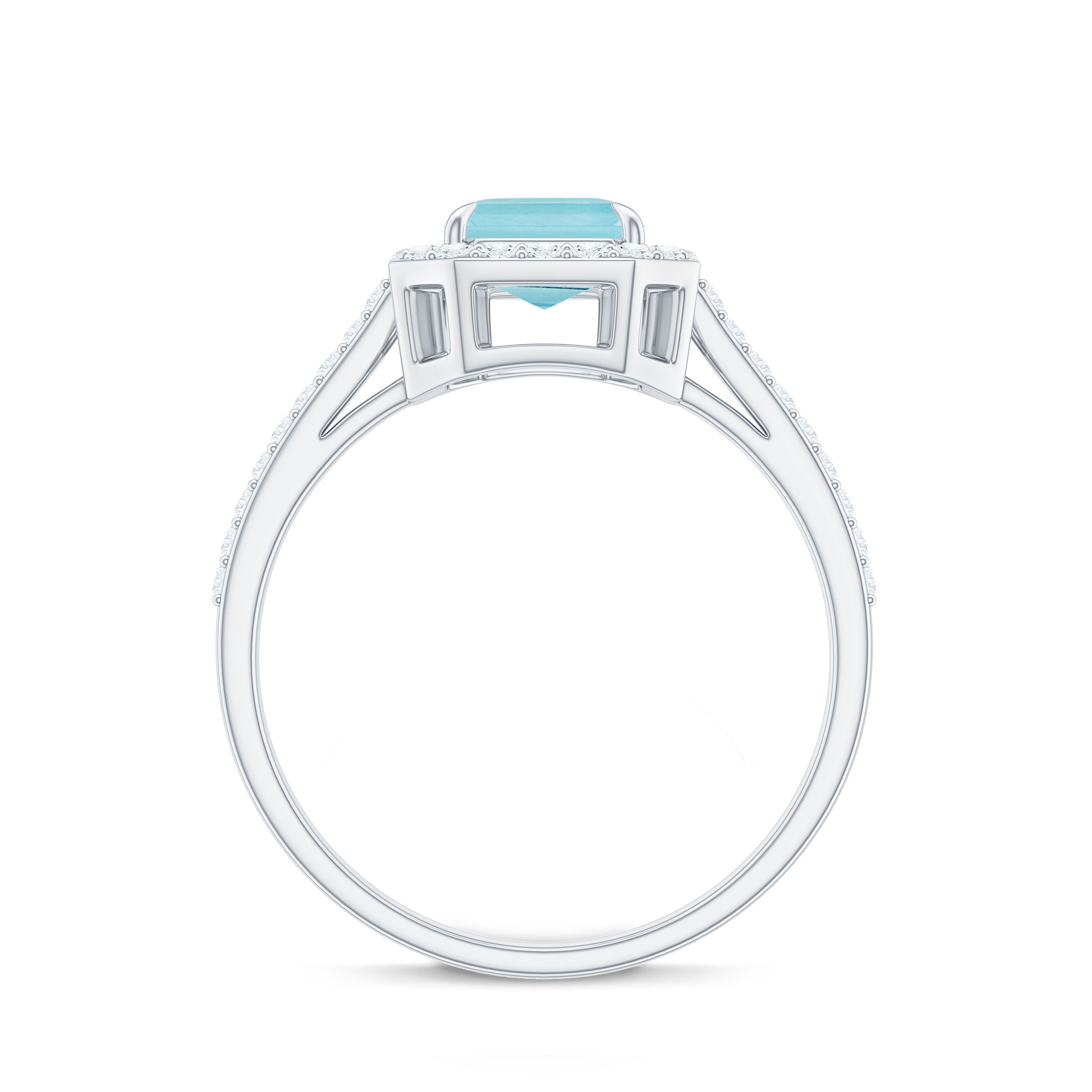 Make a statement with this Emerald Cut Shape Sky Blue Topaz Classic Engagement Ring, adorned with a Diamond Halo. The ring features a stunning Emerald Cut-cut Sky Blue Topaz set in a prong setting, surrounded by a dazzling halo of Diamond stones that adds to its luxurious appeal. The Sky Blue Topaz is known for its calming and soothing energy, making it a perfect symbol of love and serenity. The classic design of this engagement ring exudes sophistication and elegance, making it a timeless piece that will be cherished for years to come. This ring is a perfect choice for any bride-to-be who wants a unique and captivating engagement ring.