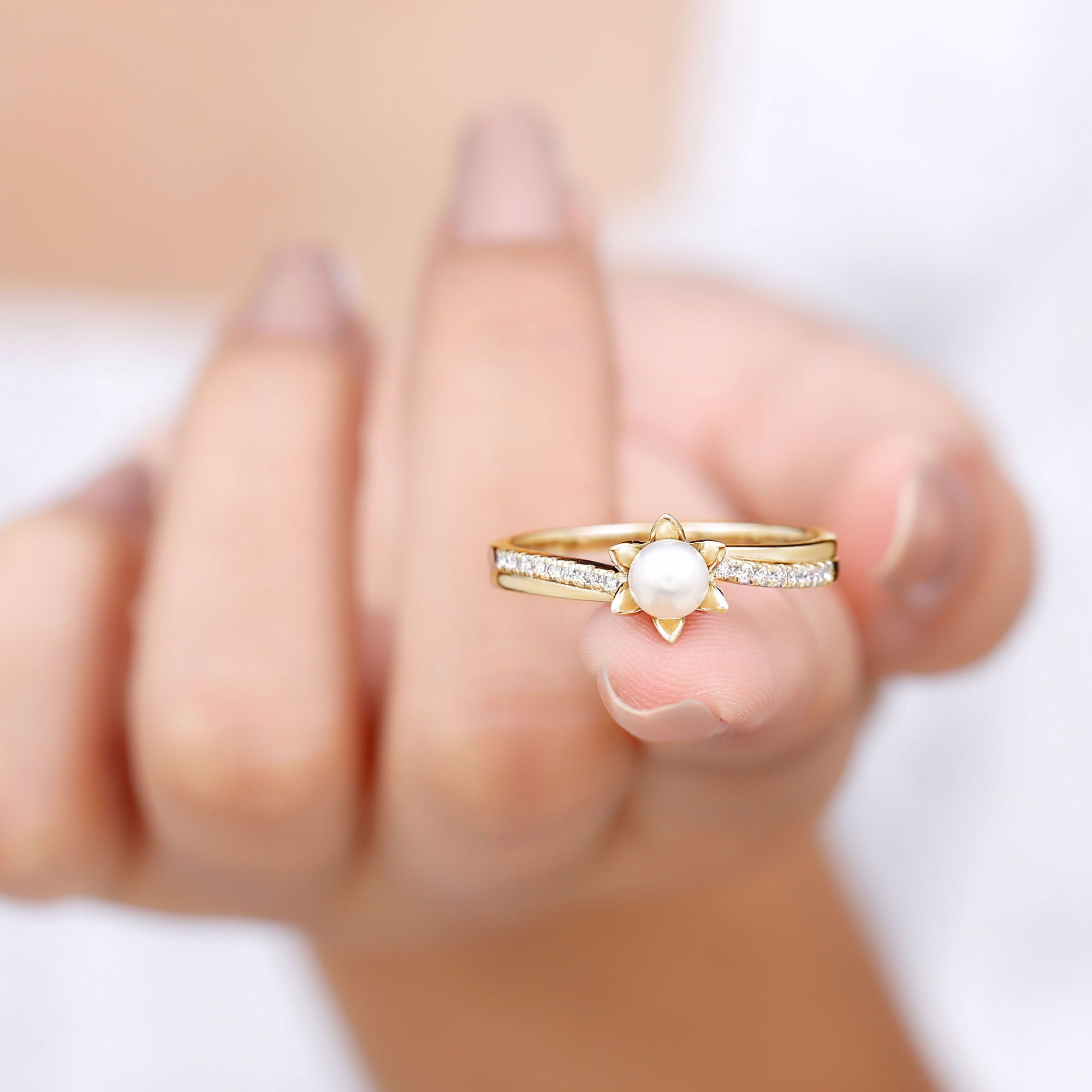 Assemble the vivid glimpse of your meeting and propose your lady with this Freshwater Pearl Engagement Ring. This Floral Engagement Ring is embellished with Diamond Side Stones to create a sumptuous appeal to the ring. This Pearl Ring is a delicate choice for your partner to be, get this Pearl and Diamond Ring for your lady from our stone.
