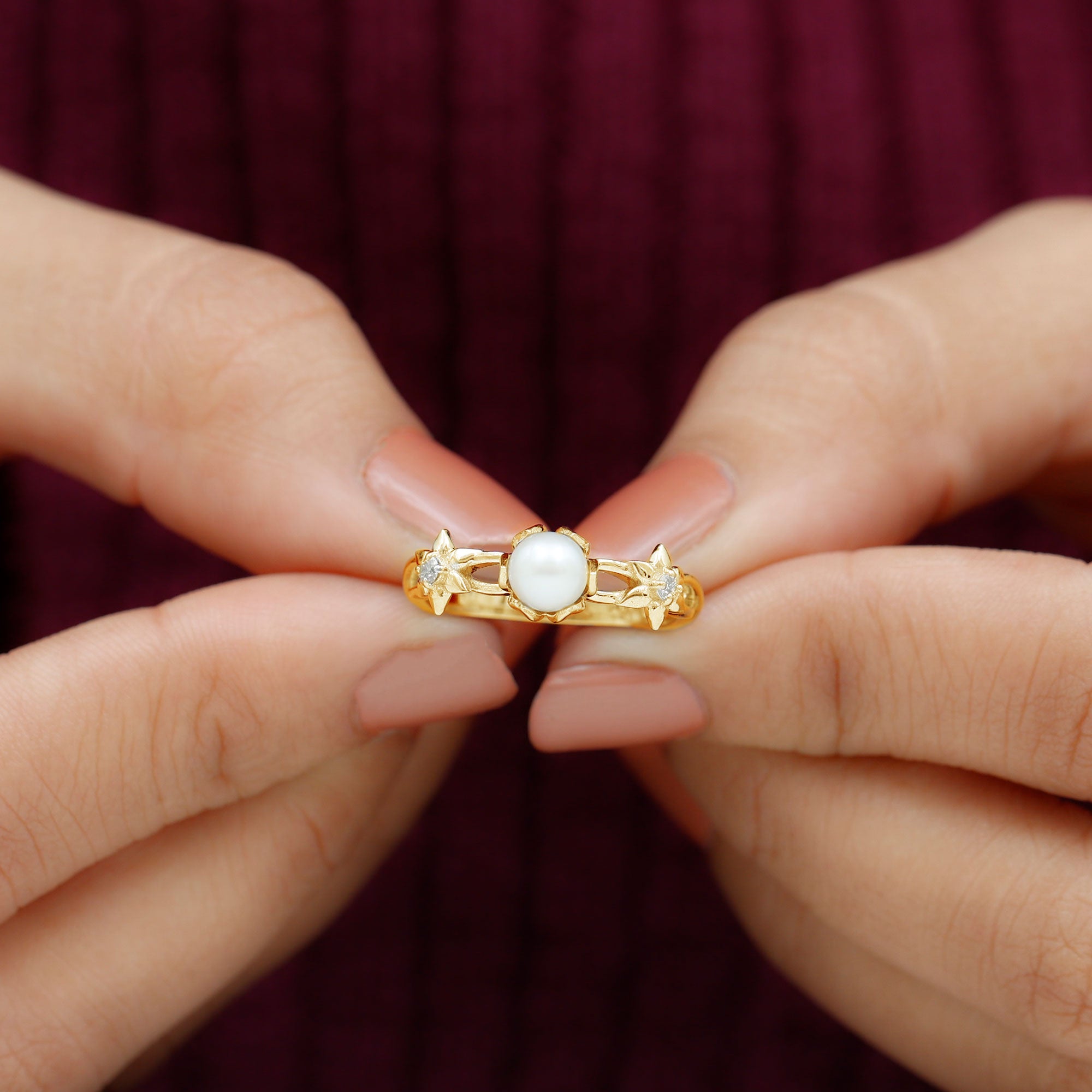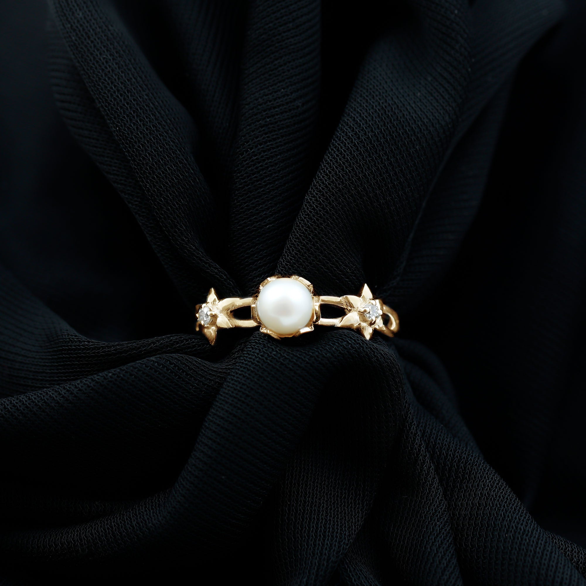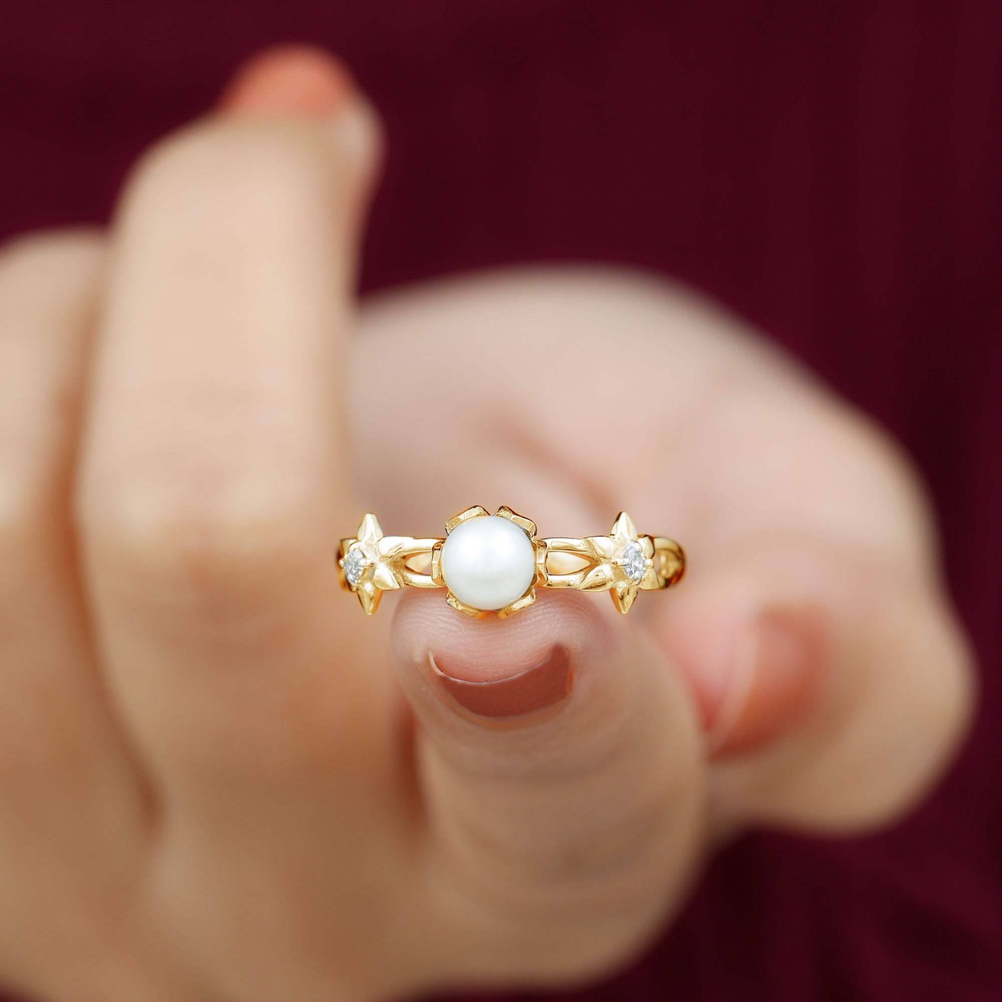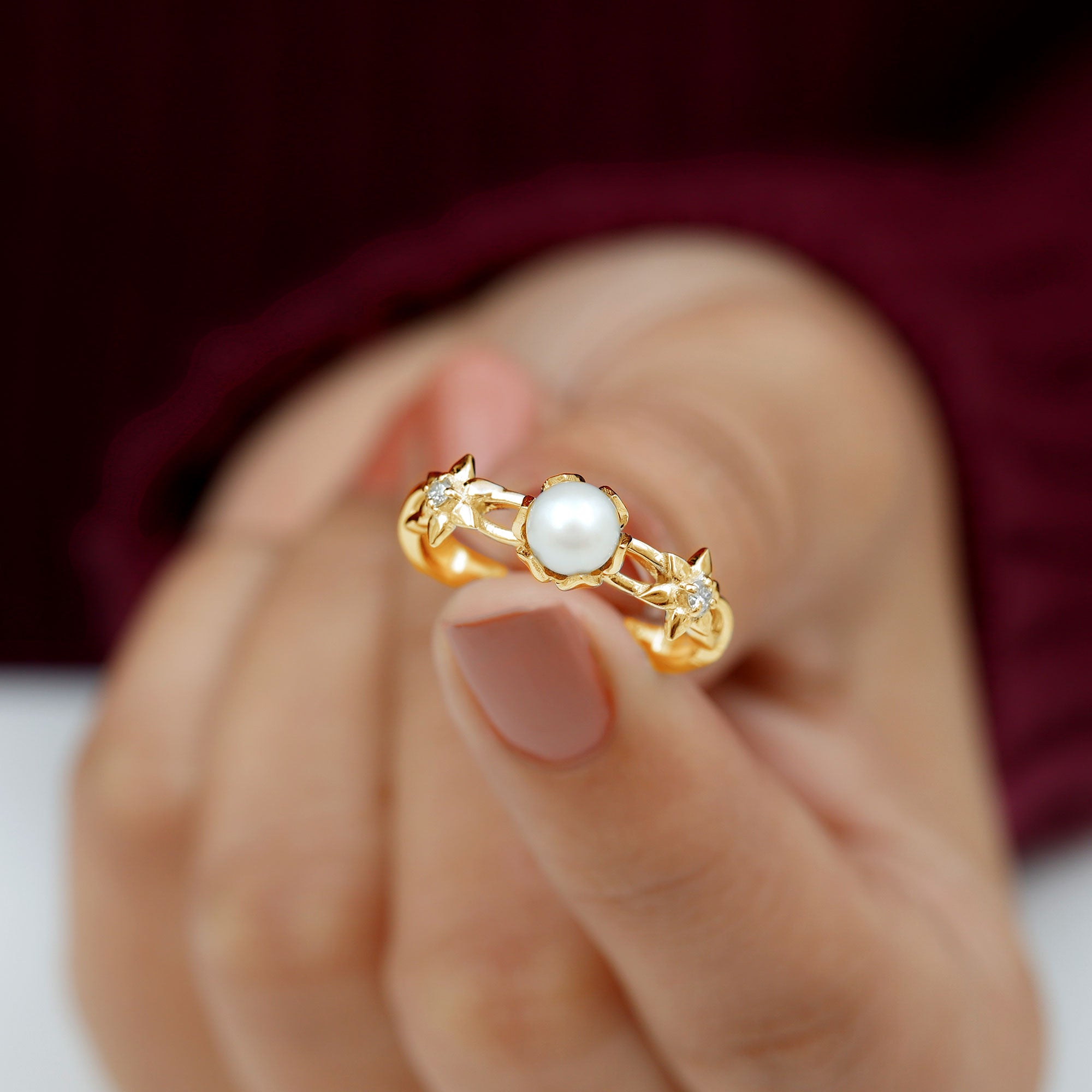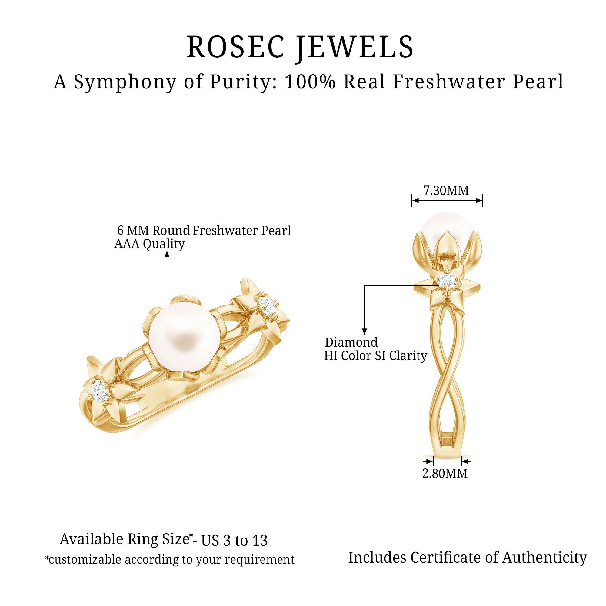 Floral Shank of this Freshwater Pearl and Diamond Ring is enchanting, it is crafted in Gold for sumptuous charm. Freshwater Pearl exhibits AAA Quality and possess subtle color. Semi Precious June Birthstone summons faith and innocence. It is Natural and Certified, helps in enhancing personal integrity and grow sincerity of the wearer. The extremely durable nature and luster makes it a captivating and desirable gem. Diamond- HI-SI Quality exhibited by Brilliant Cut Diamond give justice to its incredible value. Diamond summons beauty, attractiveness and unbreakable love. It is Certified and helps in bringing success and luxury to the wearer. Its Durability and Luster is enhanced by Lab Created Treatment, to further make it a captivating and desirable gem.