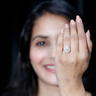 A perfect ring is a more precise ways to express emotions to your better half. This beautiful ring will make her feel on cloud nine, the Moissanite Engagement Ring effortlessly draws your attention. This ring is embellished with Round and Baguette Cut Moissanite with Halo, creating a glistening appeal. This Ring is excellent choice for Cocktail Engagement jewelry.
