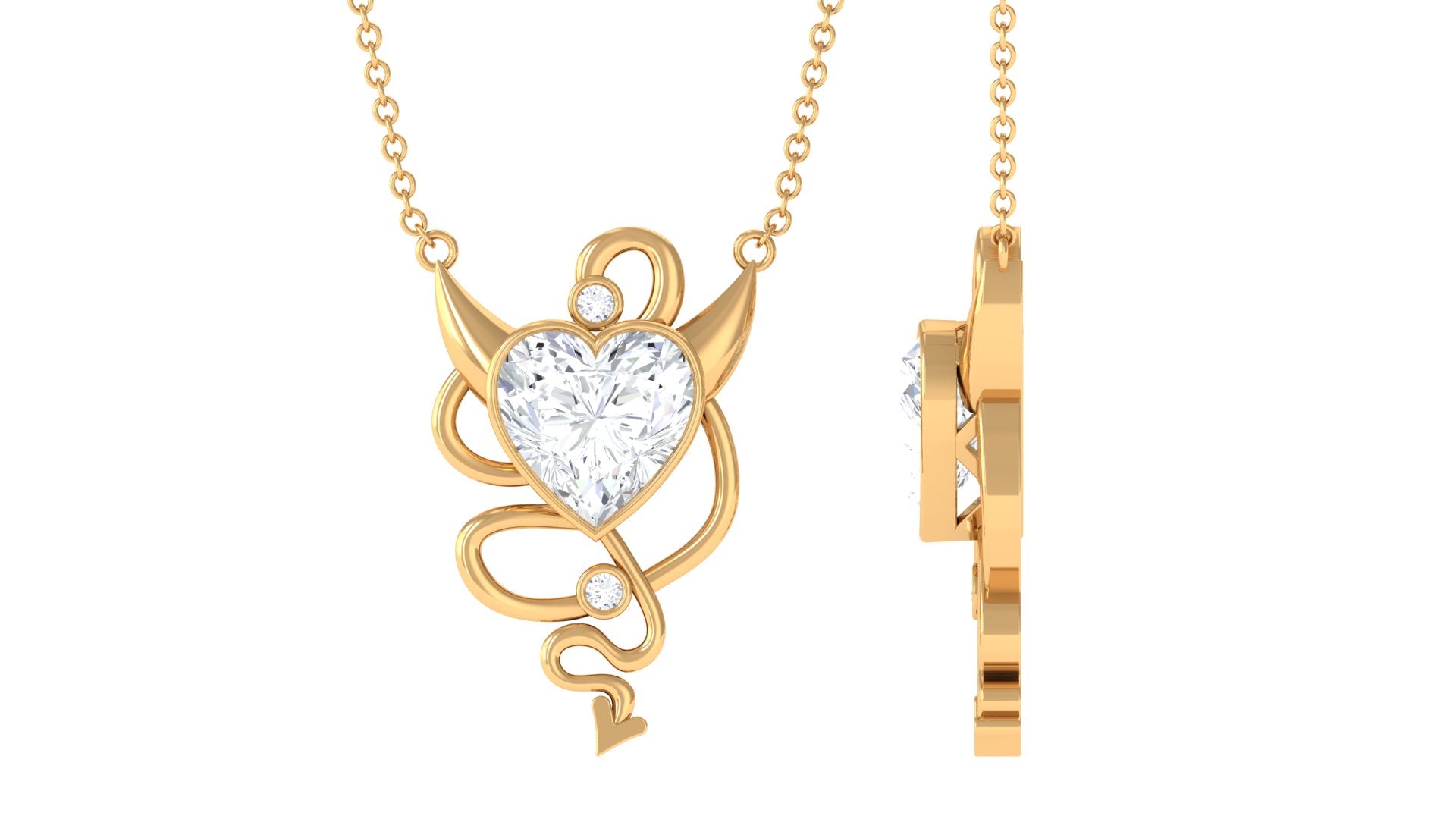 If youre looking for the perfect piece of jewelry to wear with your office attire, the Moissanite Devil Pendant is a great choice. This stunning pendant necklace features heart and round shaped Moissanite gemstones, totaling 2.25 Carats and set in a beautiful bezel setting on a gold pendant necklace. The pendant boasts D-VS1 quality and all of our gemstones are certified and undergo strict quality checks. Adorn yourself with this elegant Moissanite Devil Pendant Necklace and enjoy its beauty.