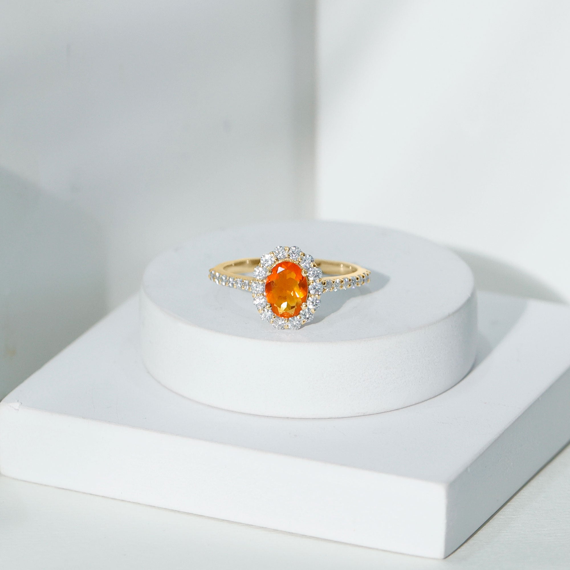 Unique Engagement Ring is the beautiful accessory engraved with Oval Cut Fire Opal as Solitaire and Round Shape Moissanite is set in Halo and Side Stone Setting. This lovely Engagement Ring makes a statement piece for women is composed of Solid Gold.