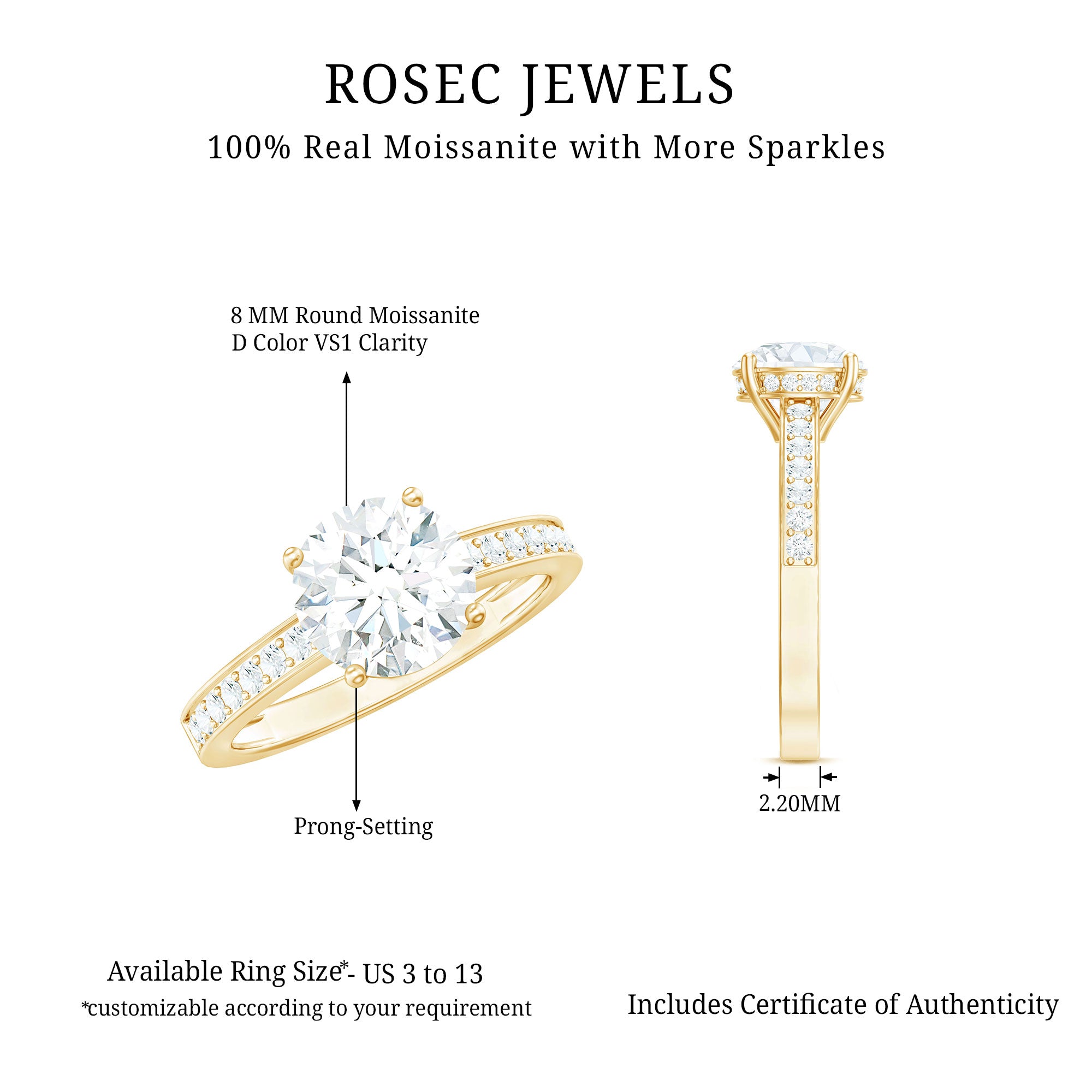 Radiating pure elegance and heartfelt sentiment, this Moissanite Solitaire Engagement Ring is a timeless symbol of love and commitment. At the heart of the ring sits a brilliant 8 MM Round Shaped Moissanite, secured in prong setting that allows it to catch the light beautifully with every move. Its exceptional sparkle and fire make it the highlight of this sophisticated design. Adding a refined touch, sparkling hidden halo beneath the main gem, and side stones gracefully set along the band, enhancing the center stone without overpowering its beauty. This thoughtful balance makes the Moissanite Engagement Ring ideal for someone who admires subtle details and refined beauty. The slender band offers a lightweight, comfortable fit, perfect for daily wear yet elegant enough to shine on life’s most meaningful occasions. Crafted with precision and care, this 2 Carat Moissanite Ring captures a modern aesthetic while honoring timeless design. Whether you are marking a new beginning or celebrating a shared journey, it adds the perfect hint of shimmer to every memory you create. The minimalist design paired with high-quality moissanite stones ensures lasting brilliance. Presented in a beautiful jewelry box, this Side Stone Engagement Ring is ready to be cherished as a symbol of enduring love and elegant simplicity. Designed for those who believe in forever, it is a piece that speaks from the heart with every glance.