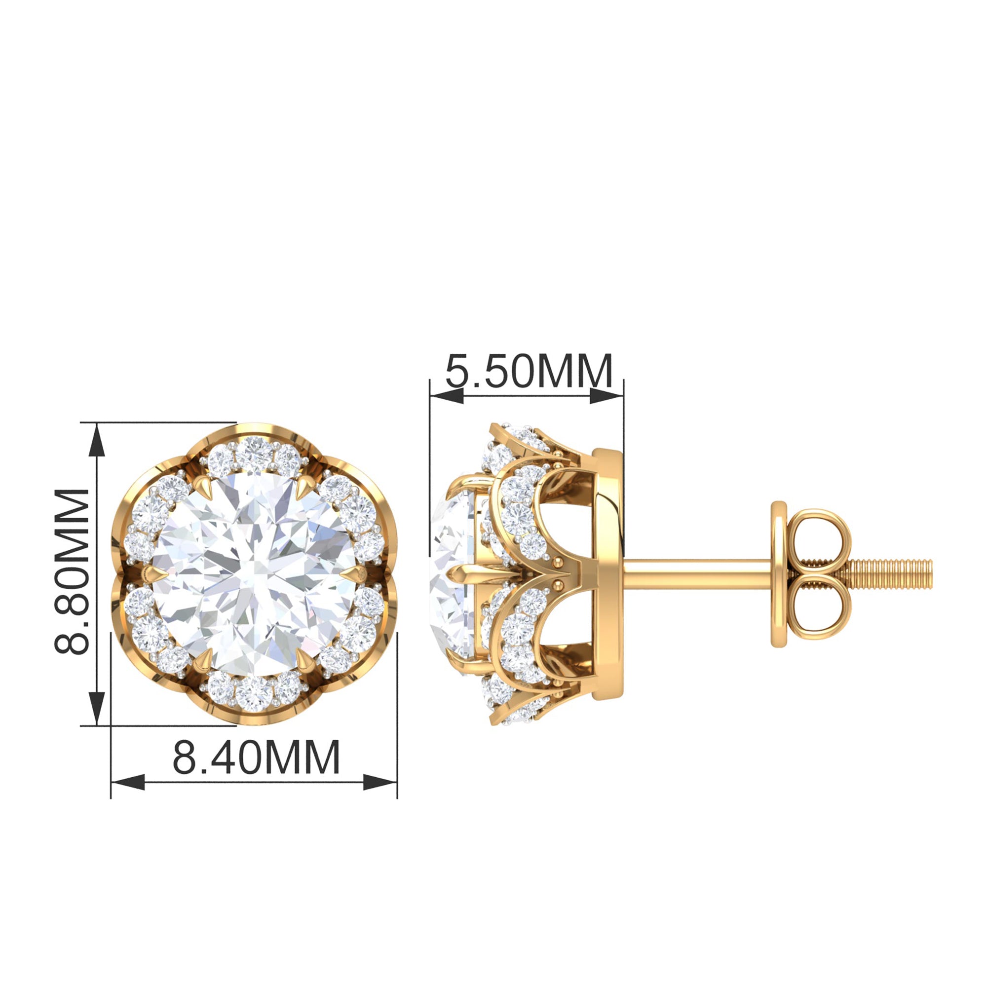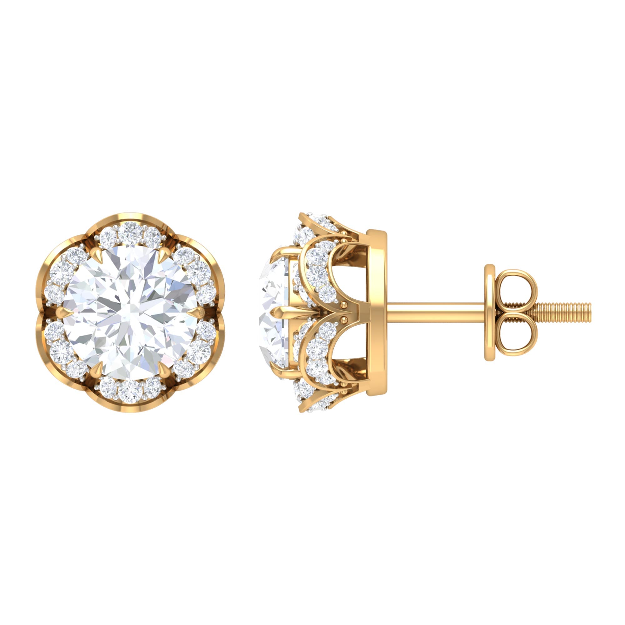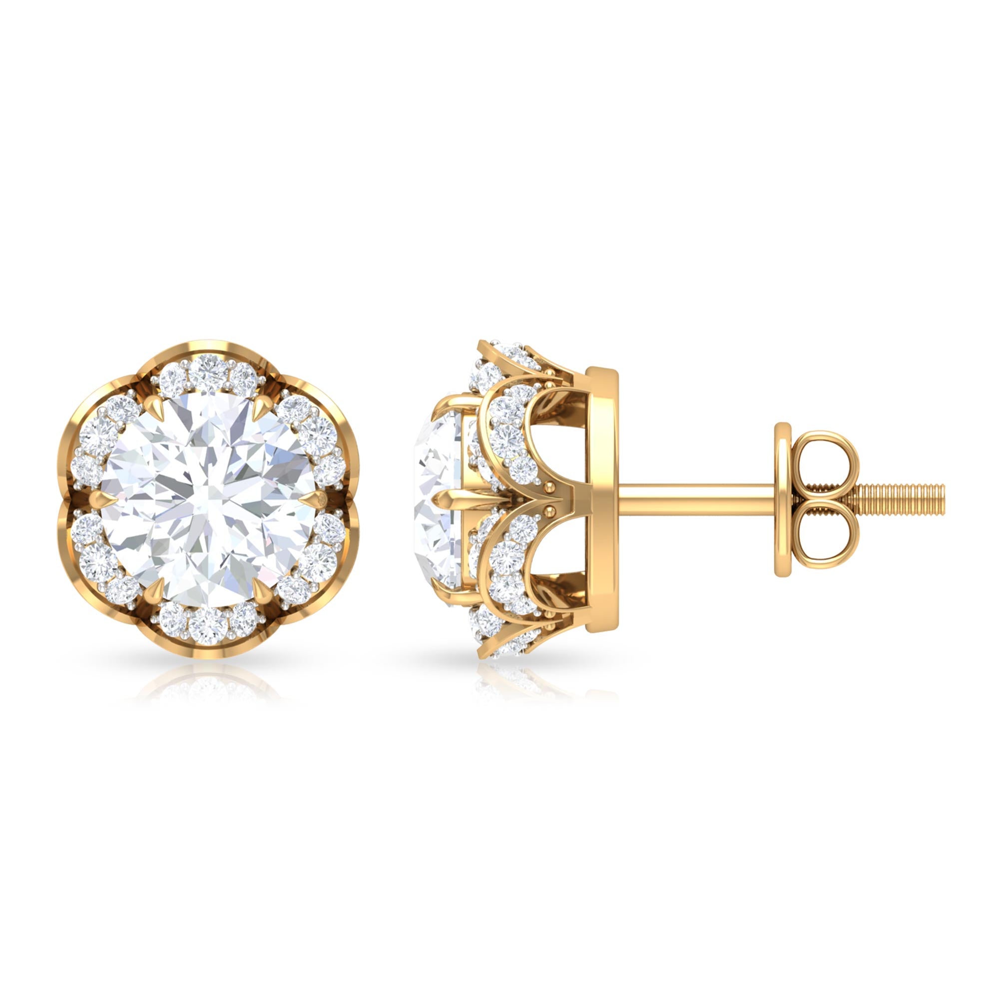 Achieve a fashionable and elegant look with these exquisite Floral Stud Earrings embellished with Round Cut Moissanite gemstones set in a captivating floral setting. Crafted with high-quality metal, these Moissanite Stud Earrings will not only add a touch of sophistication to your ensemble but also make you radiate like the blooming flowers themselves.