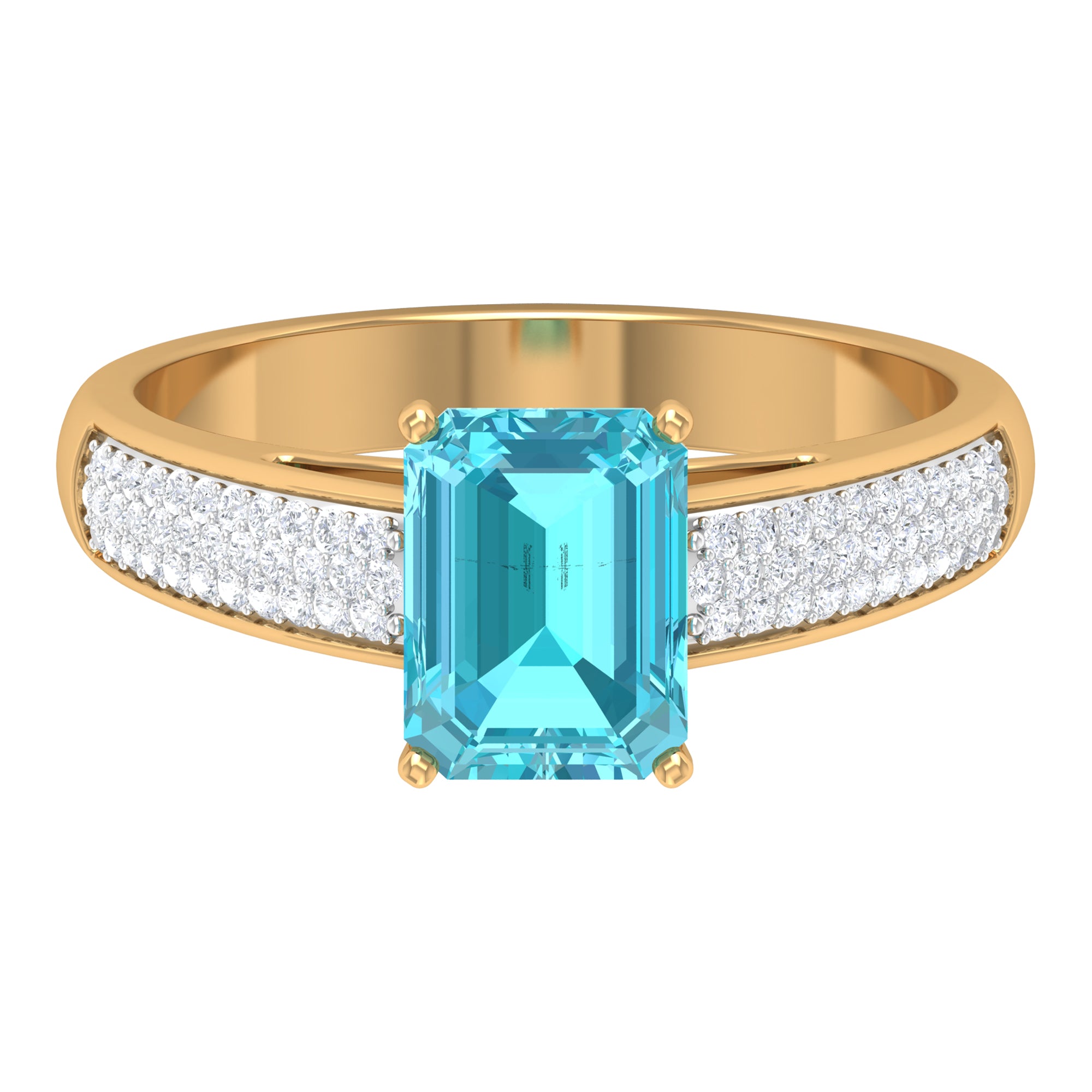 Mark the big day of your life with this classic Solitaire Ring adorned with Emerald Cut Swiss Blue Topaz in Prong Setting and Pave Set Diamond. The ring is crafted with Solid Gold to make for a luxurious choice for the special occasion of your life.
