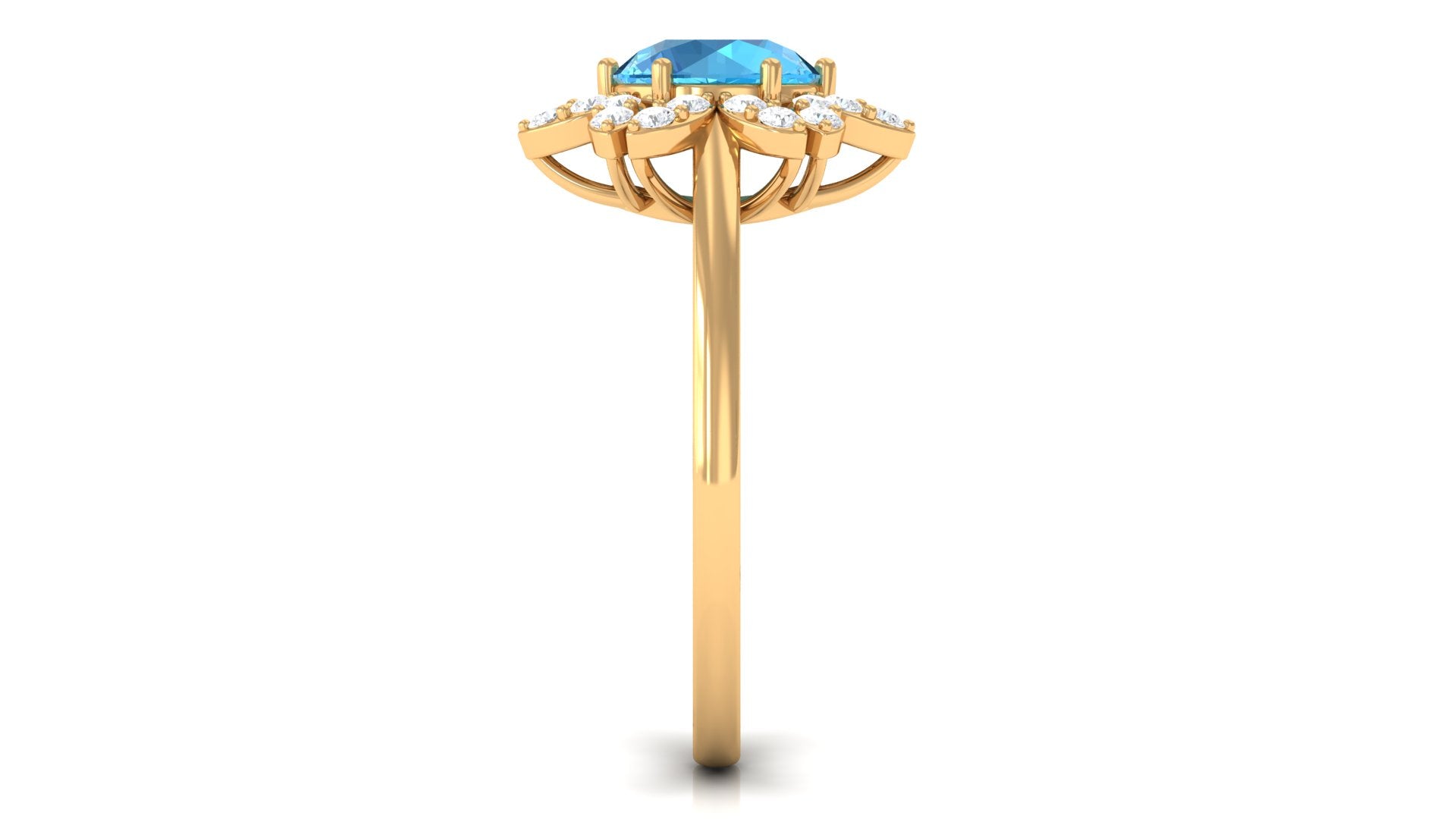 Adorn yourself in the delicate elegance of our Floral Ring, designed to make you bloom like a flower. This exquisite piece features a captivating Round Shape Swiss Blue Topaz, securely cradled in a 6 Prong Setting. The bloom is further enhanced by a brilliant Round Shape Diamond Halo, adding a touch of timeless sparkle. Meticulously crafted, this ring symbolizes the beauty of growth and the radiance that unfolds with every precious moment. The vibrant blue of the Swiss Blue Topaz captures the essence of tranquility, while the surrounding Diamond stones illuminate the piece with an everlasting brilliance. Embrace the enchantment of natures beauty and the promise of enduring elegance with this captivating floral-inspired ring.