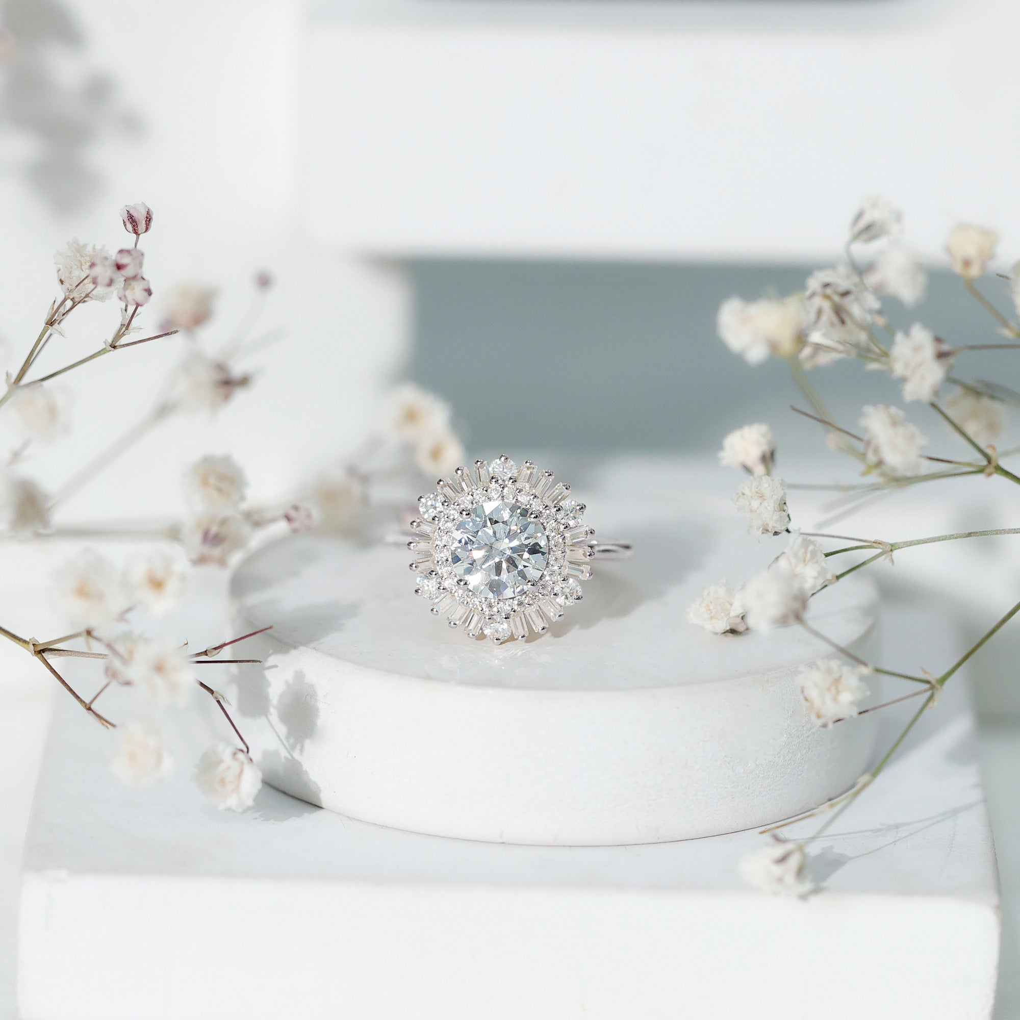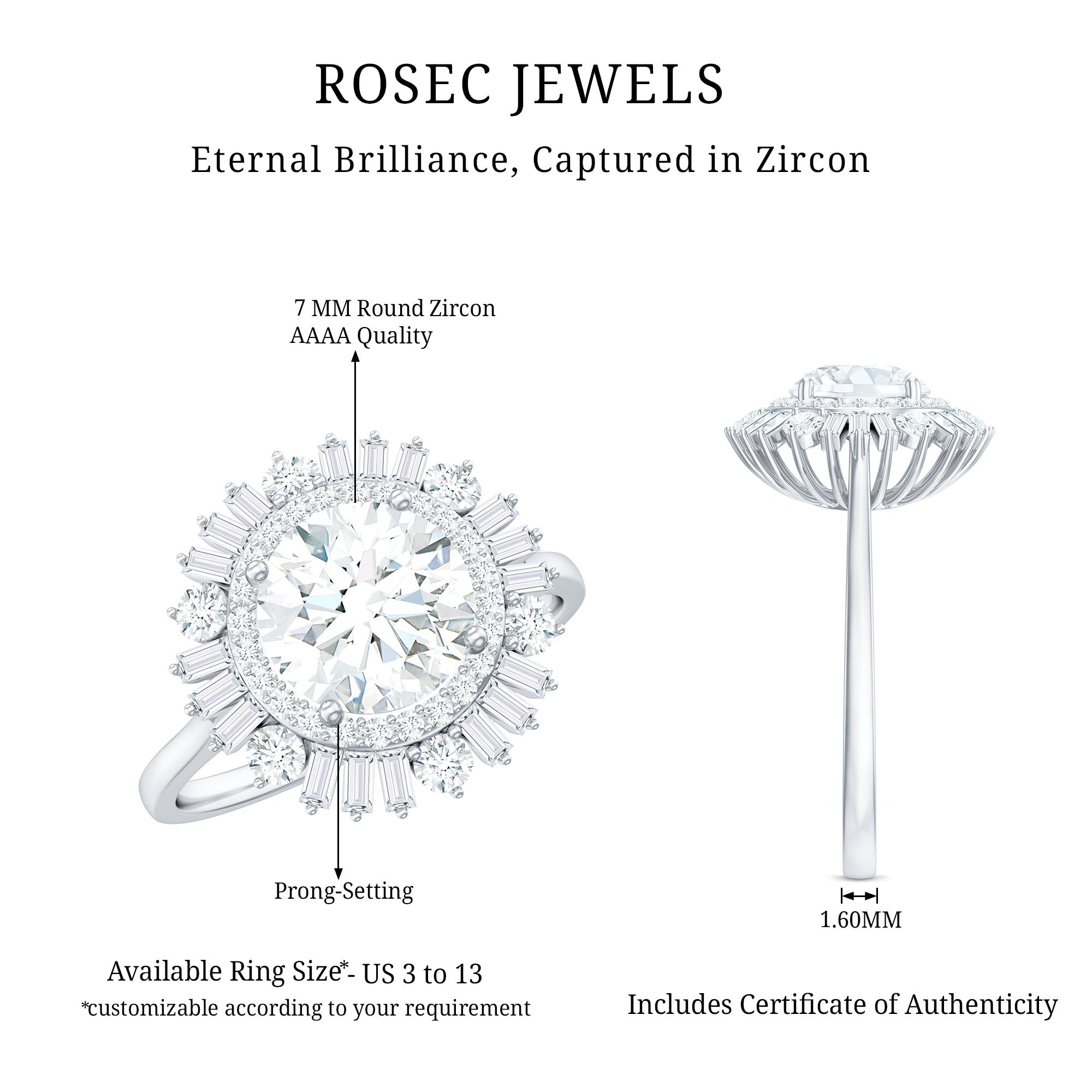 A perfect ring is a more precise way to express emotions to your better half. This beautiful cubic zirconia ring will make her feel on cloud nine, the Zircon Engagement Ring effortlessly draws your attention. This halo engagement ring is embellished with Round and Baguette Cut Zircon with Halo, creating a glistening appeal. This Zircon Ring is an excellent choice for Cocktail Engagement jewelry.
