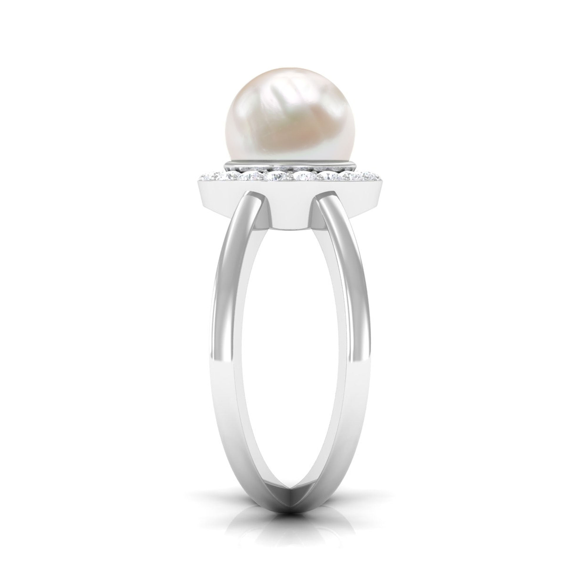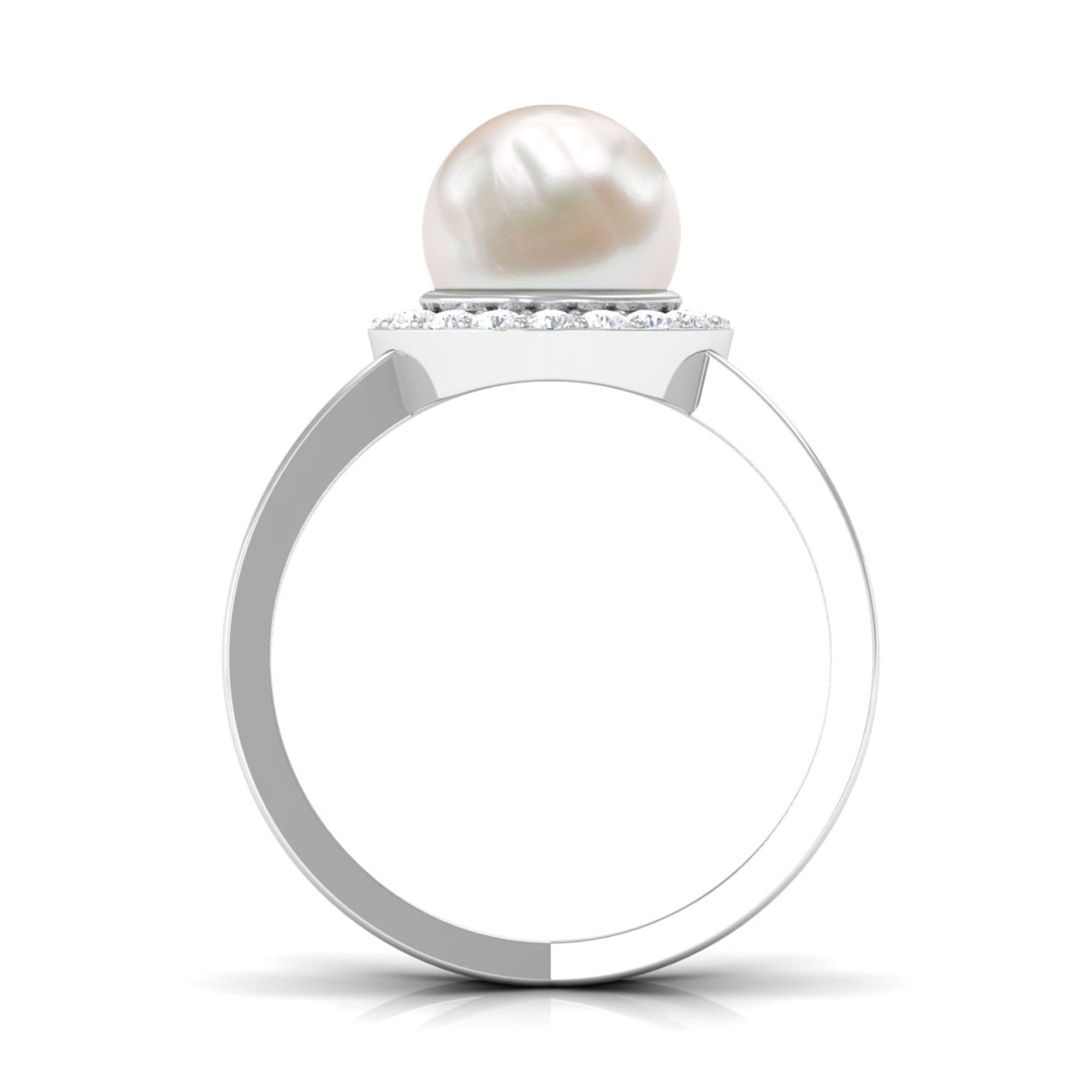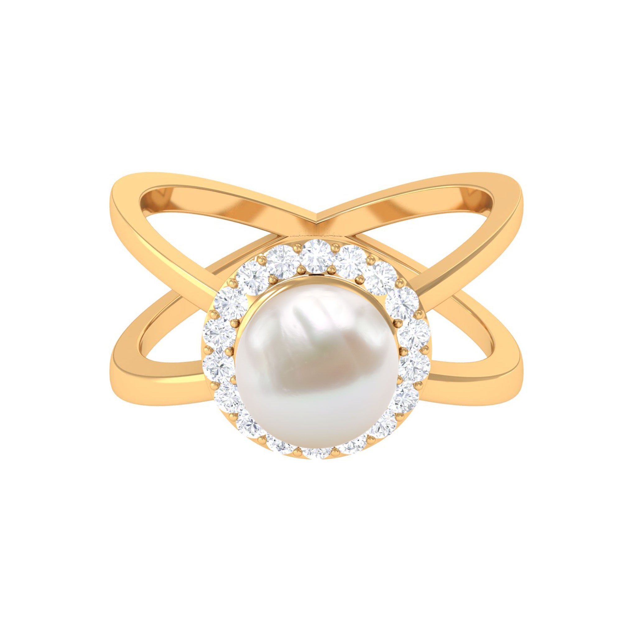 Make a bold statement with our exquisite Unique Ring, featuring a lustrous Round Shape Freshwater Pearl as its centerpiece, surrounded by a sparkling halo of Diamond stones. The combination of these gems creates a stunning contrast, elevating the overall beauty of the ring. The band has been expertly crafted in Solid Gold and features an intricate crisscross shank design, adding an extra touch of elegance and uniqueness to the piece. Whether youre dressing up for a special occasion or looking for a stylish accessory to complement your everyday attire, this Pearl Ring is sure to make you stand out with its timeless beauty and sophistication.