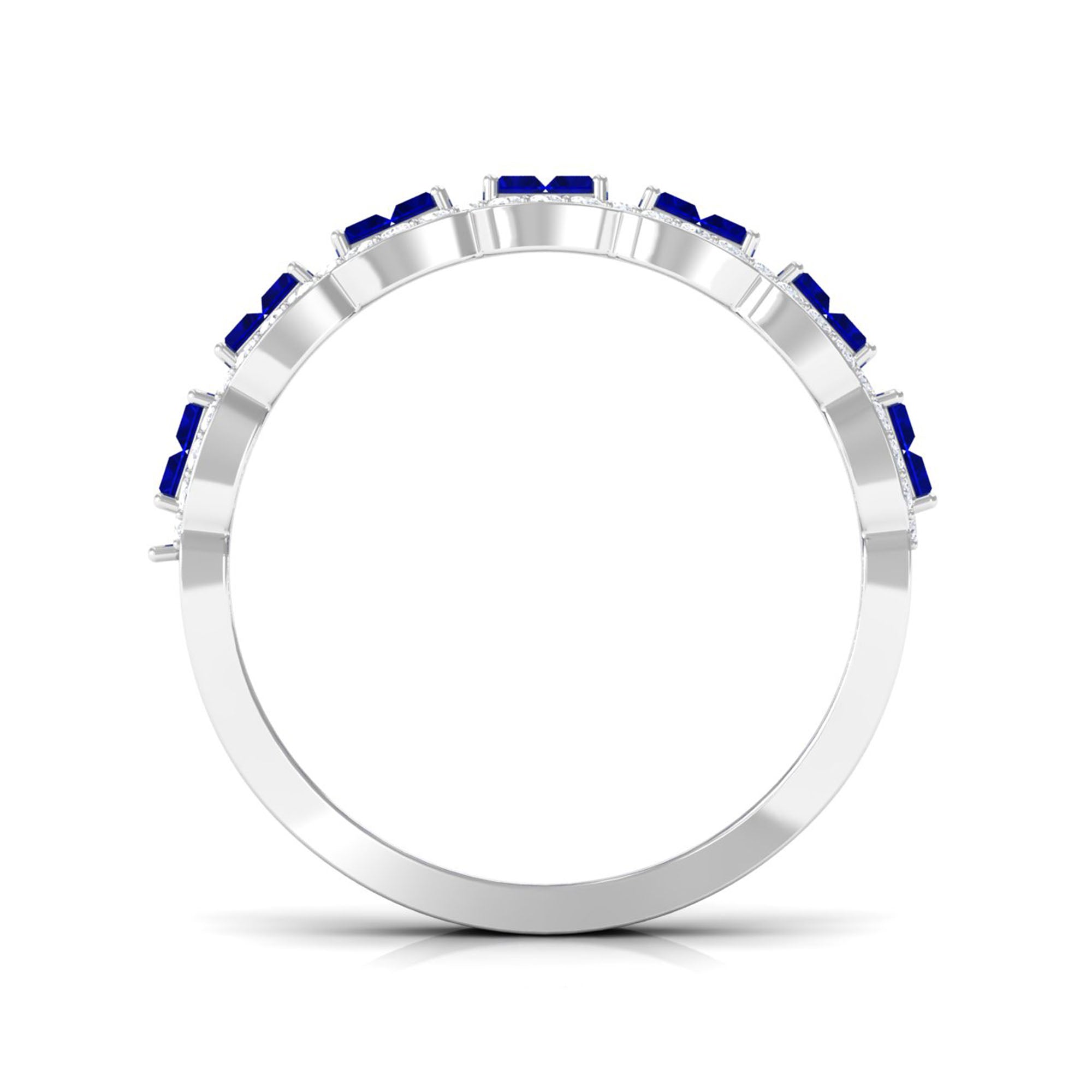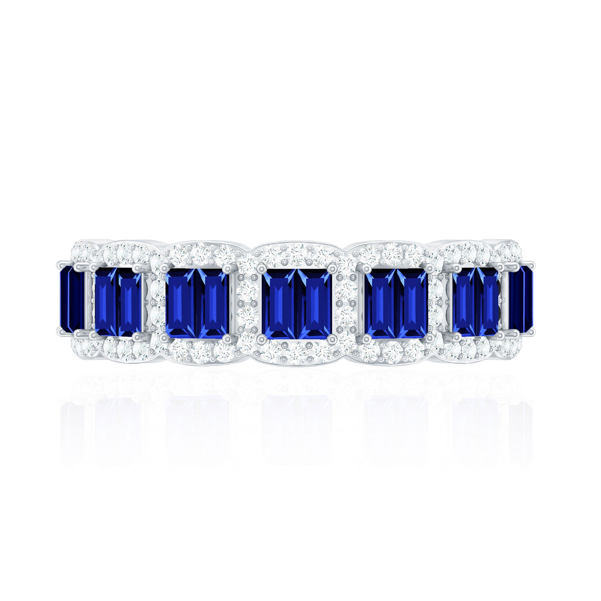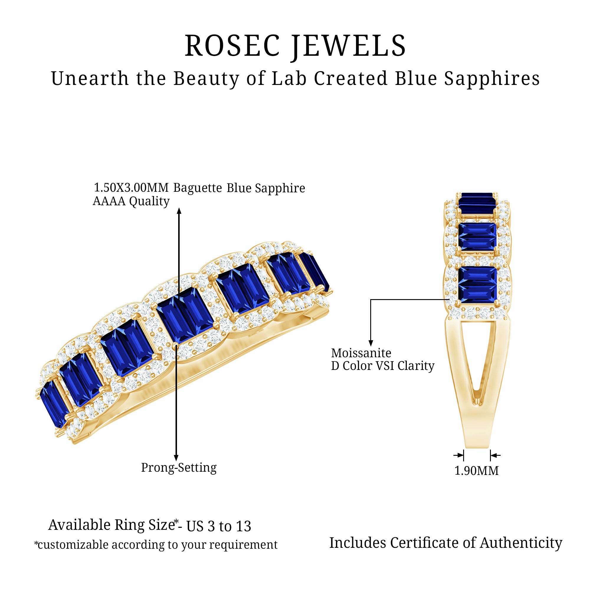 Express your love with this Designer Half Eternity Ring for your lady love. This Classic Stunning Semi Eternity Ring is embellished with Baguette Shape Created Blue Sapphire with Moissanite Accents. This Wedding Ring is crafted in high quality metal.