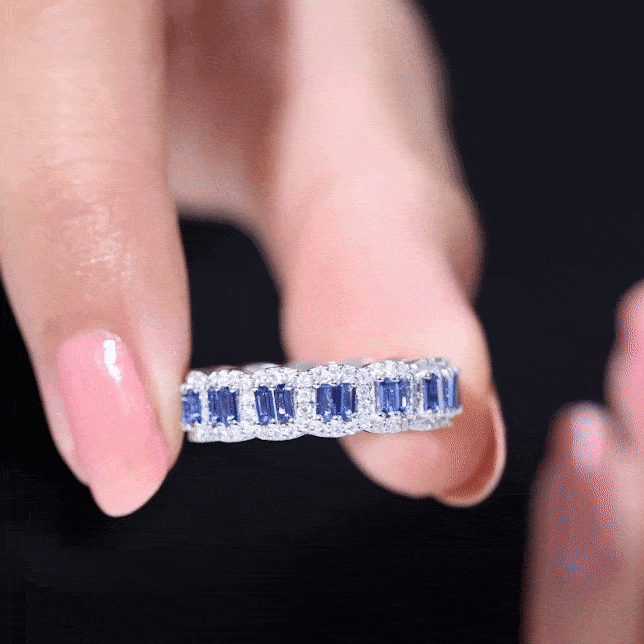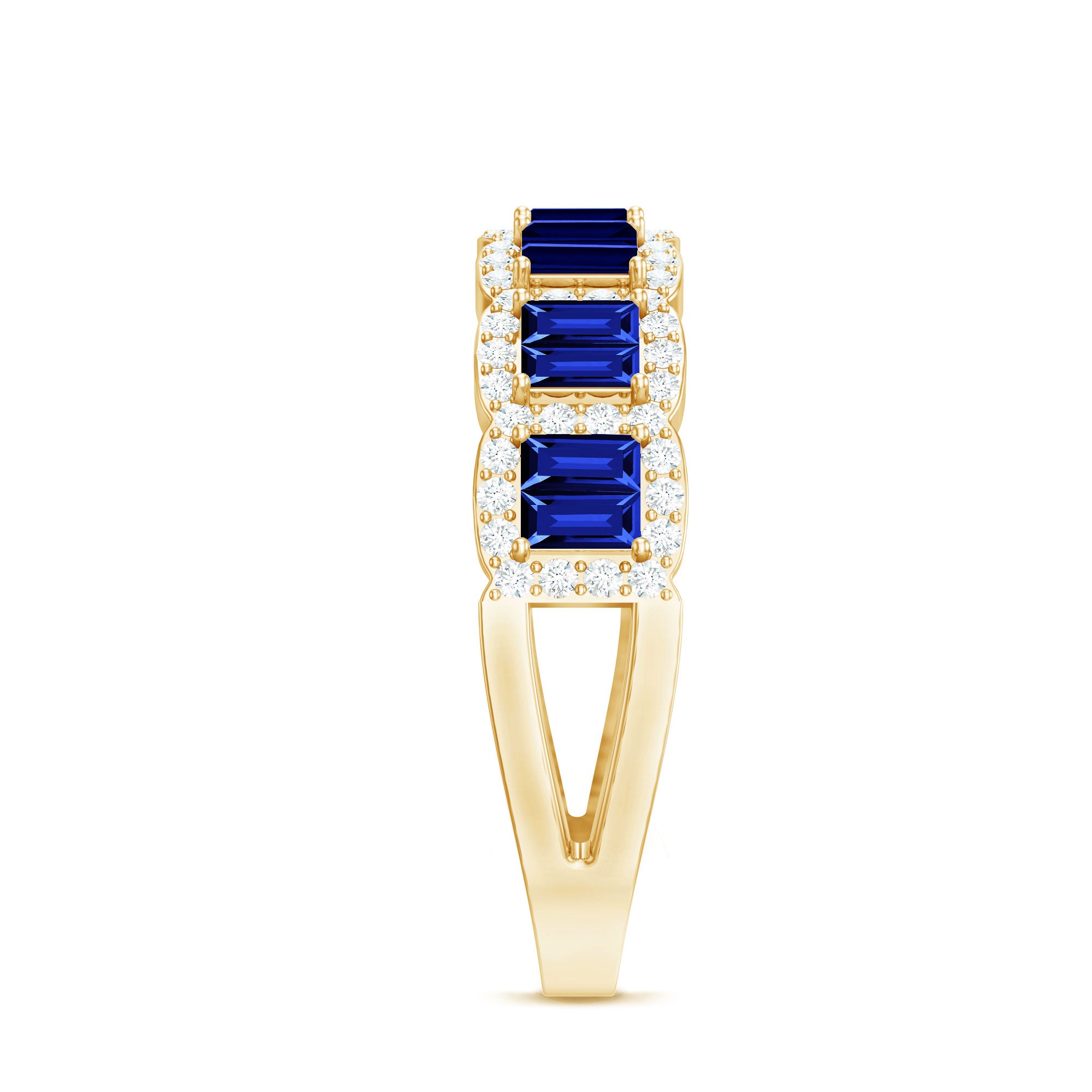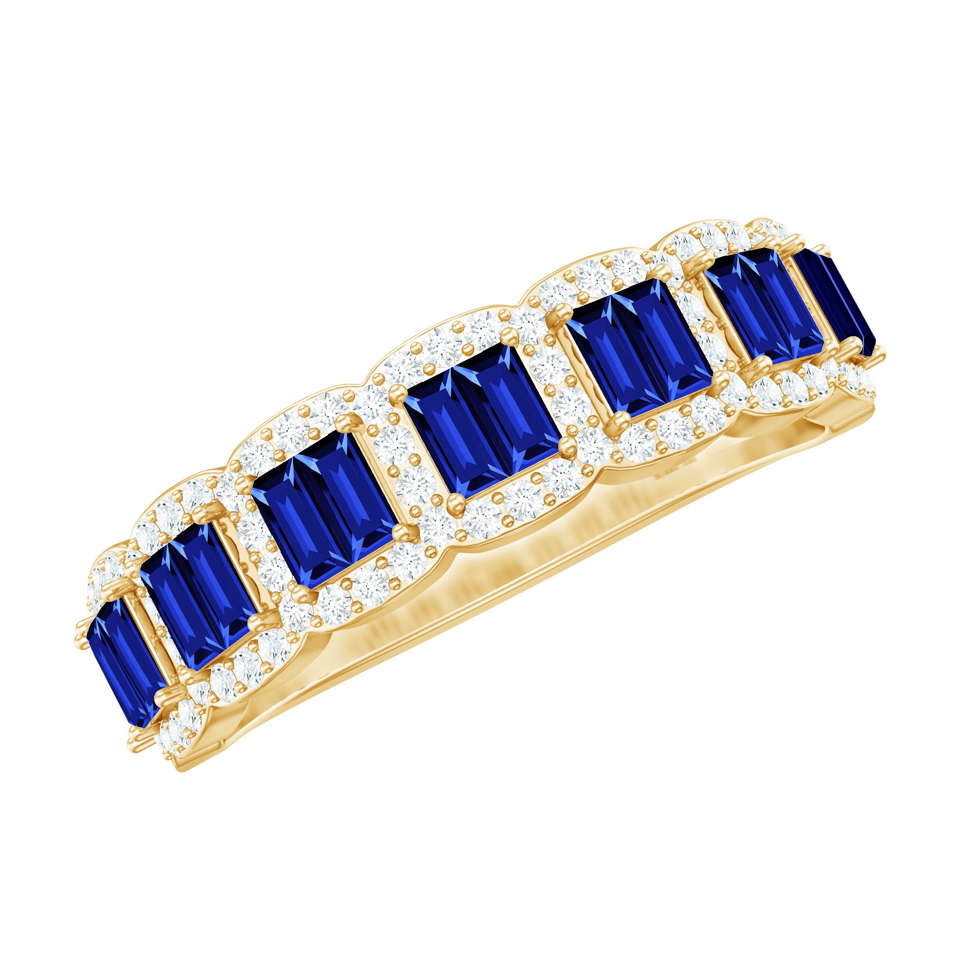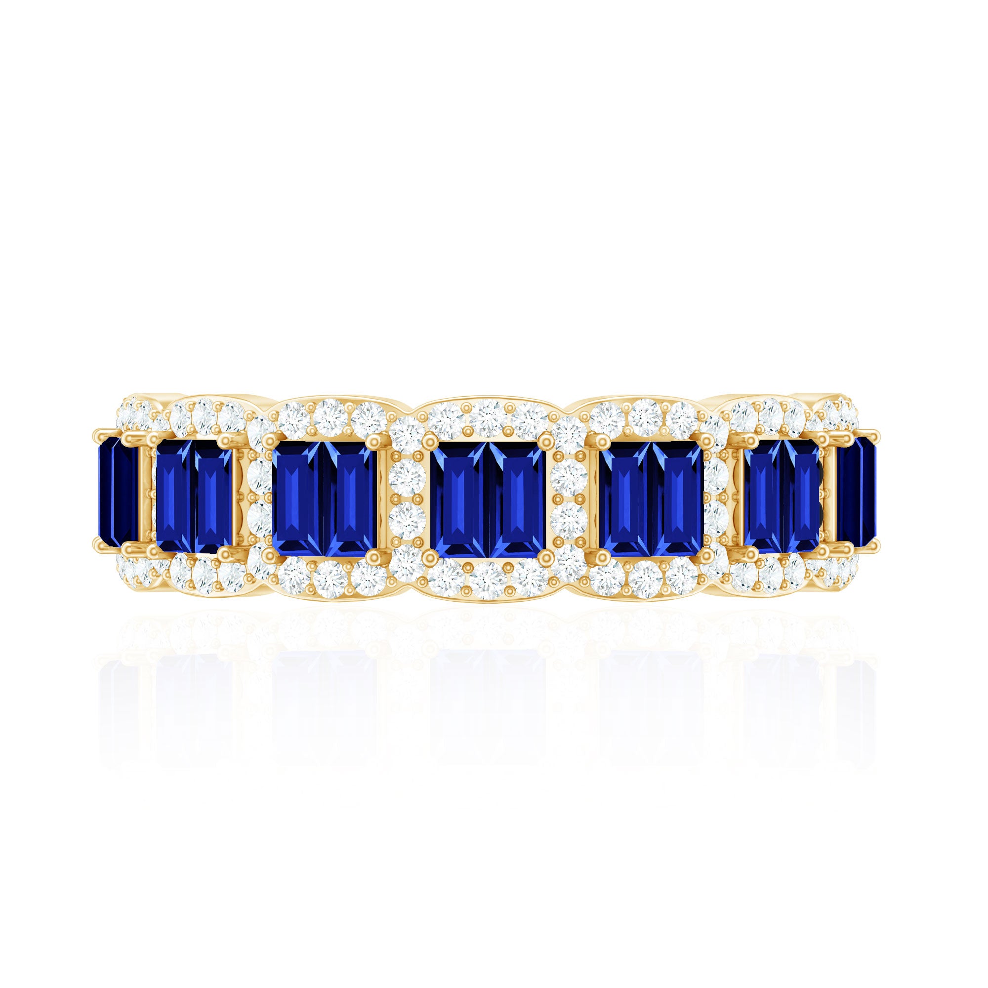 Express your love with this Designer Half Eternity Ring for your lady love. This Classic Stunning Semi Eternity Ring is embellished with Baguette Shape Created Blue Sapphire with Moissanite Accents. This Wedding Ring is crafted in high quality metal.