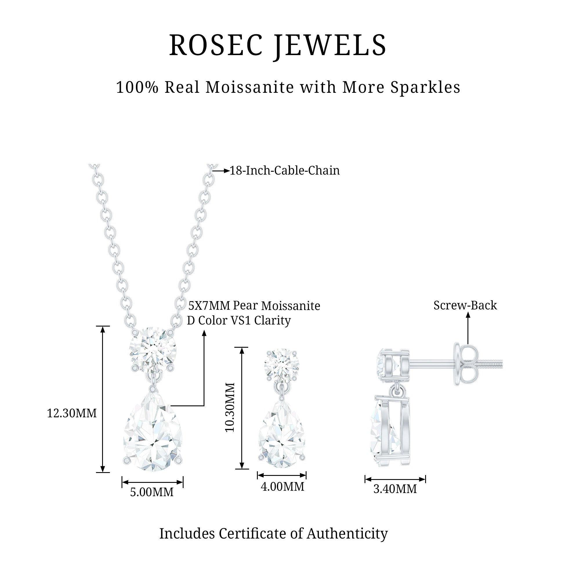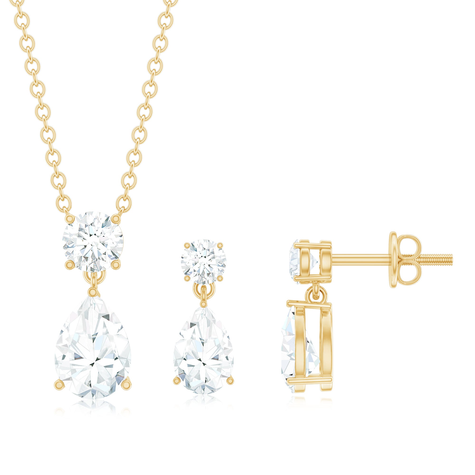 Designed to allure, the teardrop jewelry suite consists of a drop pendant necklace and a matching earring pair. Uniquely crafted with a pear shaped moissanite and topped by a round moissanite, the necklace earring set is utterly beautiful. Prong set one below the other, the moissanite exudes an exceptional brilliance, that make the two-stone jewelry set a glistening addition to your jewelry kit. The necklace comes with a connected chain, while the earring pair is complete with screw back posts.