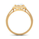 This Simulated Diamond Engagement Ring is one where the Oval Cut Zircon is oriented horizontally on the band along with Round Cut small zircon creating a Halo all around and adorning with Side Stones. Beautiful East West Cubic Zirconia Ring will make her eyes glitter with your love. Crafted in Gold.