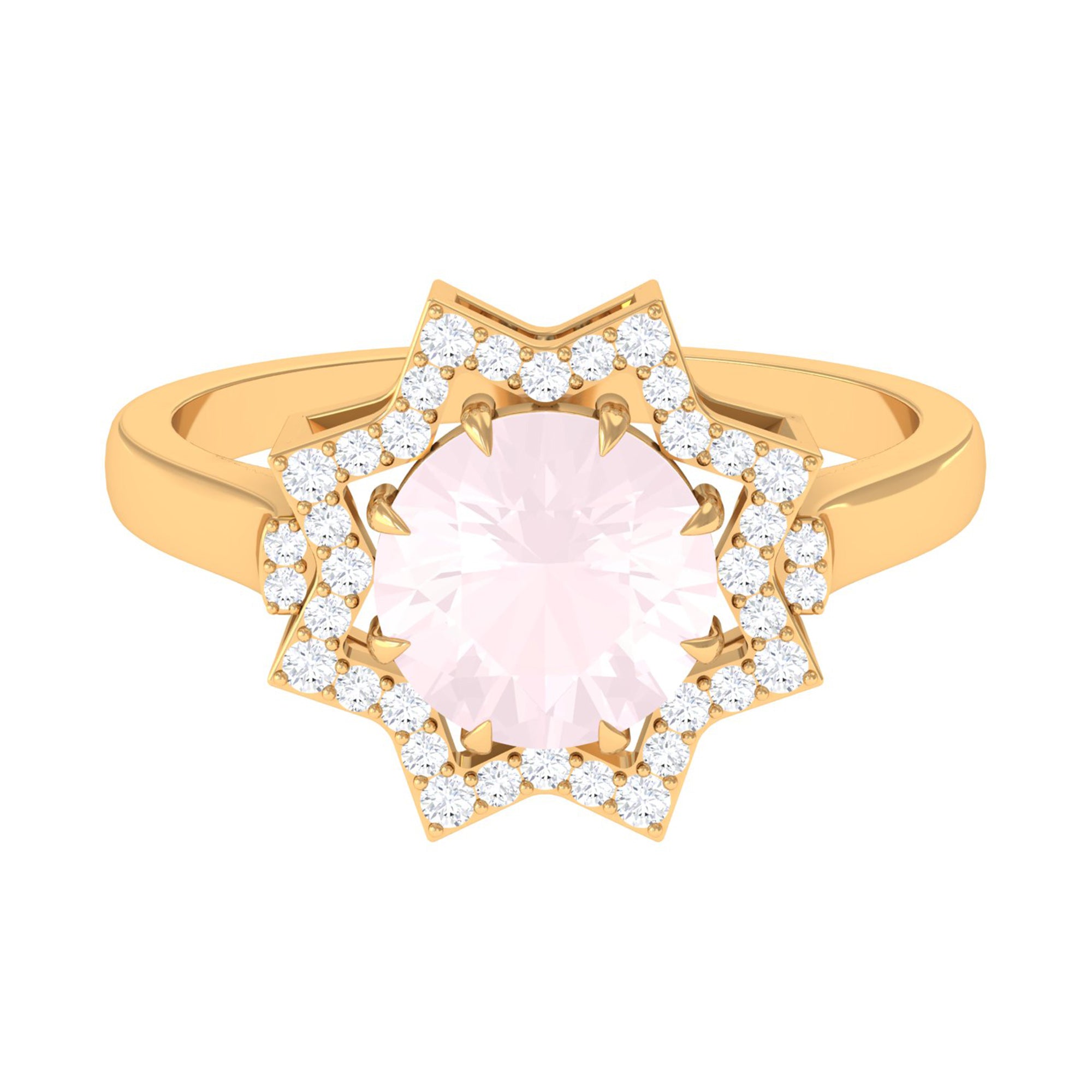 Shine like a star in our Rose Quartz Engagement Ring featuring Round Shape Rose Quartz in Claw Setting with Diamond creating a star shape all the center gemstone. This Statement Engagement Ring is adorned in Gold and is the perfect excuse for you to spoil your favorite women. This delicate and timeless Rose Quartz Jewelry is the perfect symbol of your love.