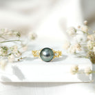 This Tahitian Pearl Engagement Ring draws inspiration from the elegant flower pattern, and is an absolute delight for the senses. The fiery black pearl gemstone amid a dazzling round Diamond on both side that highlights its ravishing hue. Beautifully carved flower motifs on the gold shank add to the allure of this Tahitian Pearl and Diamond ring.