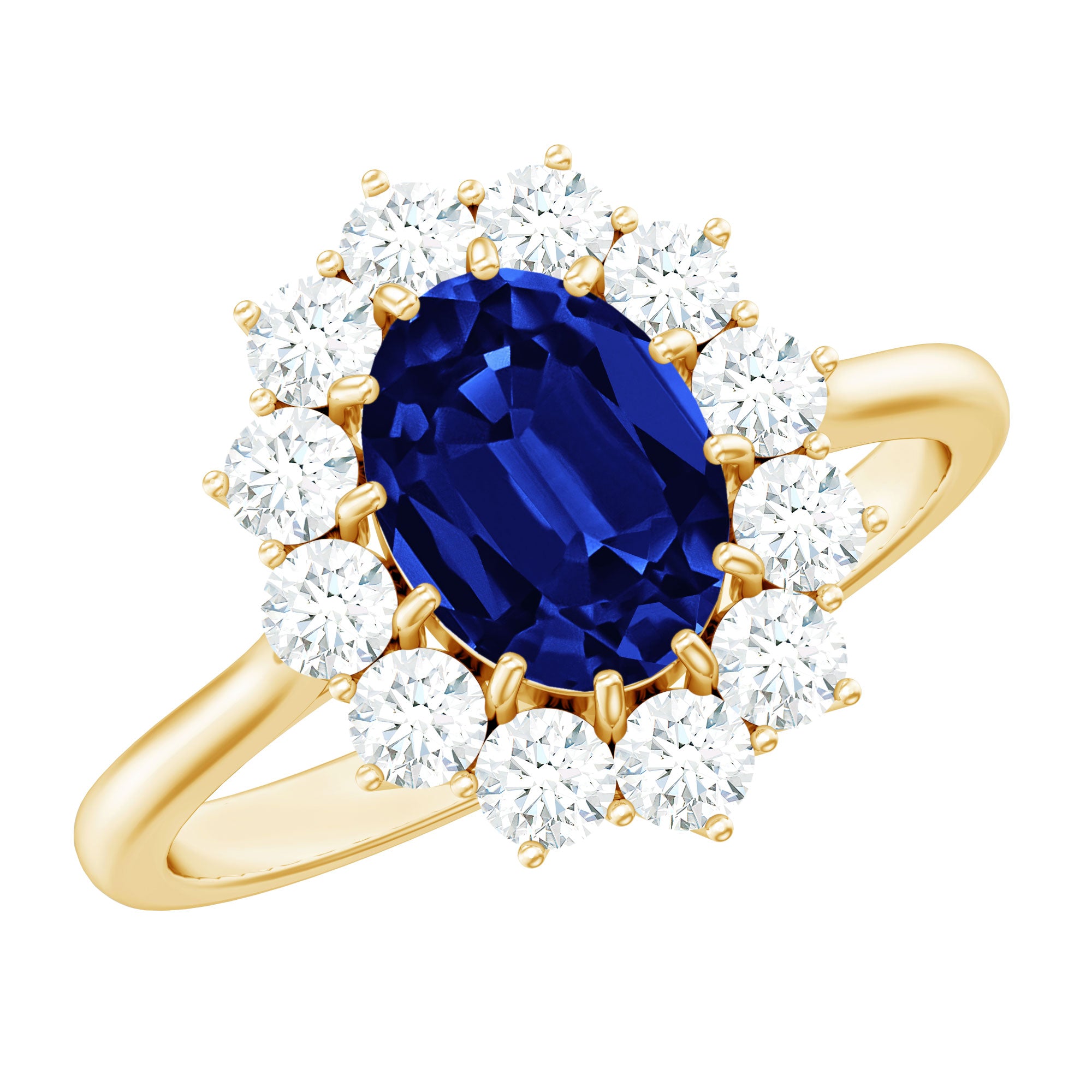 This Stunning and Classic Ring is embellished with Oval Shaped Lab Created Blue Sapphire Solitaire encircled with Small Round Shaped Diamond stones set as Halo in Prong Setting. The ring is crafted with Gold. Express your love by presenting this ring to your lady.