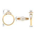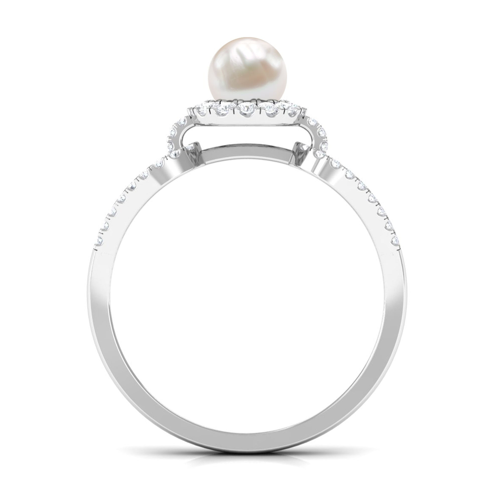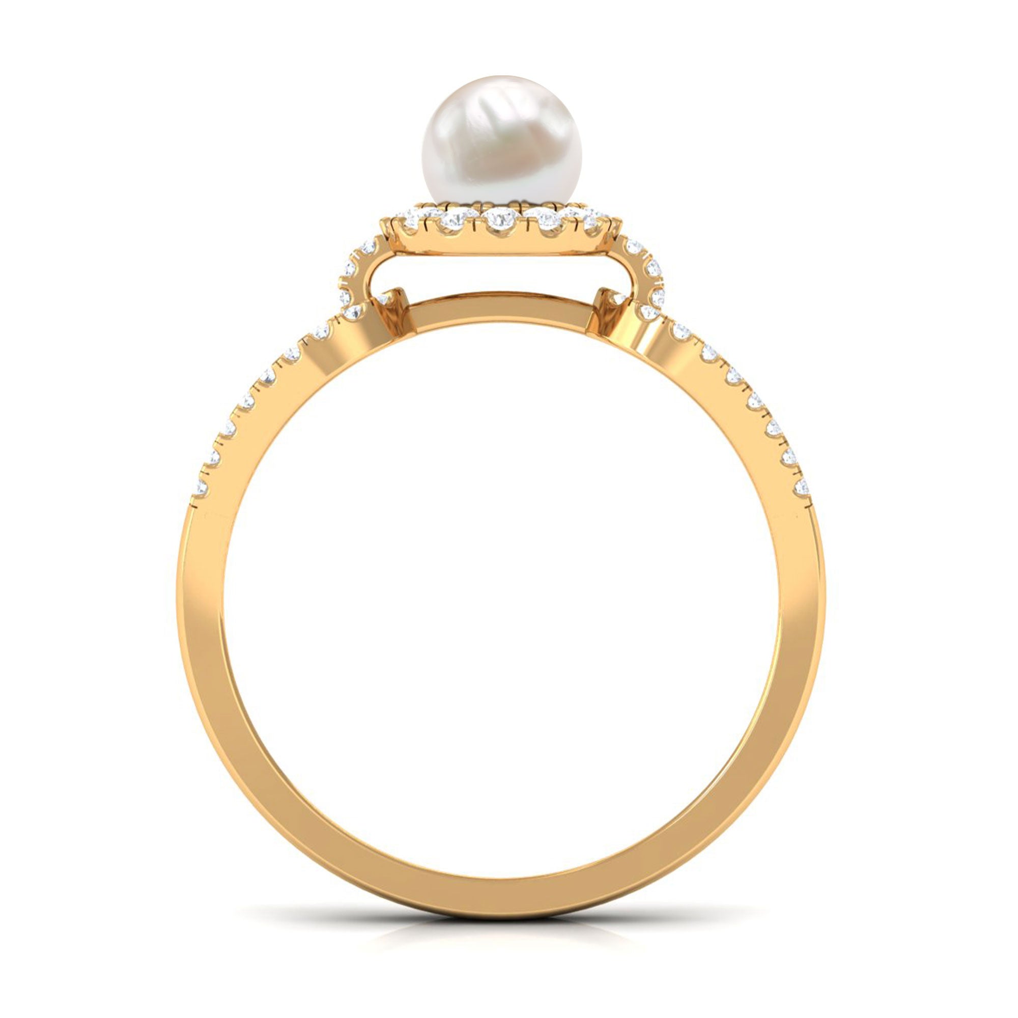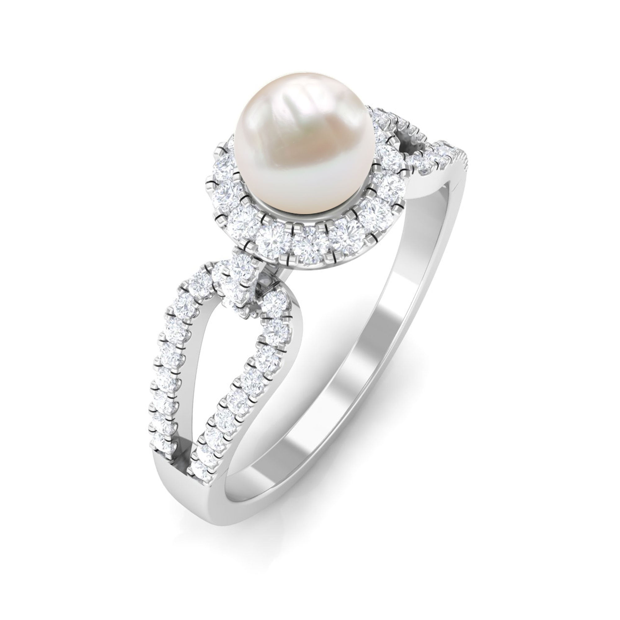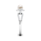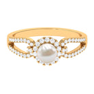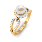 With a contemporary split shank design this ring has a unique solitaire white pearl with shining metal and a sculptural look. Amazingly crafted in Gold with a round shape Freshwater Pearl surrounded by a classic Diamond halo and side stone. Stunningly adorn yourself with this timeless Freshwater Pearl jewelry.