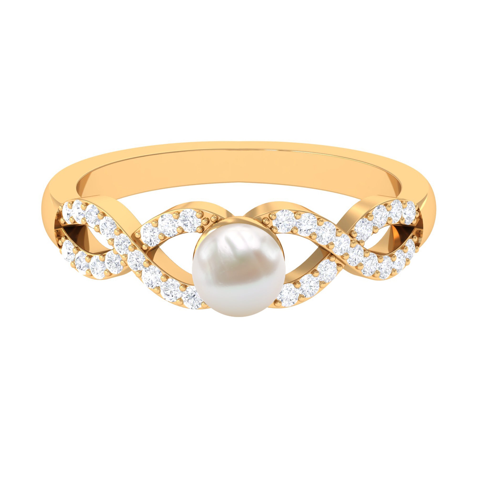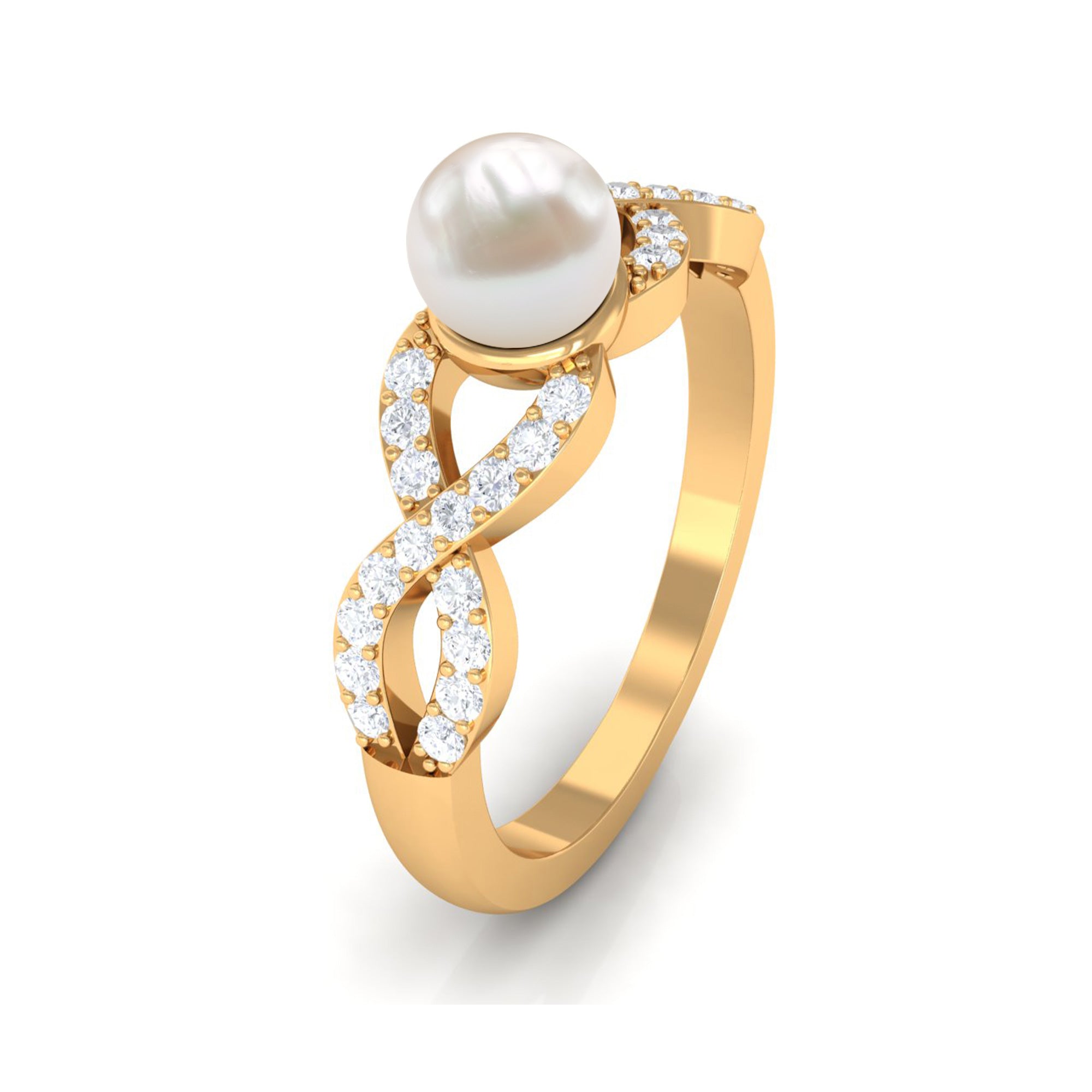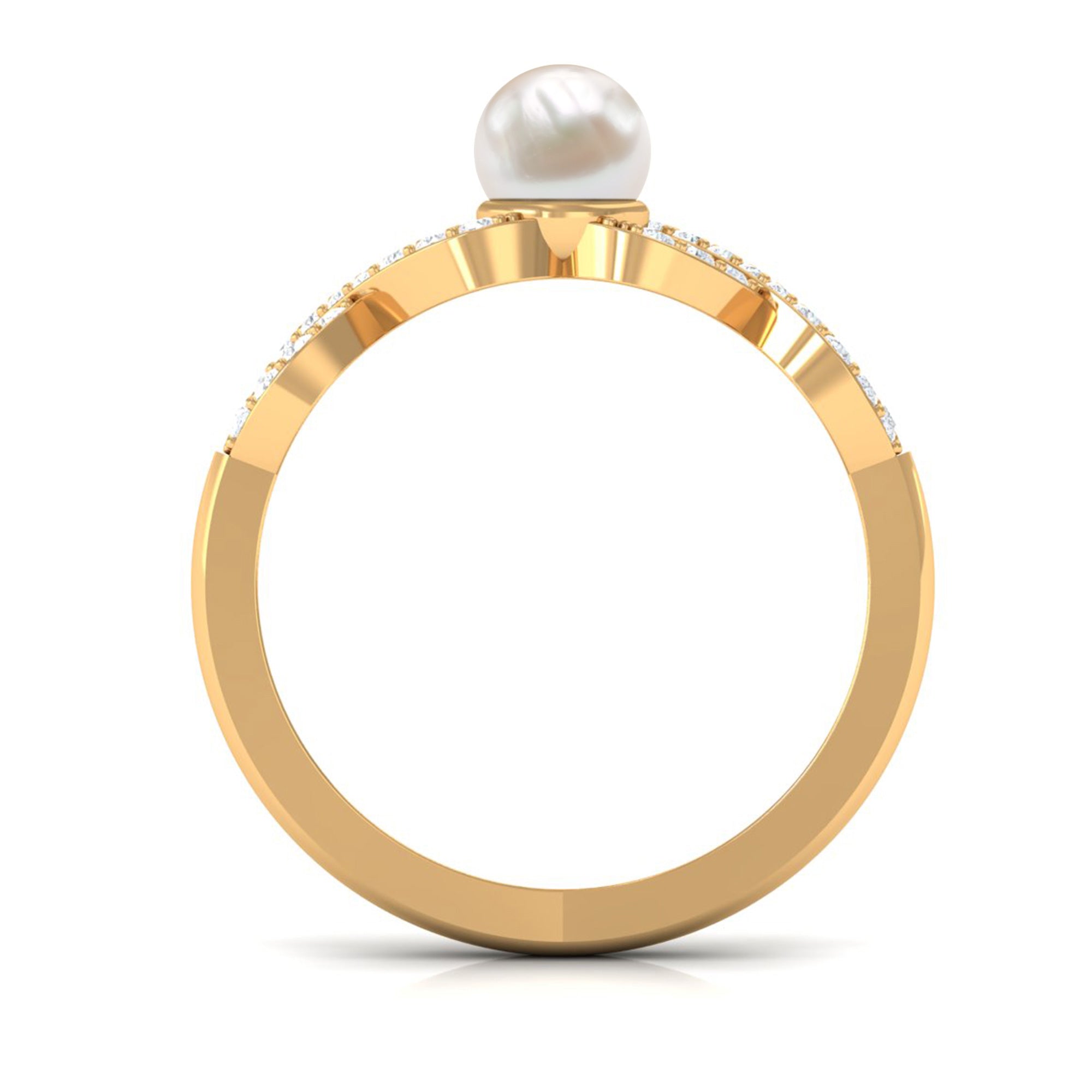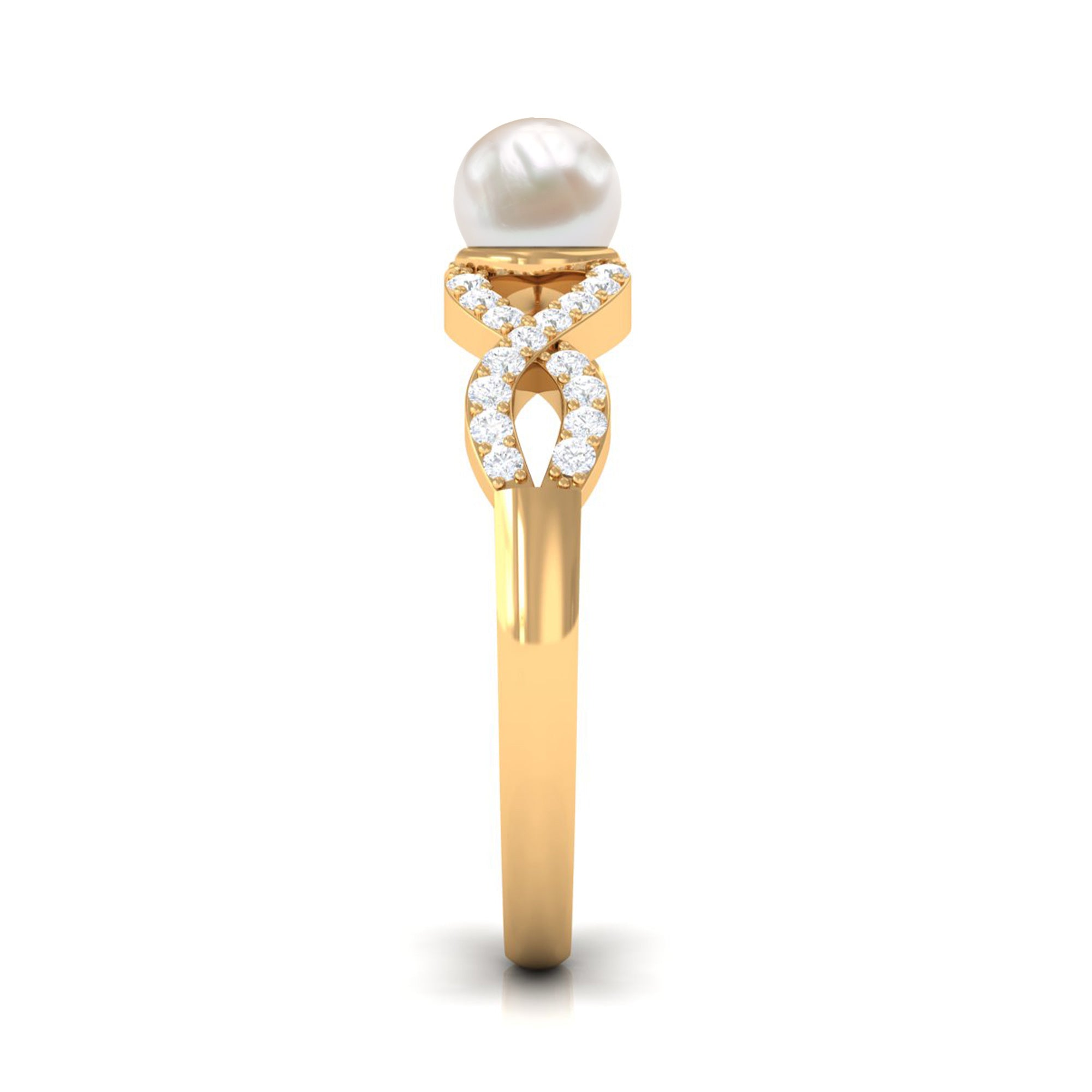 Sparkle effortlessly at every gathering with this Freshwater Pearl and Diamond Ring. It is a Gold Crossover Ring adorned with Round Shape White Freshwater Pearl as main Stone with Diamond set as side stones on the crossover shank. This Freshwater Pearl Engagement Ring with Diamond Accent is crafted in Gold.
