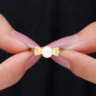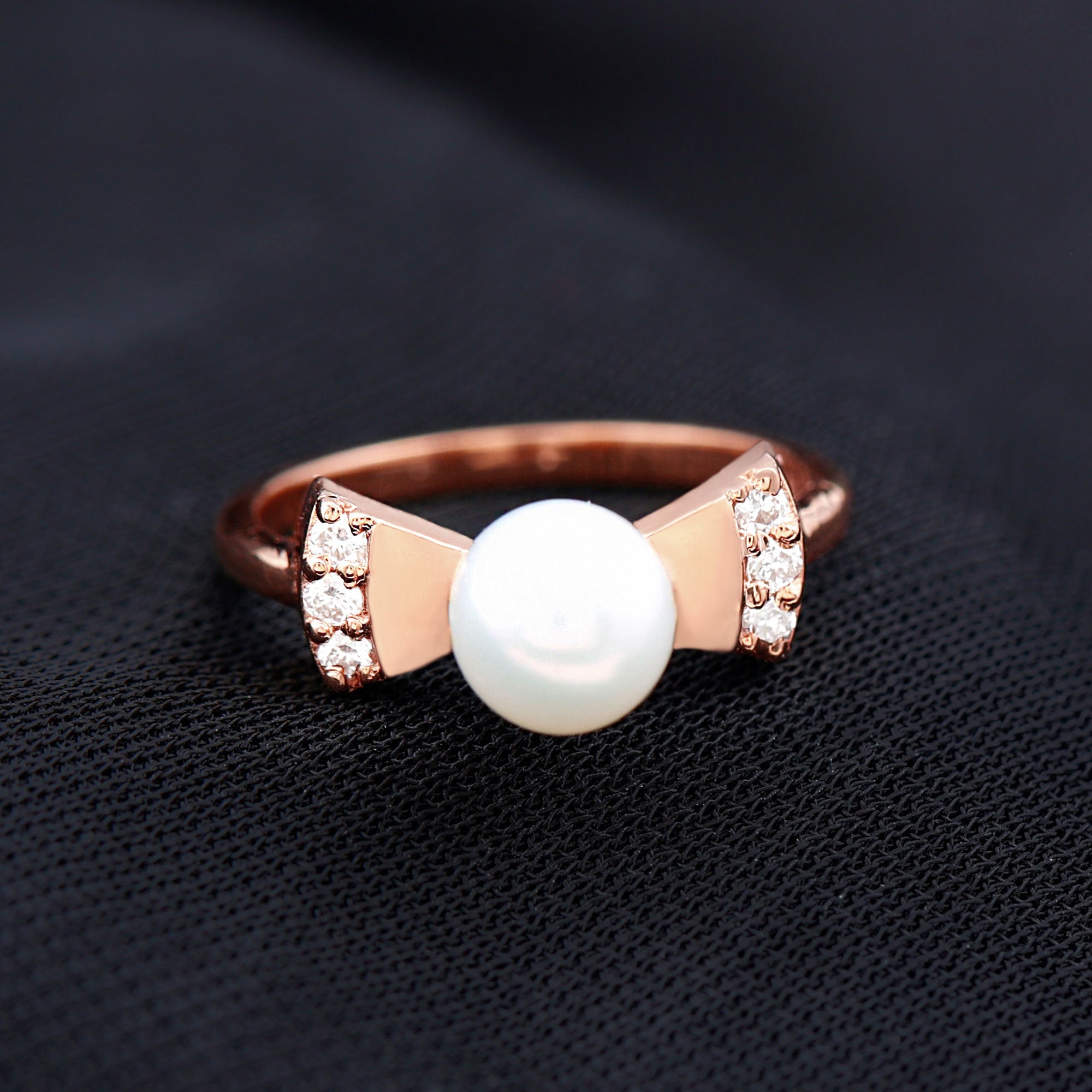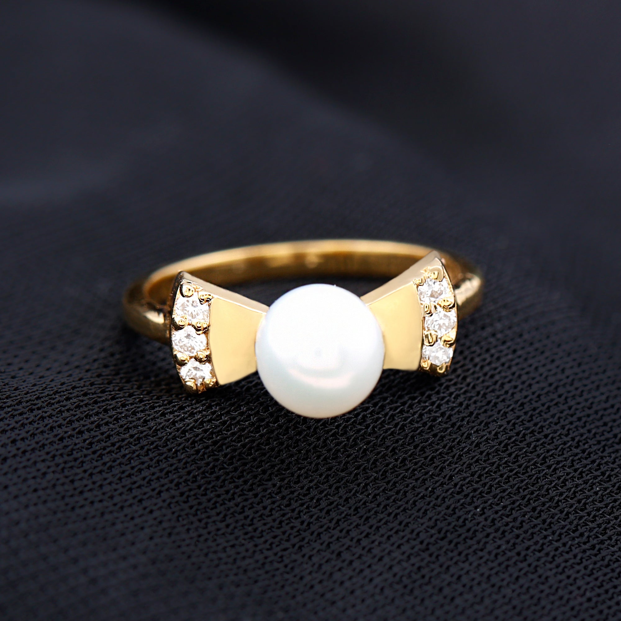 This Solitaire Ring is a stunning and feminine piece of jewelry that is perfect for any occasion. The ring features Round Shape Freshwater Pearl in Bead Set with sparkling Diamond gemstones studded over a delicate and intricate bow design. The contrast between the white pearl and the Diamond creates a stunning and timeless look that is sure to impress. The rings understated yet eye-catching design makes it a perfect gift for a loved one or a special treat for yourself.