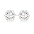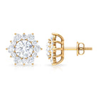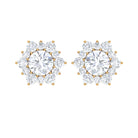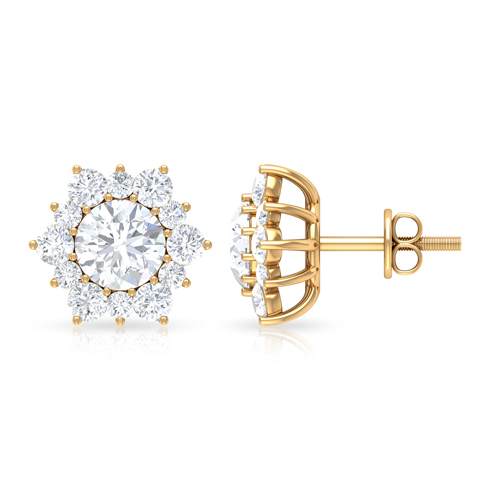 This Classic Stud Earrings embellished with Brilliant Round Cut Moissanite is set at the center in a Prong Setting encircled with a Halo of small Brilliant Round Cut Moissanites, crafted in a Solid Gold.