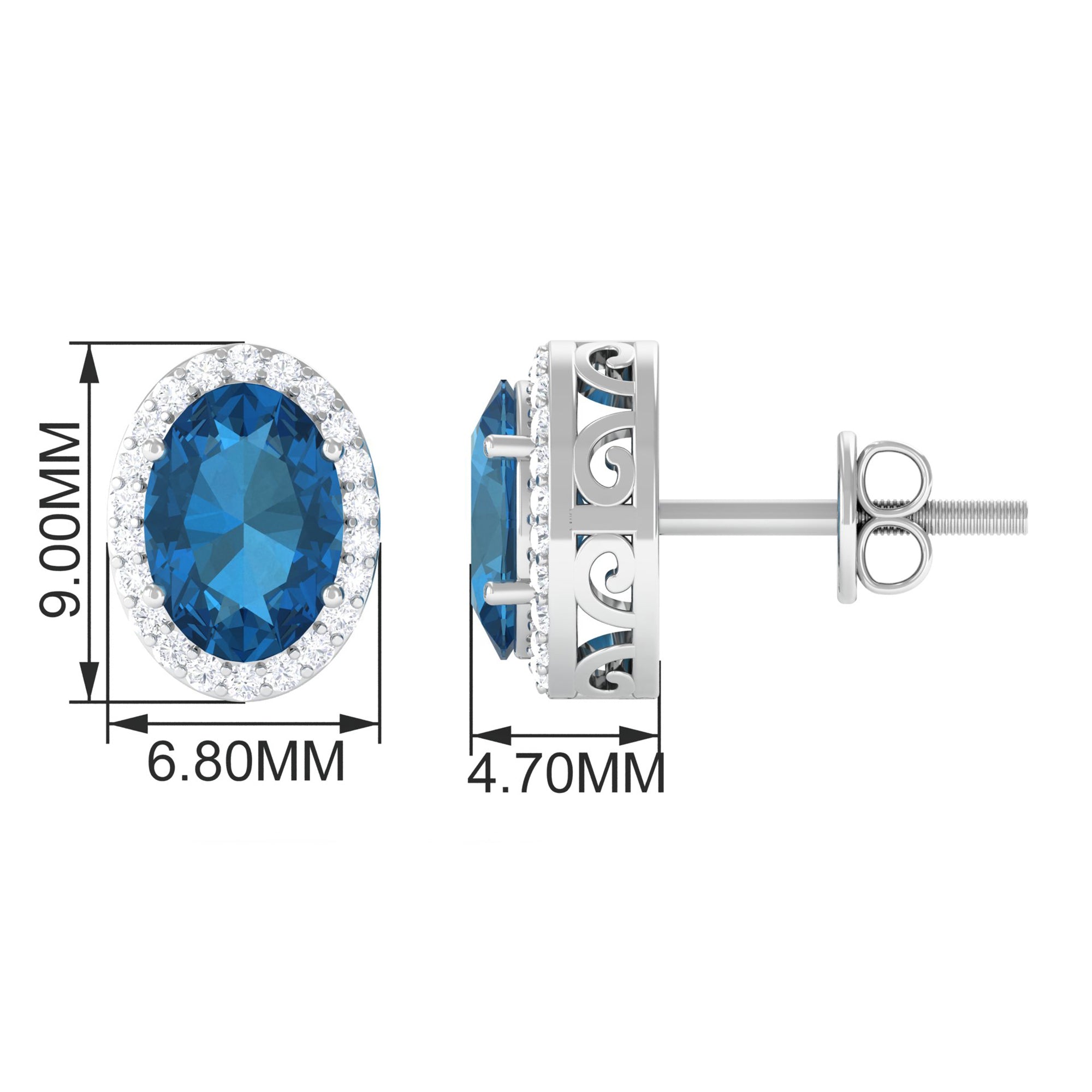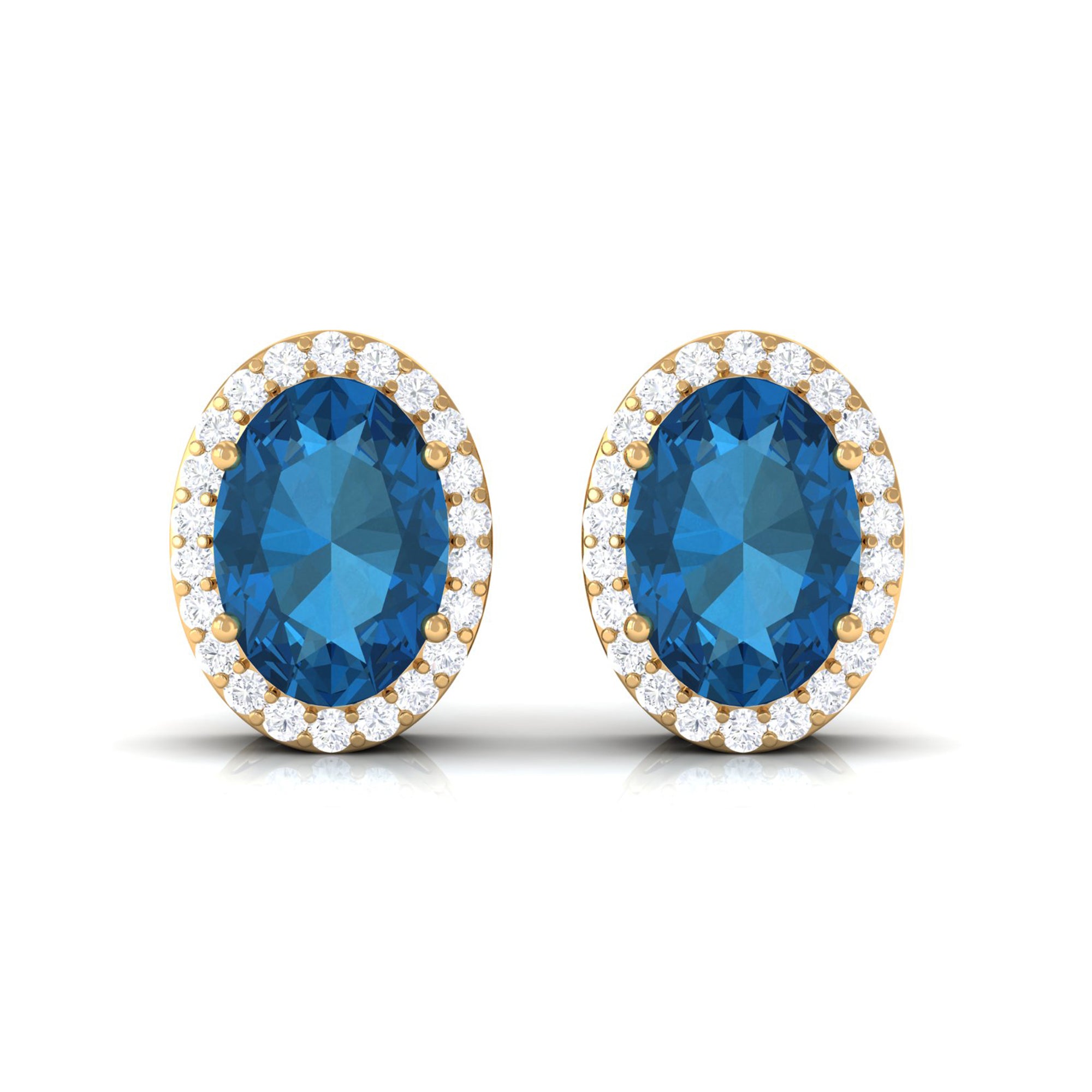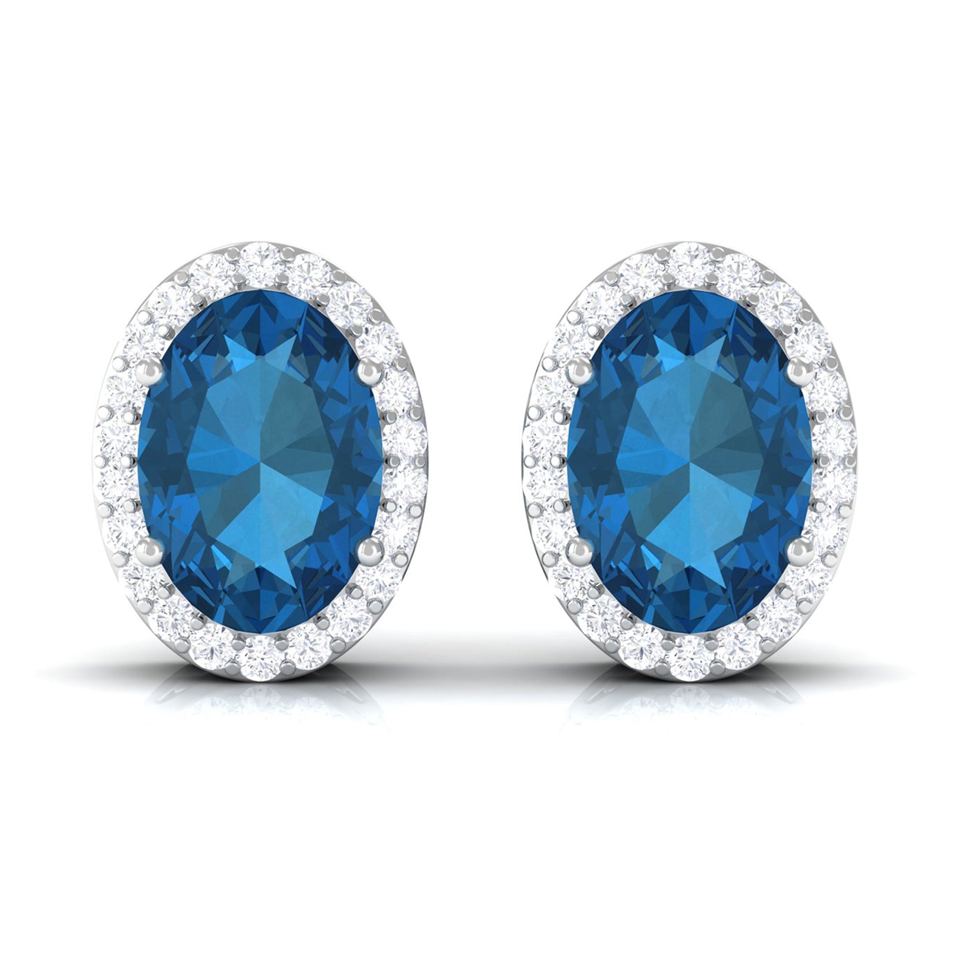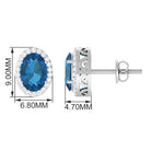 Adorn yourself in these Stud Earrings featuring 6X8 MM Oval Cut London Blue Topaz Solitaire adorned by a Round Brilliant Diamond Halo adding to the look of these Halo Stud Earrings.