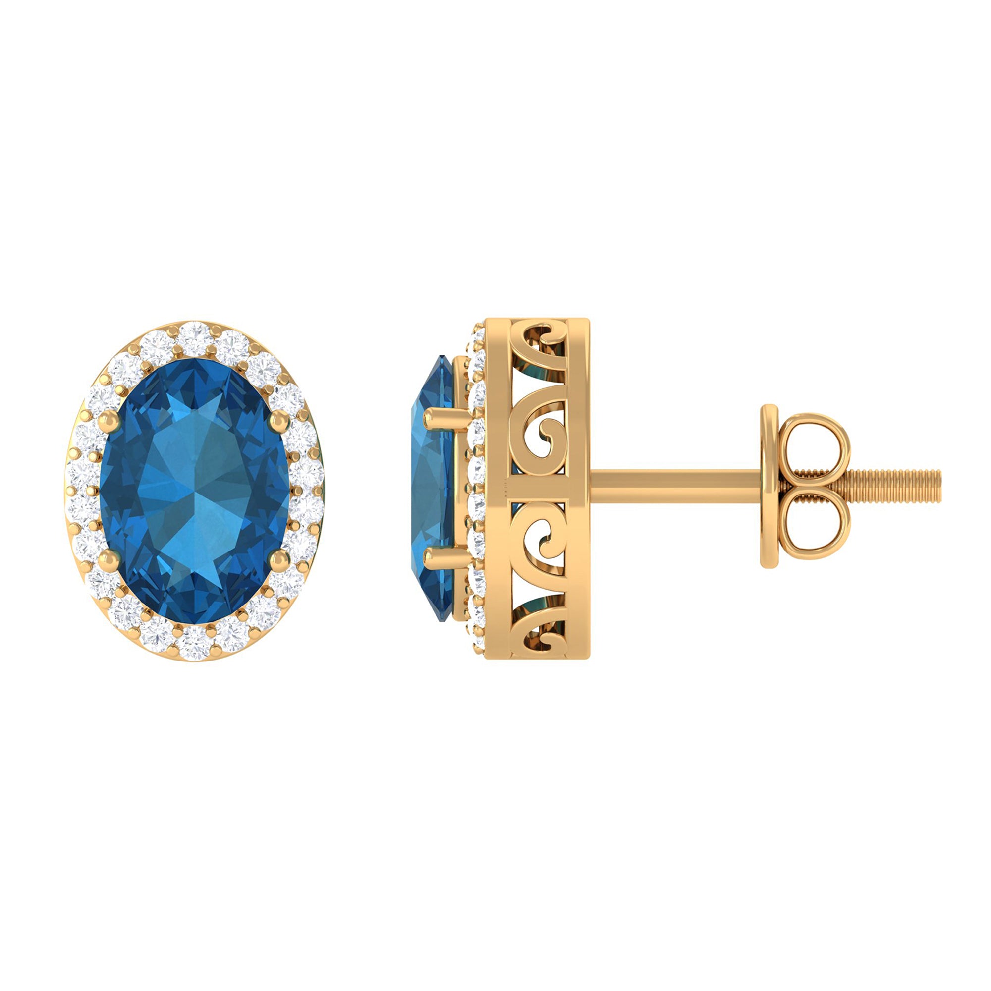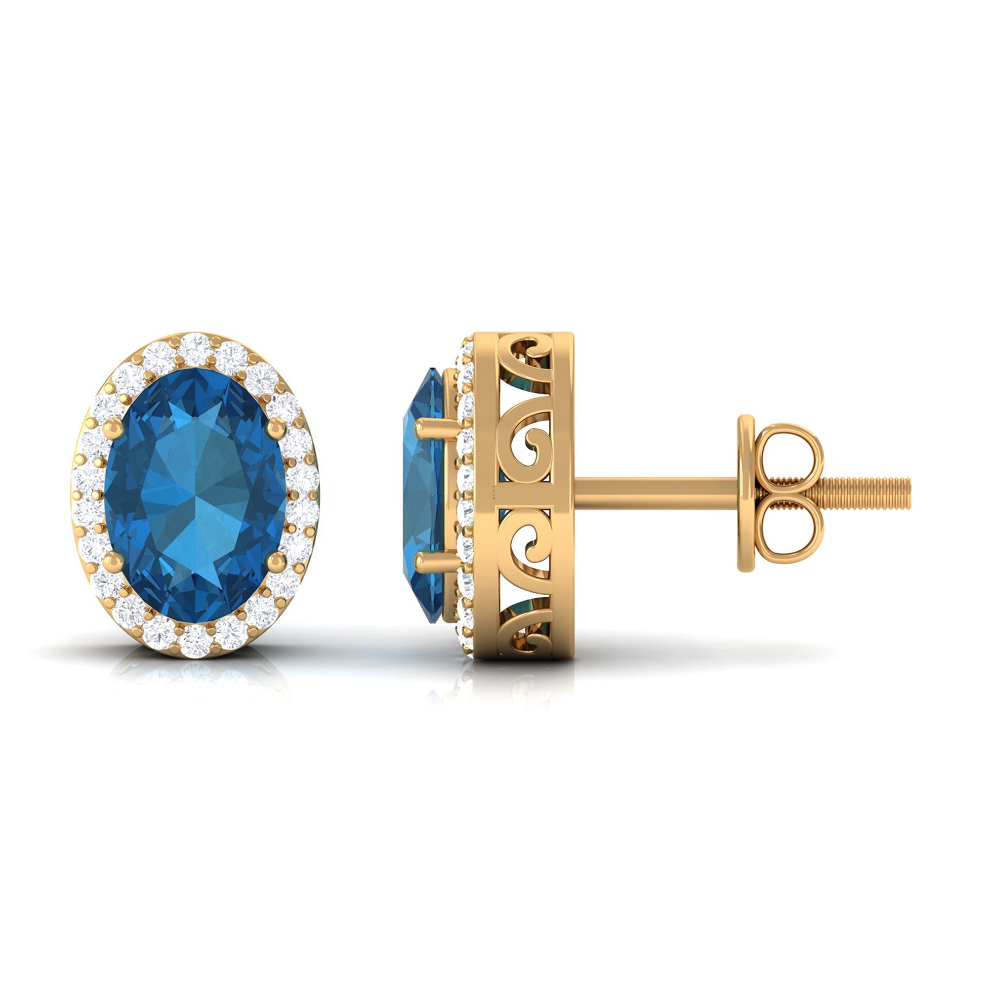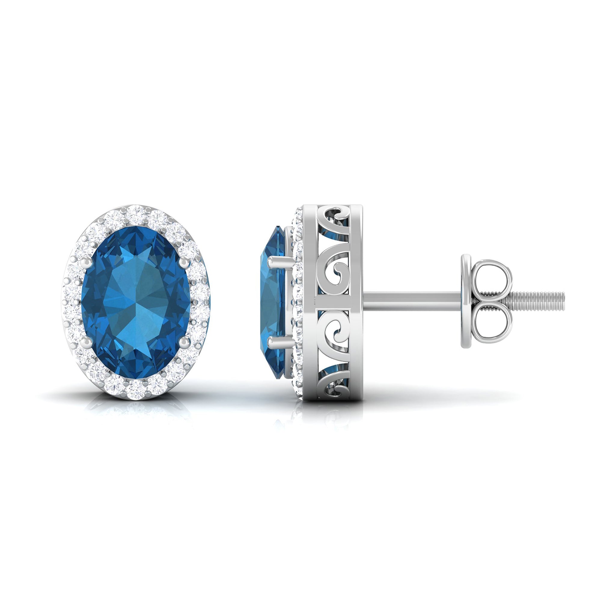 Adorn yourself in these Stud Earrings featuring 6X8 MM Oval Cut London Blue Topaz Solitaire adorned by a Round Brilliant Diamond Halo adding to the look of these Halo Stud Earrings.