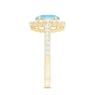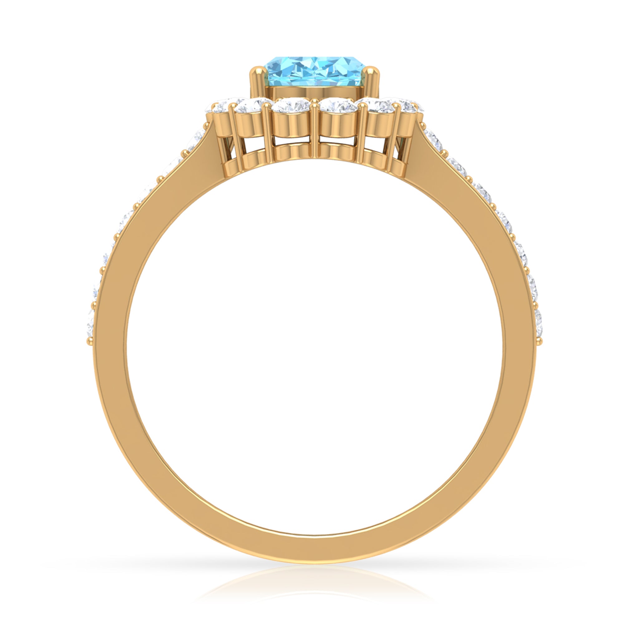 Unique Engagement Ring is the beautiful accessory engraved with Oval Cut Aquamarine as Solitaire and Round Shape Moissanite is set in Halo and Side Stone Setting. This lovely Engagement Ring makes a statement piece for women is composed of Solid Gold.